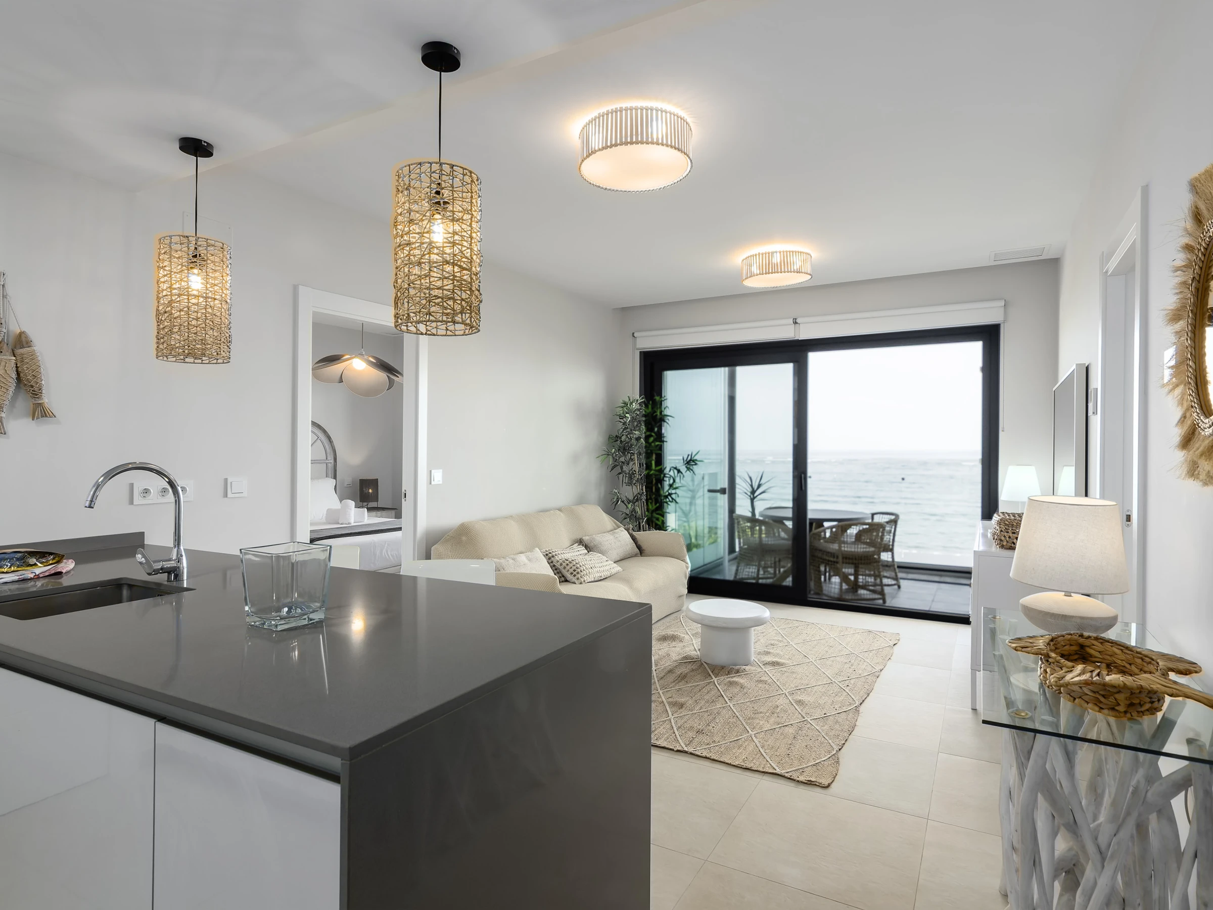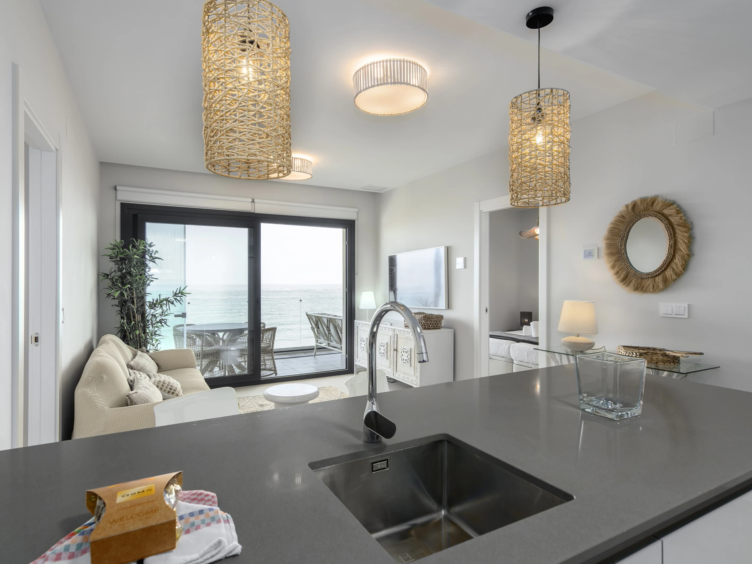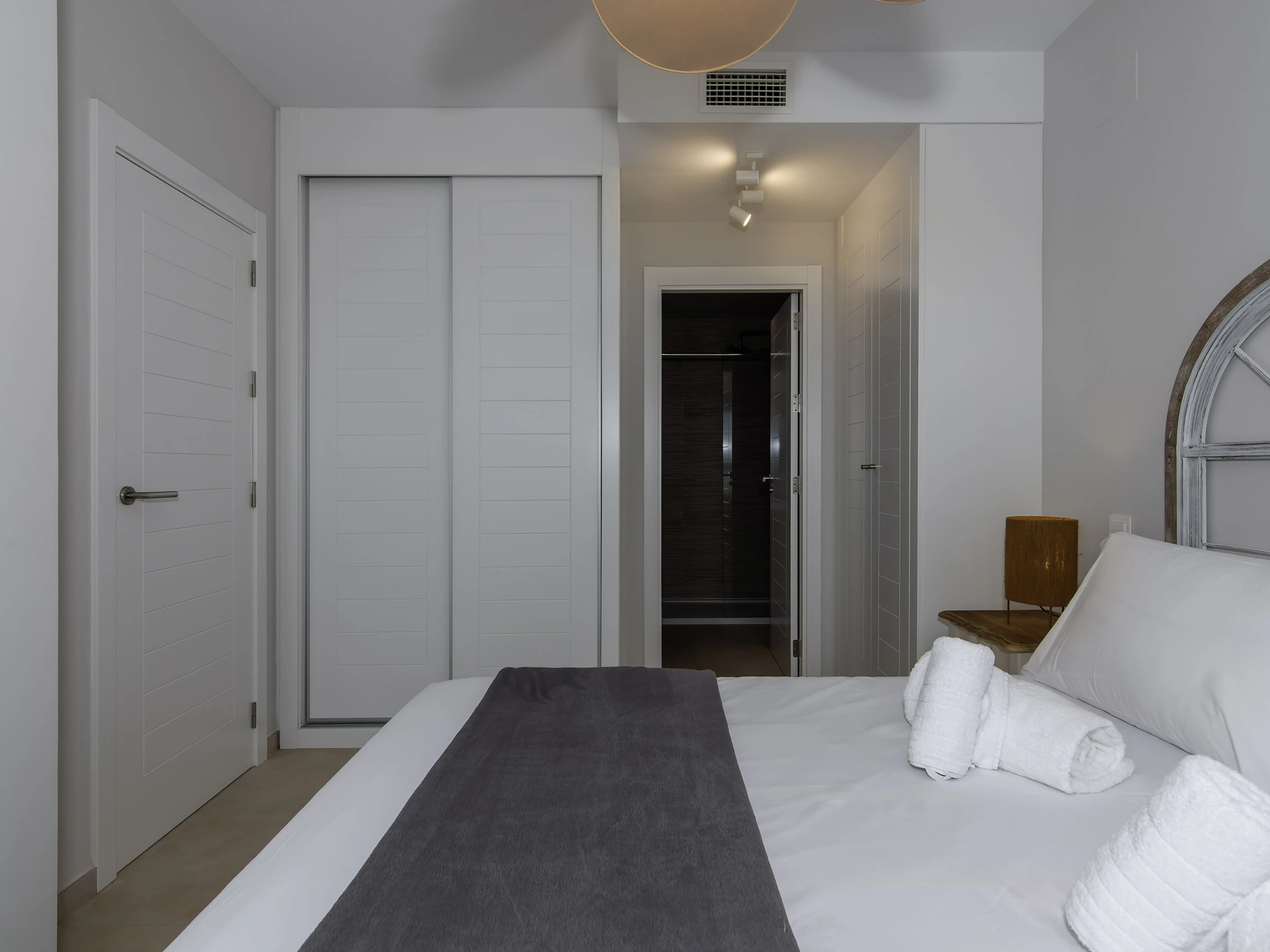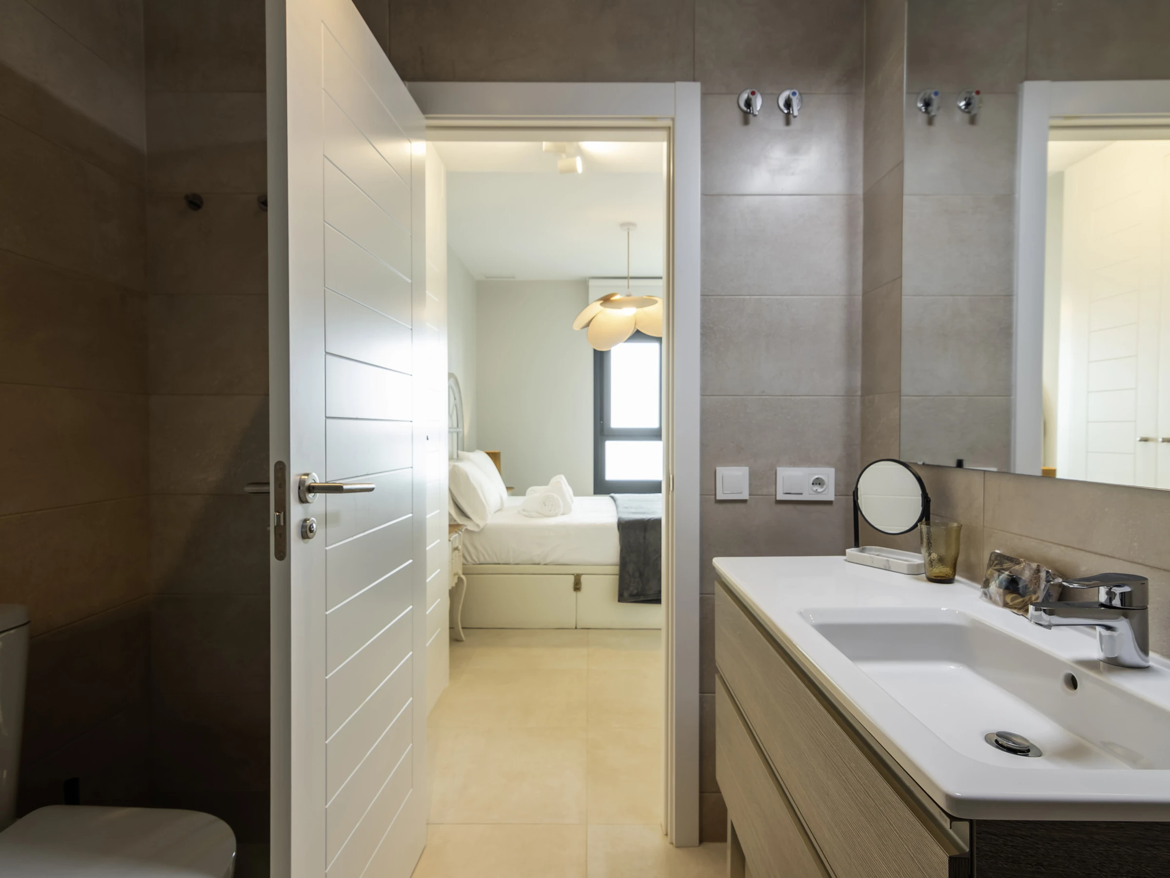El apartamento cuenta con dos dormitorios que pueden alojar hasta 4 personas cómodamente, con una distribución de una cama doble y dos individuales. Dispone de dos baños completos con ducha, lo que facilita la convivencia durante las vacaciones. La cocina americana está completamente equipada con electrodomésticos modernos como lavadora, lavavajillas, horno, microondas y máquina de café, permitiendo preparar comidas deliciosas.