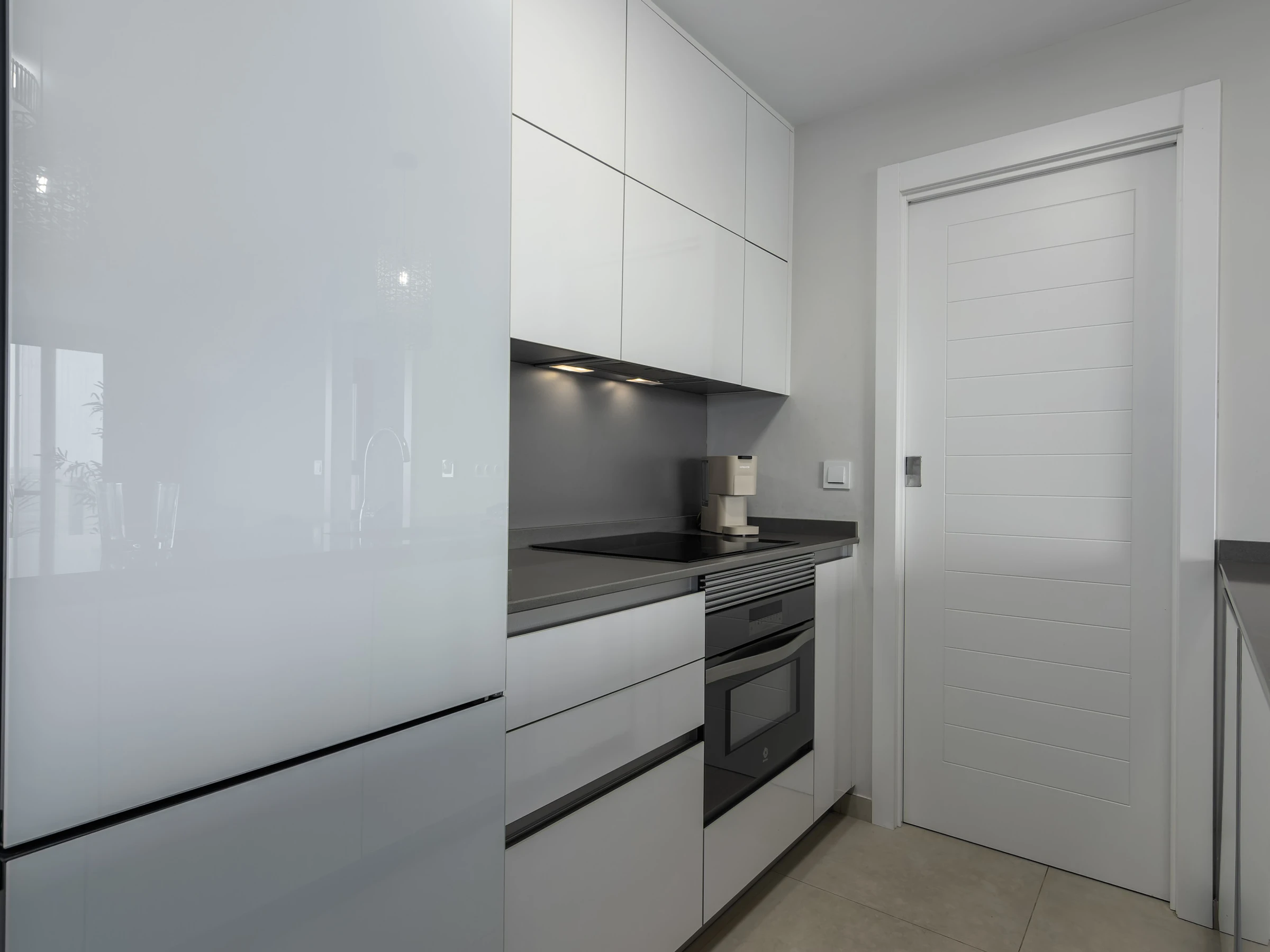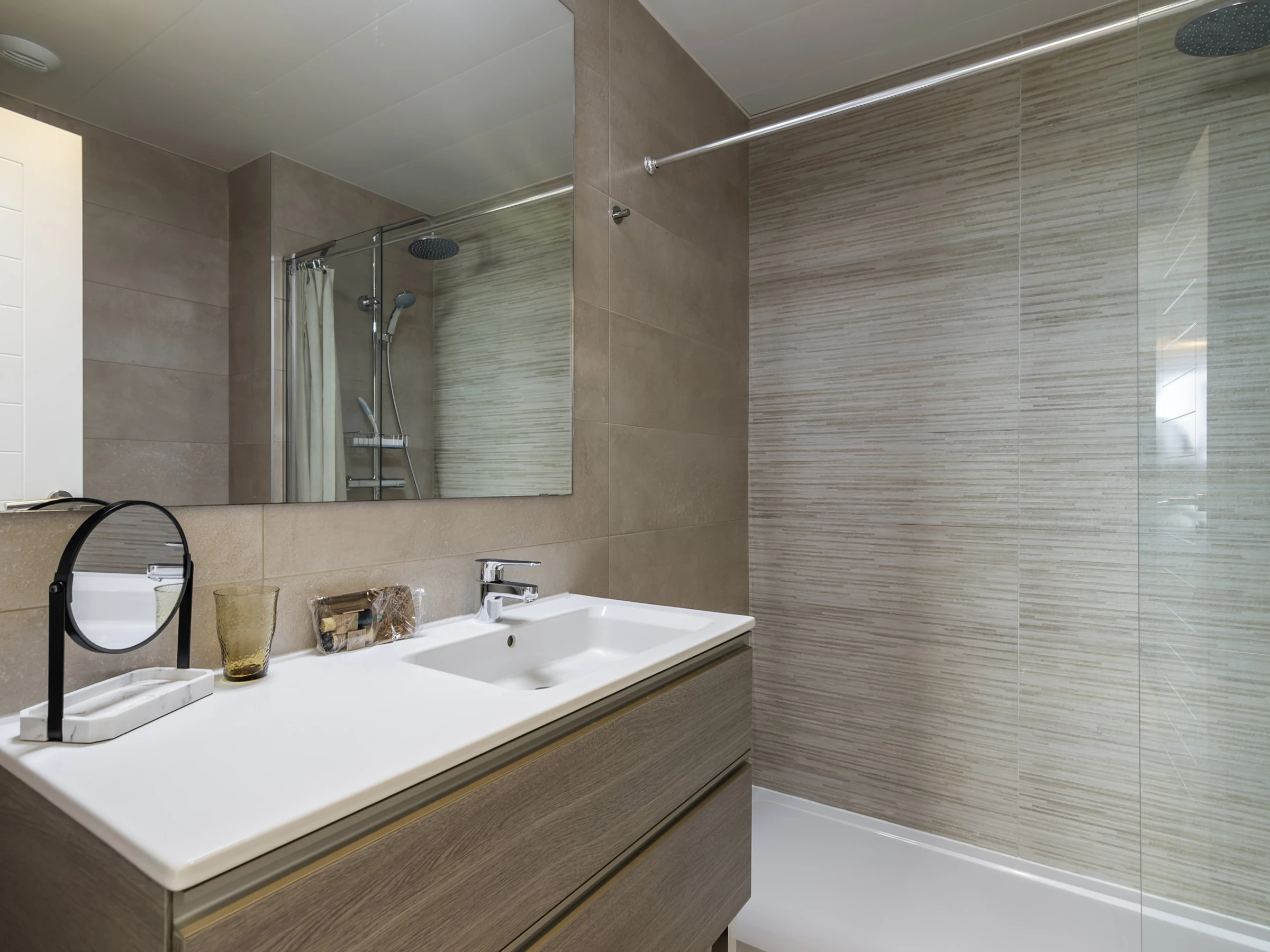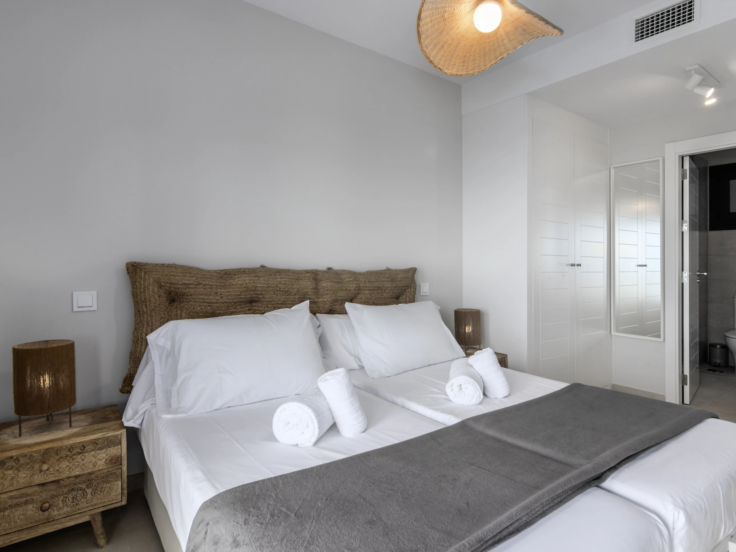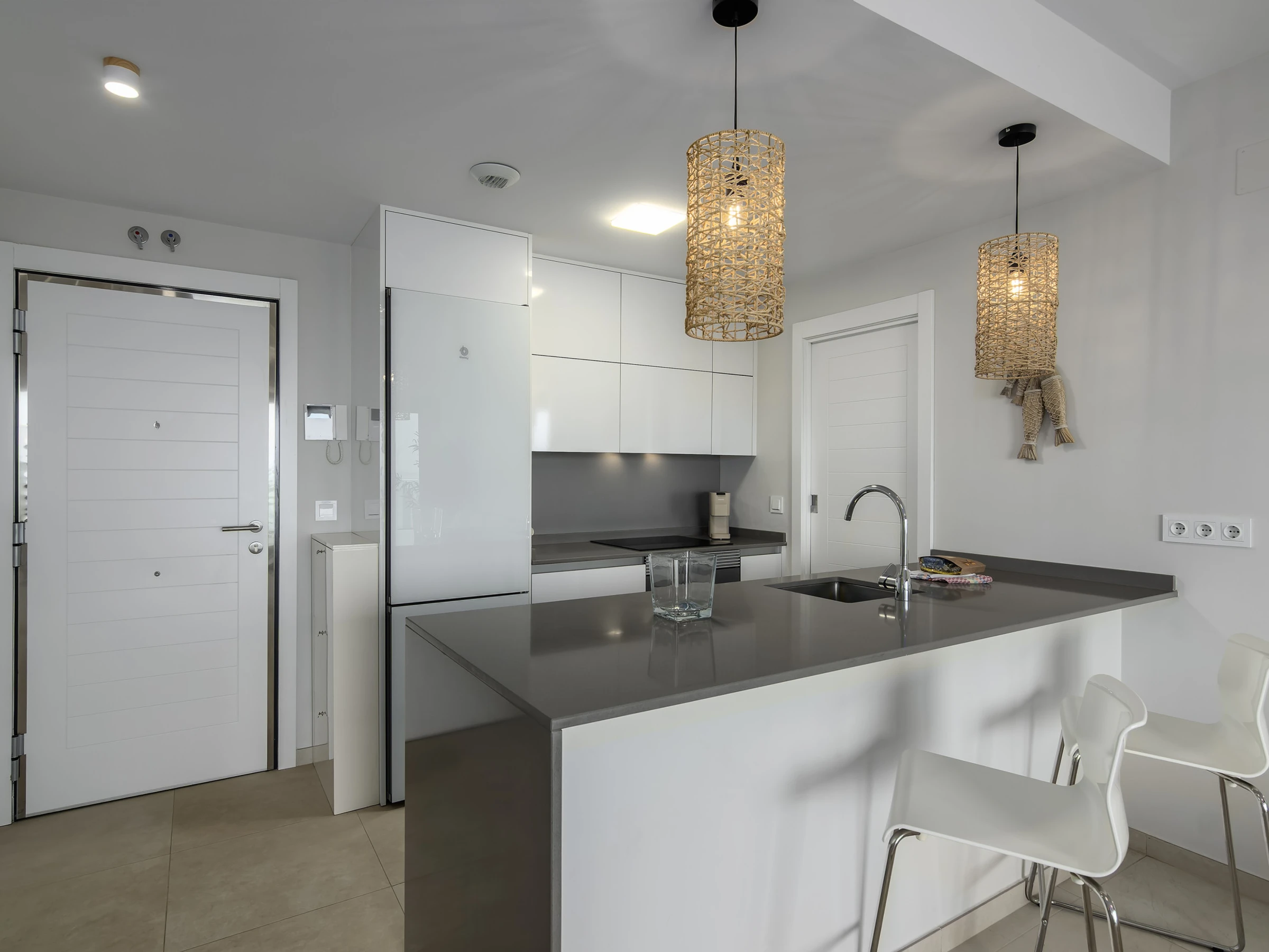 El apartamento cuenta con dos dormitorios que pueden alojar hasta 4 personas cómodamente, con una distribución de una cama doble y dos individuales. Dispone de dos baños completos con ducha, lo que facilita la convivencia durante las vacaciones. La cocina americana está completamente equipada con electrodomésticos modernos como lavadora, lavavajillas, horno, microondas y máquina de café, permitiendo preparar comidas deliciosas.