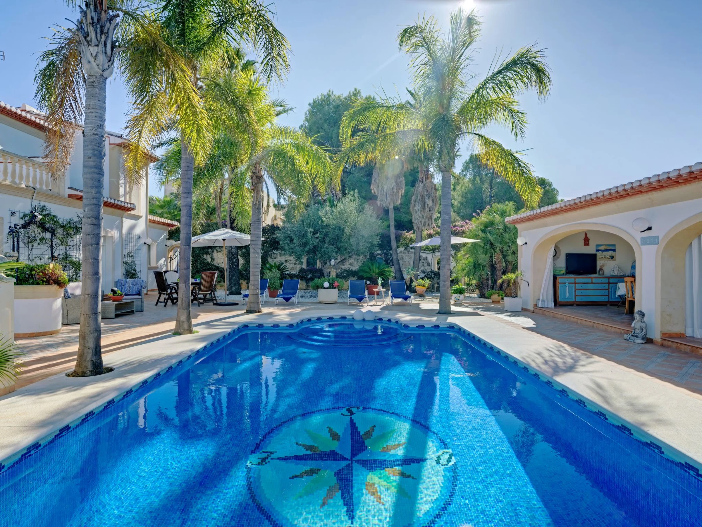 "Villa Carpe Diem", villa 5 estancias 250 m2 en 3 plantas. Espacioso y luminoso, con mobiliario muy confortable y de estilo: salón-comedor con TV satélite, aire acondicionado y bomba de calor, caliente. Salida a la terraza-jardín, a la piscina. 1 dorm. con 2 camas (90 cm, 200 cm de longitud), ducha/WC y ventilador. 1 dorm. con 2 camas (90 cm, 200 cm de longitud), ventilador. Cocina abierta (horno, lavavajillas, 4 placas de vitrocerámica, tostadora, microondas, congelador, cafetera eléctrica). Ducha/WC. En planta inferior: 1 dorm. con 1 cama de matrimonio (135 cm, 200 cm de longitud), ventilador. Ducha/WC. Planta superior: 1 dorm. con 1 cama doble (2 x 90 cm, 200 cm de longitud), ducha/bidet/WC, doble lavabo, TV satélite, aire acondicionado y bomba de calor, caliente. Salida al balcón, a la terraza. Terraza grande 200 m2. Muebles de terraza, barbacoa, tumbonas, porche, rincón para sentarse. Vista muy bonita al mar, a las montañas y al valle. El alojamiento dispone de: lavadora, secadora, plancha, trona, cuna, secador de pelo. Internet (Wifi, gratis). Plaza de aparcamiento. Permitido máximo 1 mascota / perro. [hidden] // Reg. Nr.: ESFCTU00000307100021696500000000000000000[hidden]5
