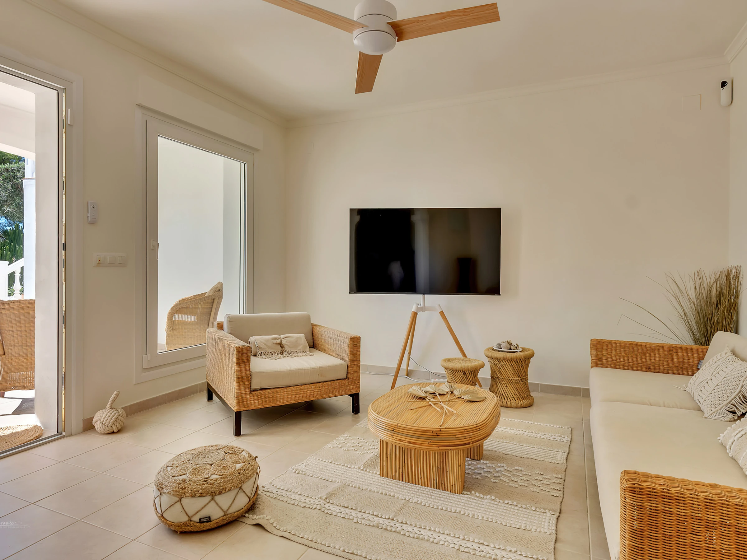 En el interior, dos salones elegantes crean el ambiente para momentos de descanso: uno con televisión para noches de películas, y el otro con una acogedora chimenea de gas y vistas al mar. Dos áreas de comedor permiten alternar entre el refinado espacio interior y la naya acristalada con vista a la piscina. La cocina bien equipada y la sala de servicio separada (con lavadora y secadora) mantienen todo práctico.