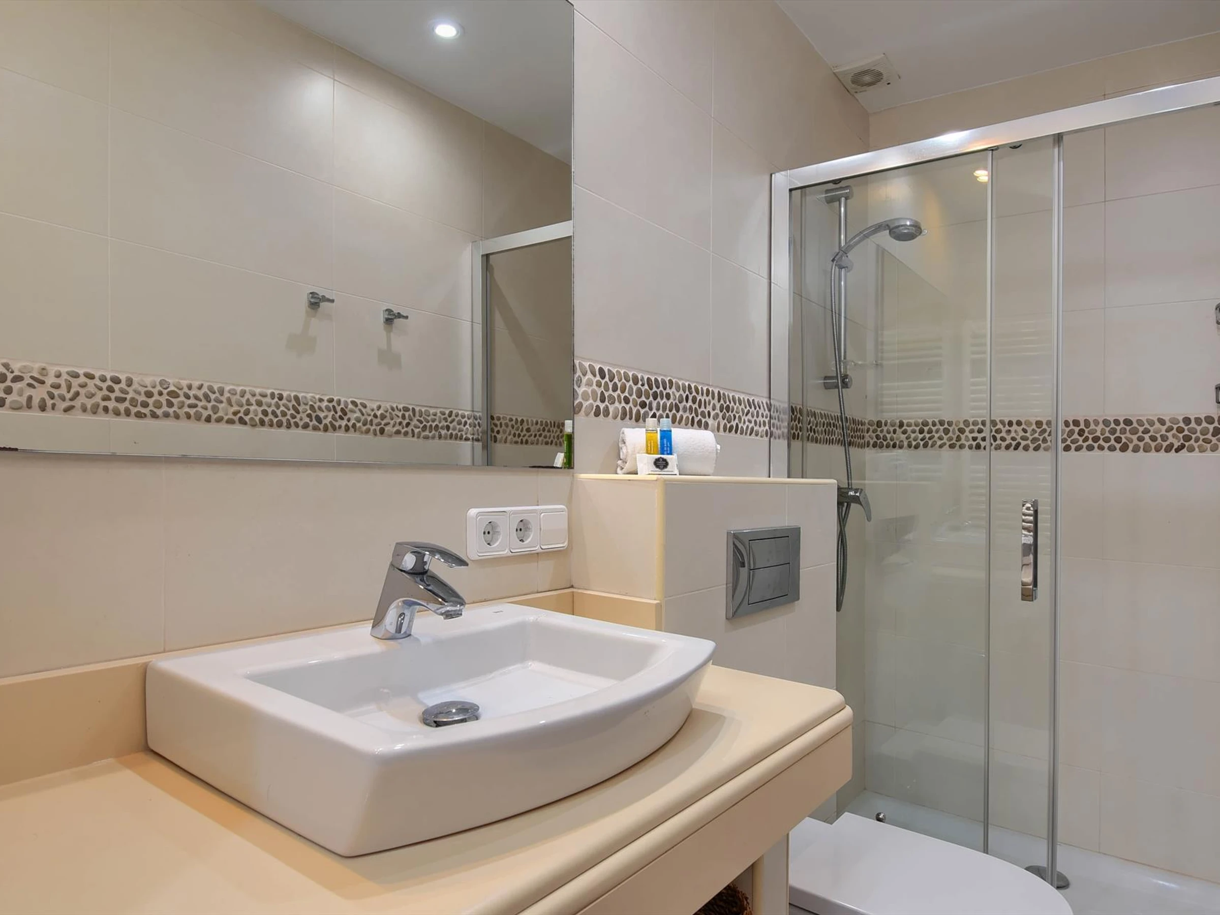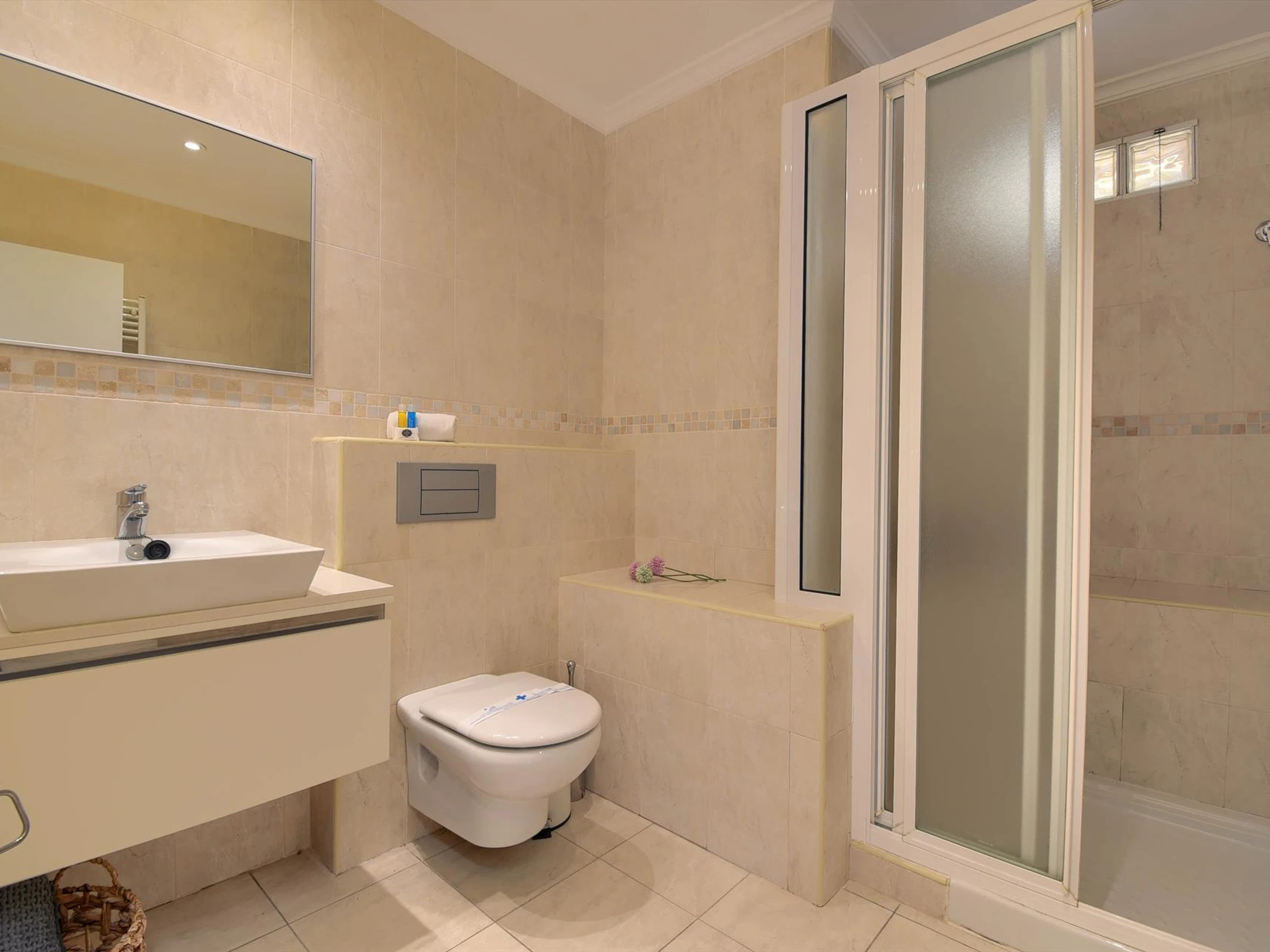 Interior de la casa de huéspedesdormitorio con cama doblecuarto de baño con lavabo individual, ducha y WC