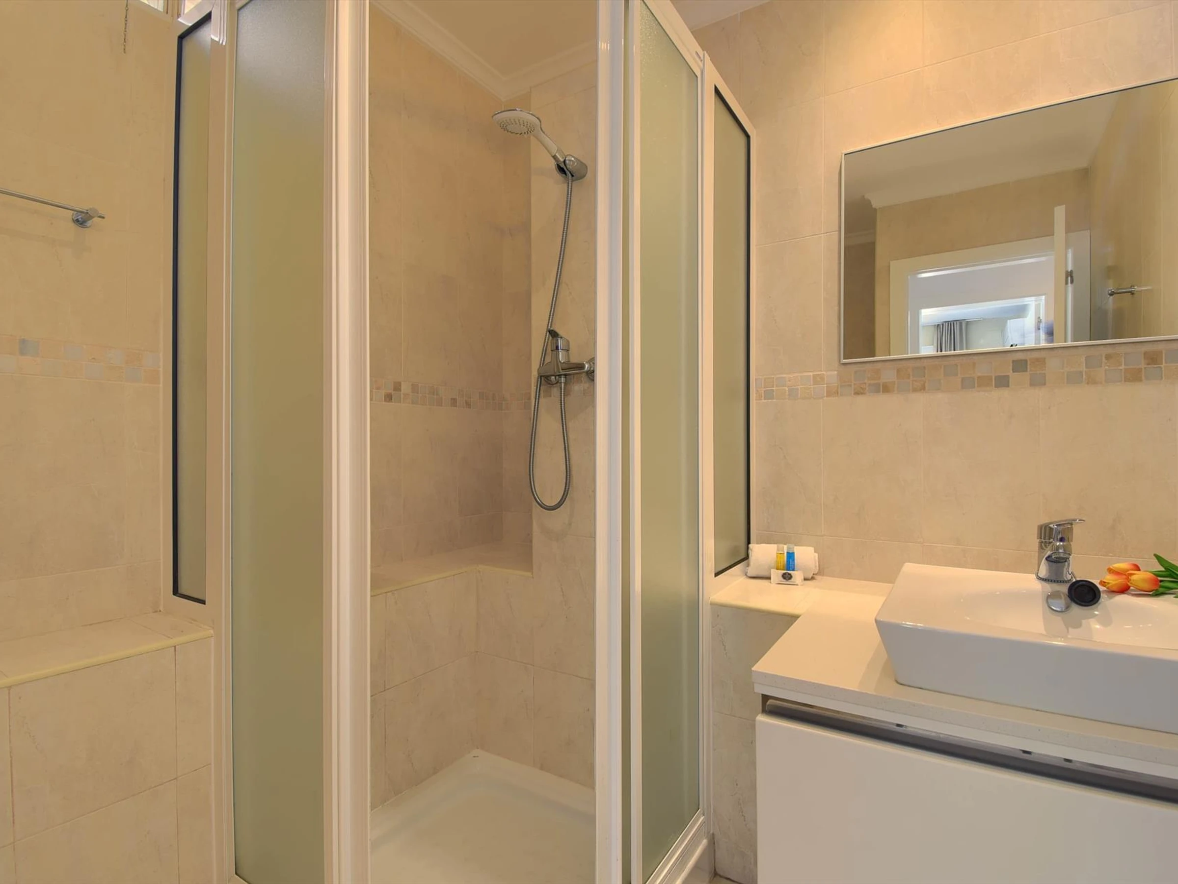 Dormitorios y baños del alojamiento principal.dormitorio con aire acondicionado, cama king size y televisión2 habitaciones con aire acondicionado, cada una con cama doble.cuarto de baño con doble lavabo, ducha y WC2 baños cada uno con lavabo individual, ducha y WC.