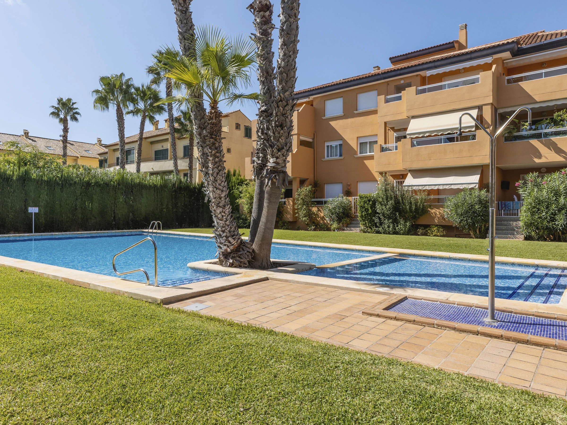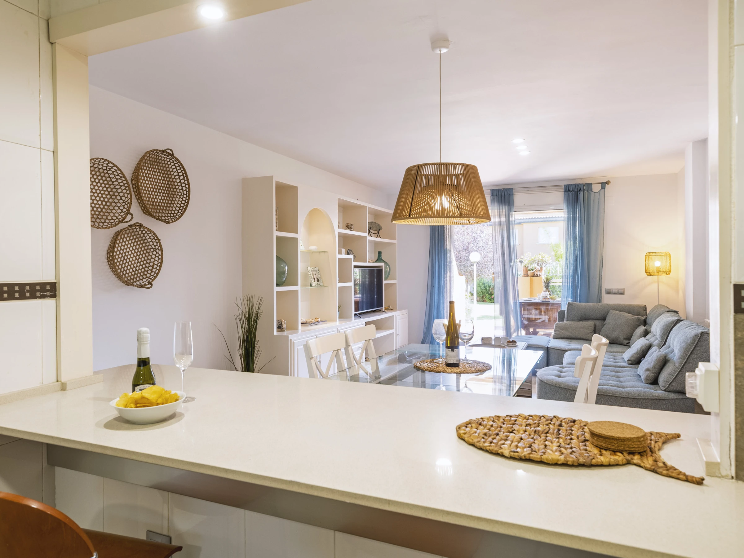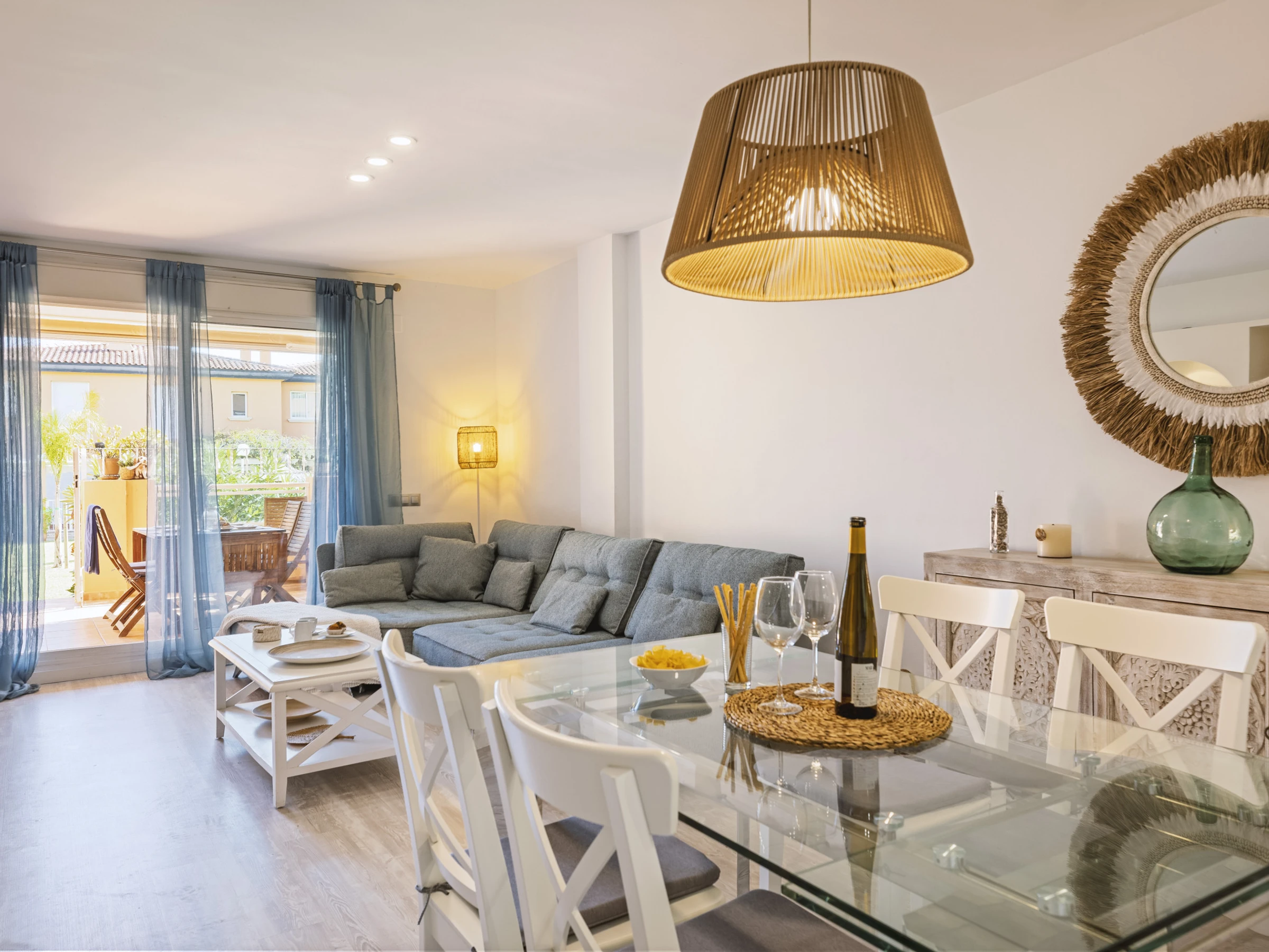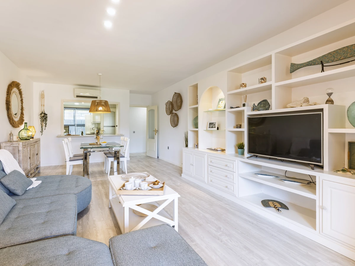 Descubre Gaia, un apartamento luminoso y elegante en la planta baja del tranquilo complejo Villas de Bolonia. Rodeado de exuberantes jardines y una piscina comunitaria reluciente (además de una piscina infantil), es el lugar perfecto para escapadas familiares o un retiro sereno.