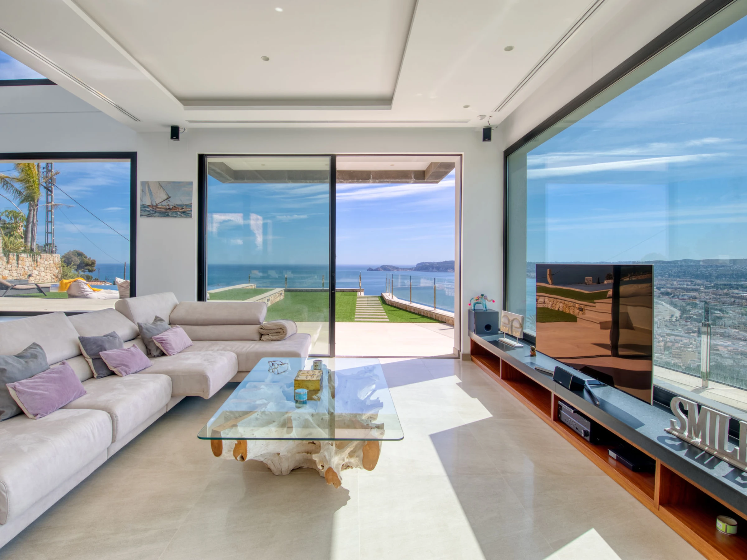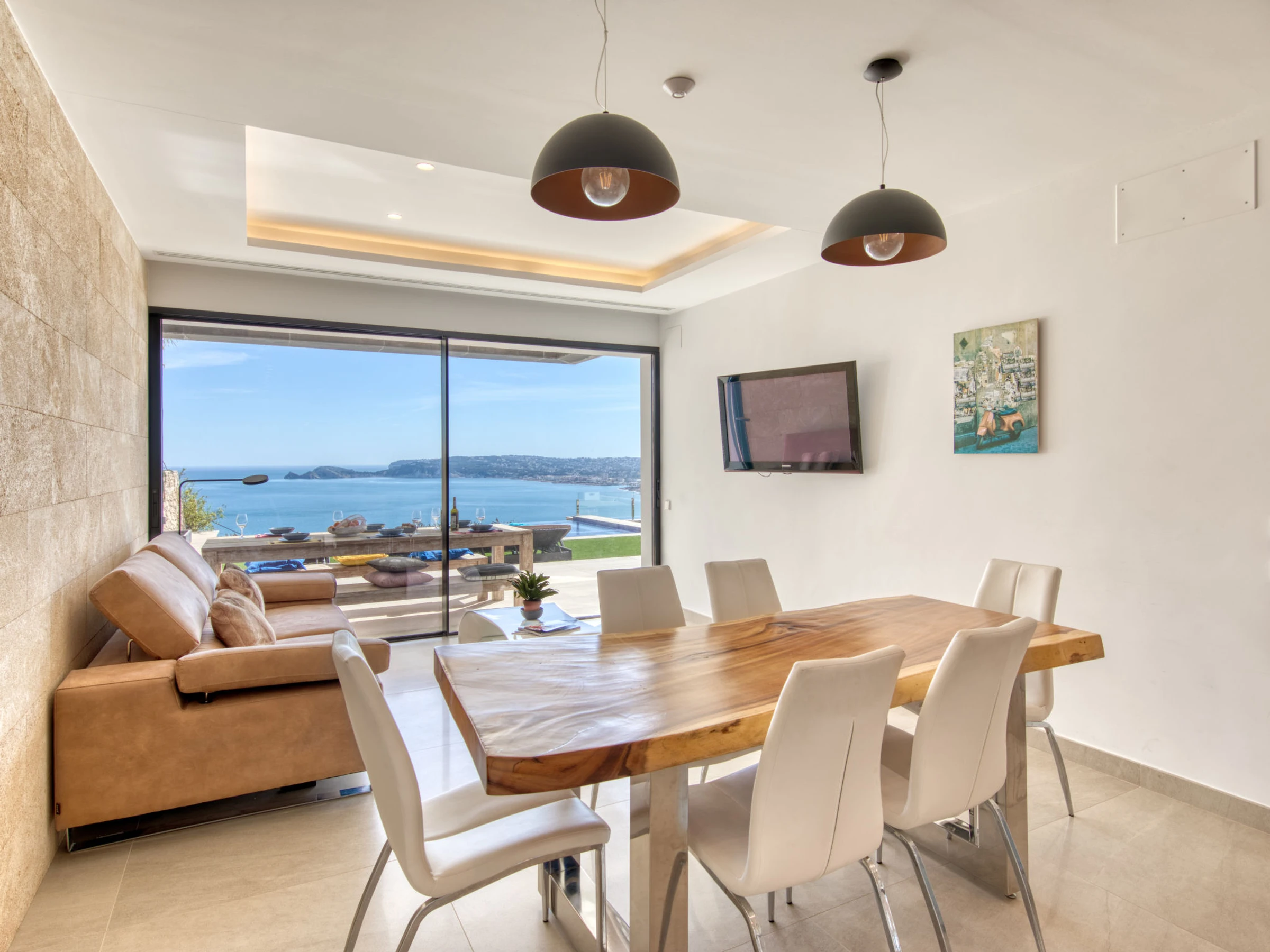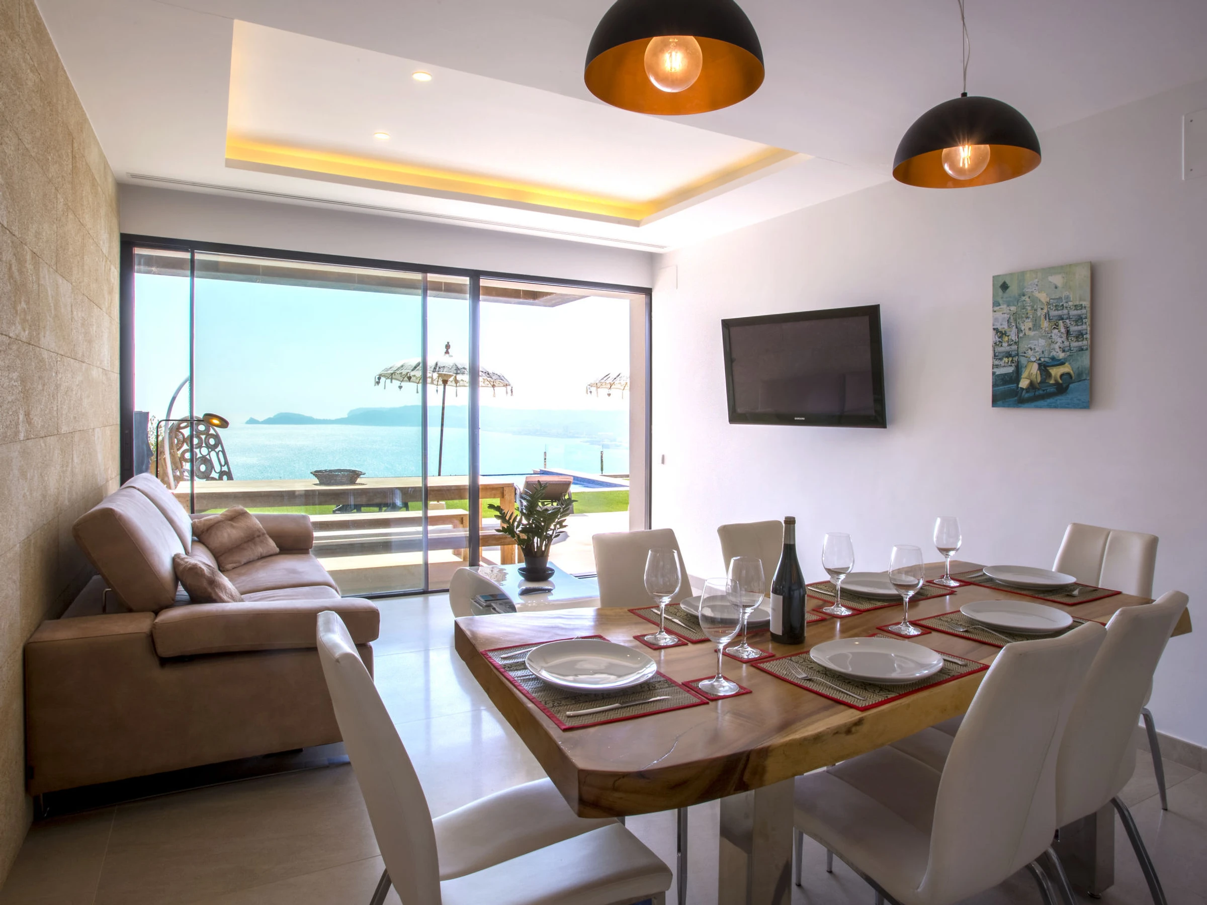 "Villa Bali Infinity", villa 7 estancias 650 m2 en 2 plantas. Espacioso y luminoso, con mobiliario muy moderno y lujoso: salón-comedor con chimenea, mesa de comedor, TV satélite y TV digital. Grande cocina (horno, lavavajillas, 4 Placas de inducción, tostadora, hervidor de agua eléctrico, microondas, congelador, cafetera eléctrica, isla de cocina). Ducha/WC. En planta inferior: 1 dorm. con 1 cama de matrimonio (160 cm, 200 cm de longitud), ducha/WC. 1 dorm. con 1 cama de matrimonio (160 cm, 200 cm de longitud), ducha/WC. Planta superior: 1 dorm. con 1 cama de matrimonio (180 cm, 200 cm de longitud), ducha/WC. 1 dorm. con 1 cama de matrimonio (160 cm, 200 cm de longitud), ducha/WC. 1 dorm. con 1 cama de matrimonio (160 cm, 200 cm de longitud), ducha/WC. Terraza grande. Muebles de terraza, barbacoa, tumbonas (3). Vista panorámica espléndida al mar y a la localidad. El alojamiento dispone de: lavadora, secadora, plancha, secador de pelo. Internet (Wifi, gratis). Junto a la casa. En la planta inferior hay ademas un gimnasio con bañera de hidromasaje y WC. Garaje para 3 coches. [hidden] // Reg. Nr.: ESFCTU0000030710009718020000000000000CV-VUT0484887-A6