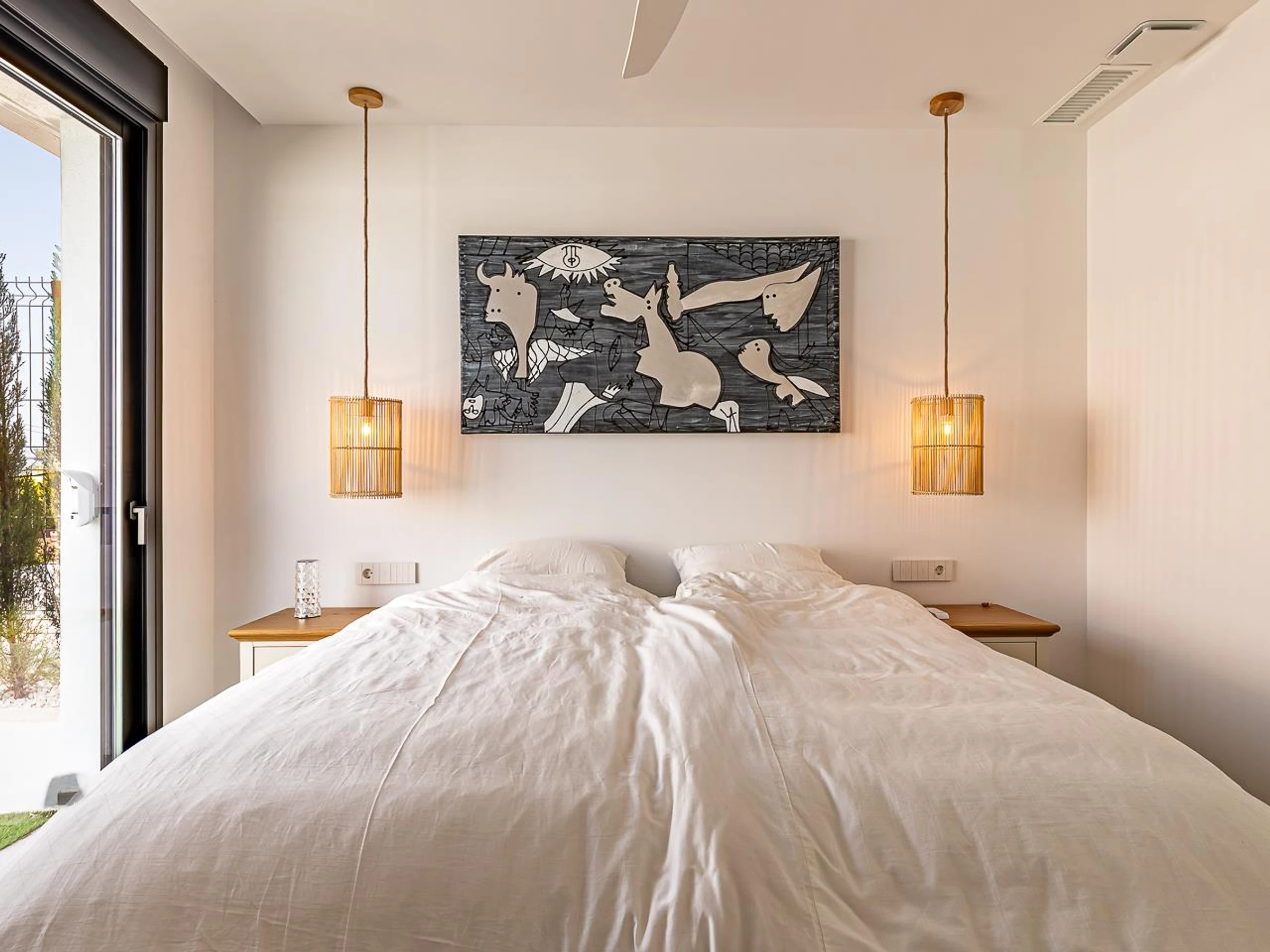 * dormitorio con cama king size (de 210 por 180 cm), ventilador y baño en