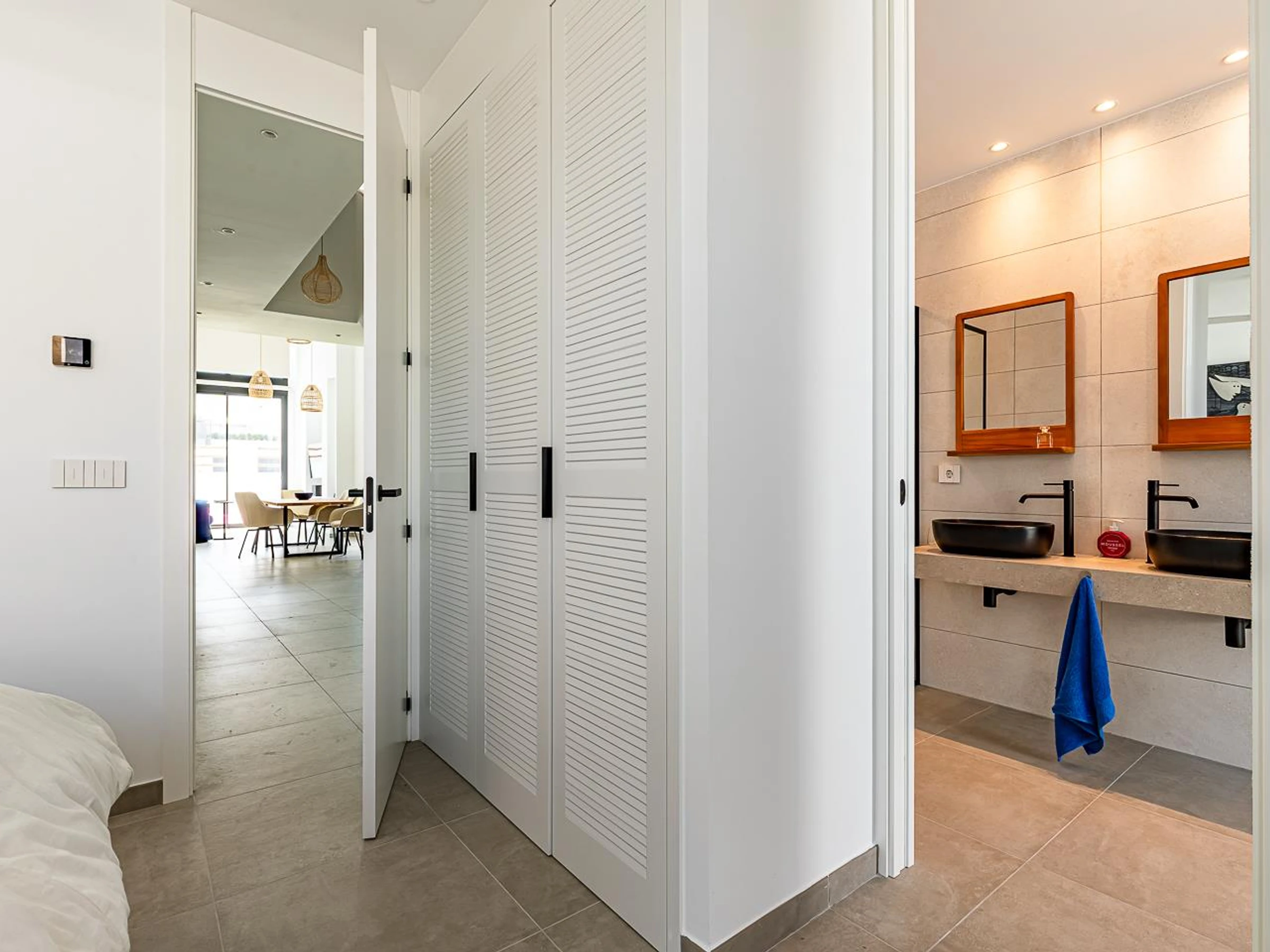 * baño en suite con lavabo doble, ducha, inodoro y secador de pelo
