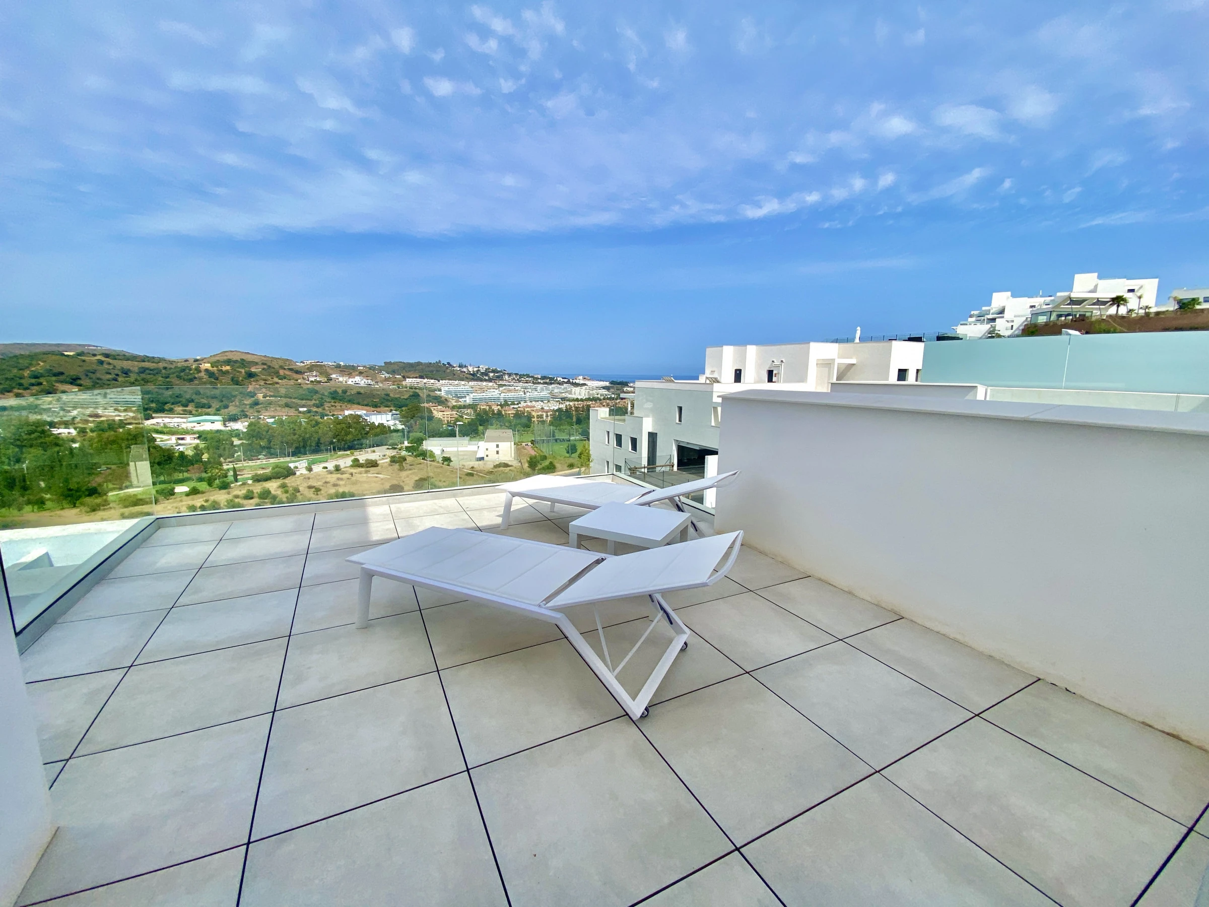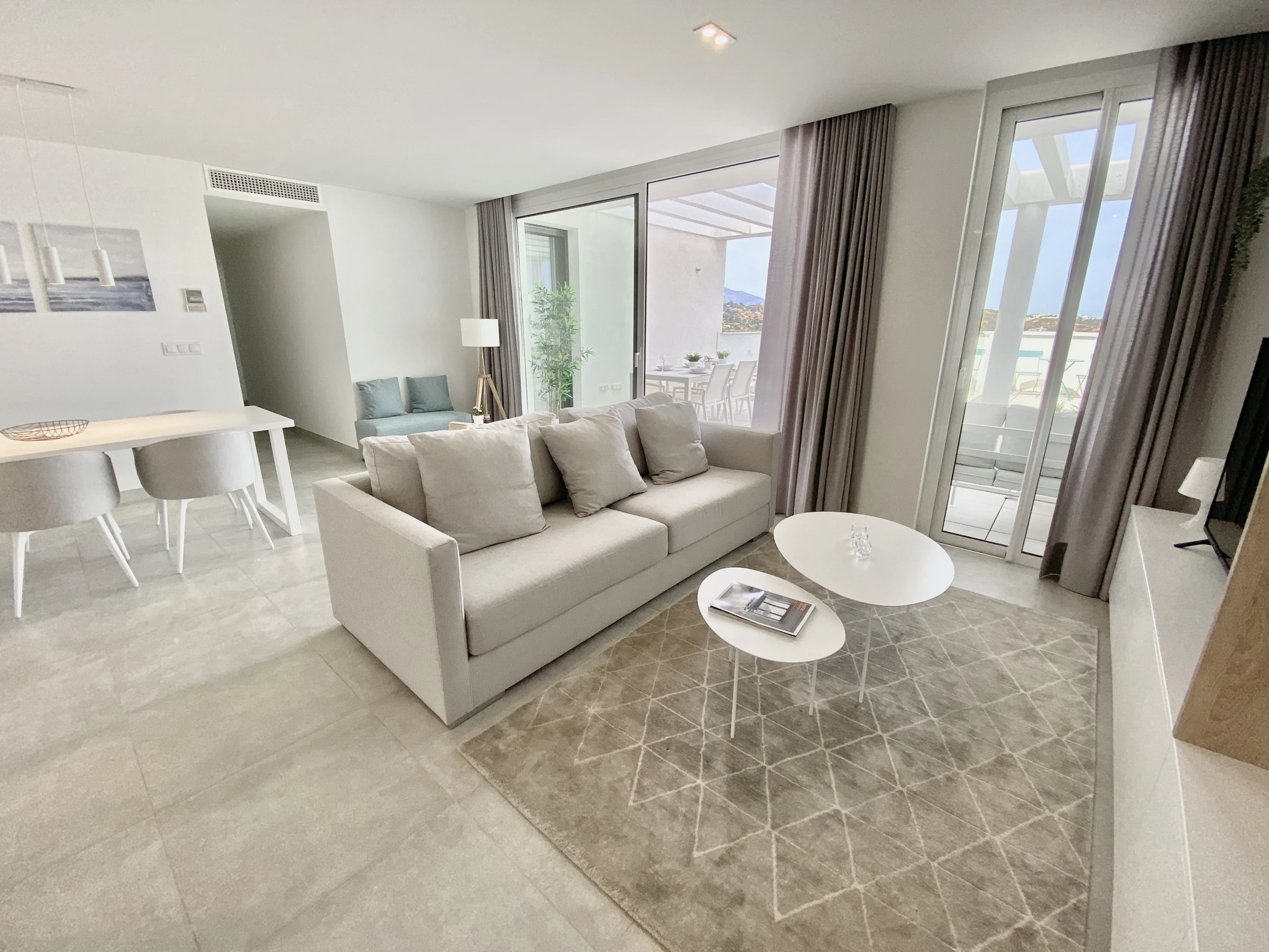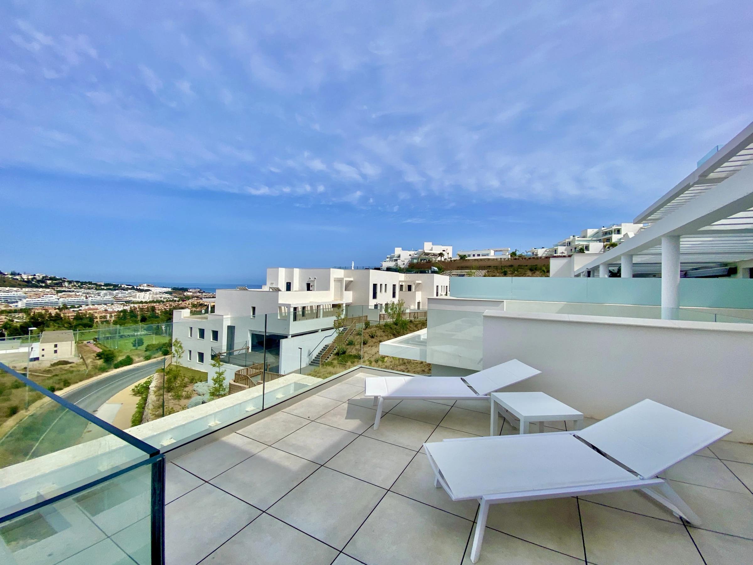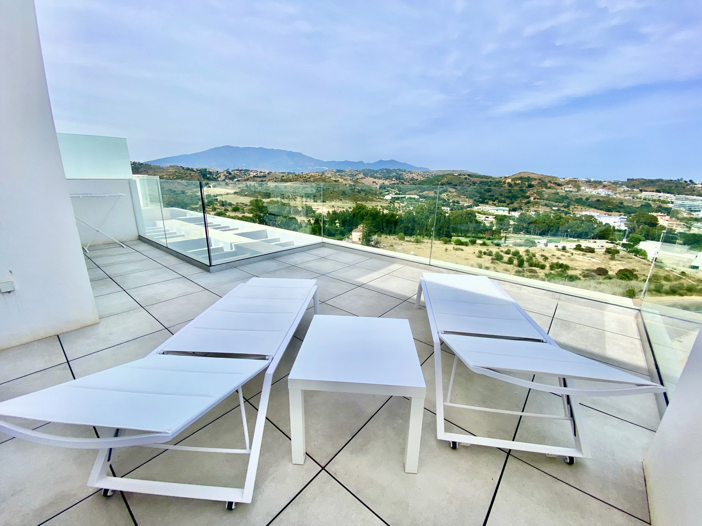 La sala de estar abierta da acceso directo a la terraza que ofrece una agradable sala de estar para relajarse y un comedor, con vistas a la Sierra de Mijas y al mar. También dispondrás de una segunda terraza soleada con dos tumbonas para trabajar tranquilamente en tu bronceado.