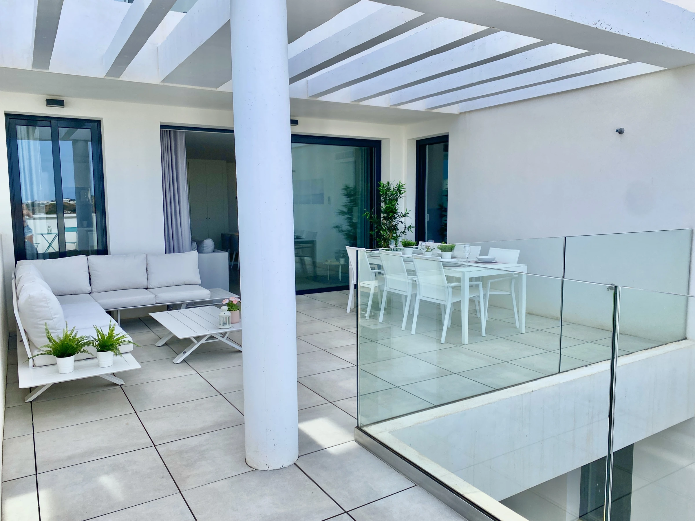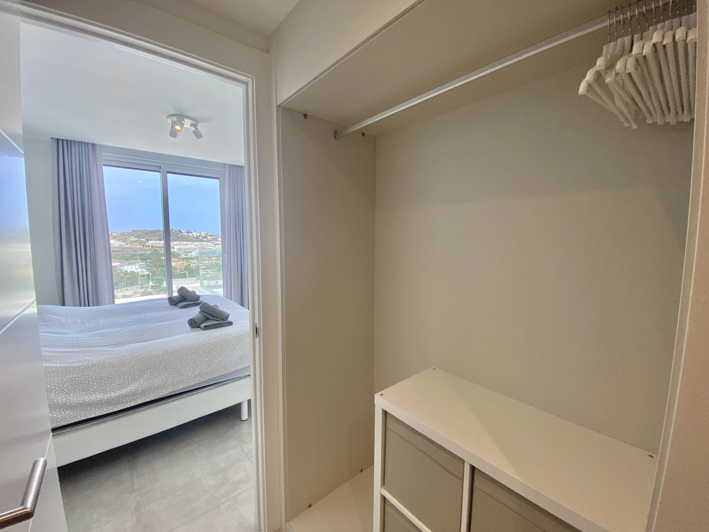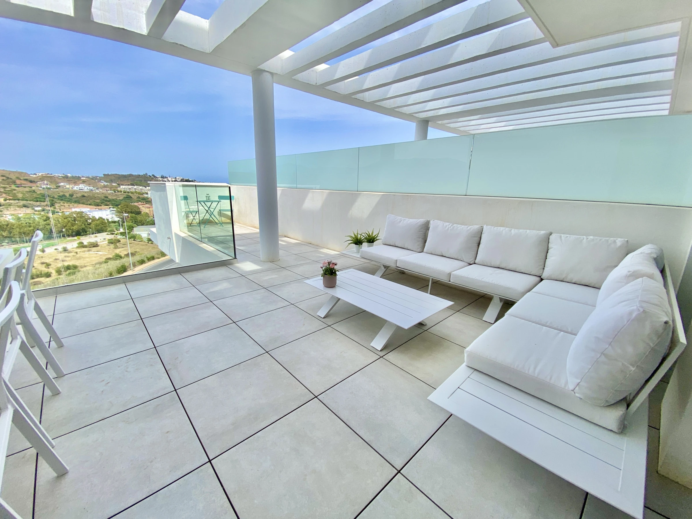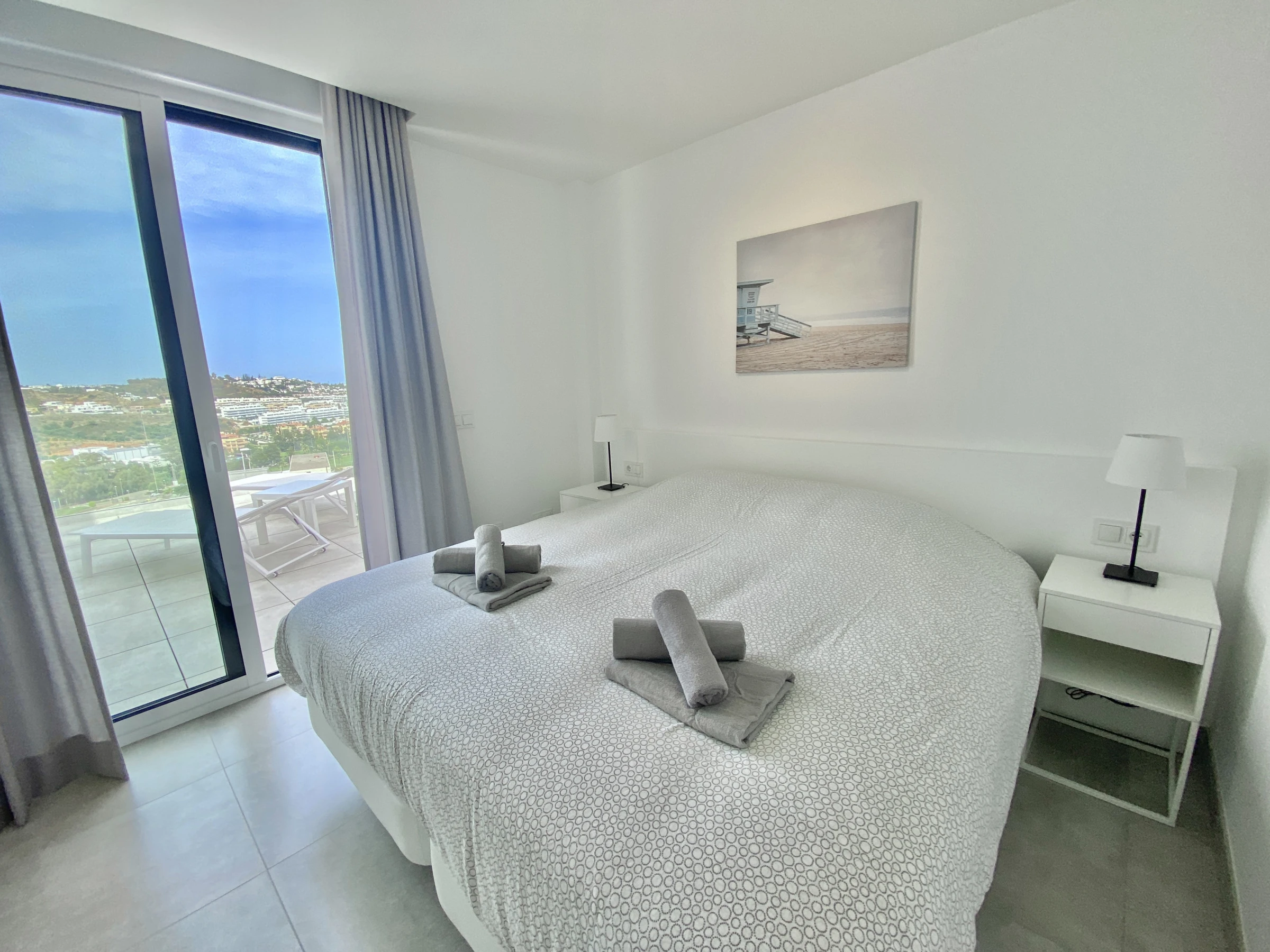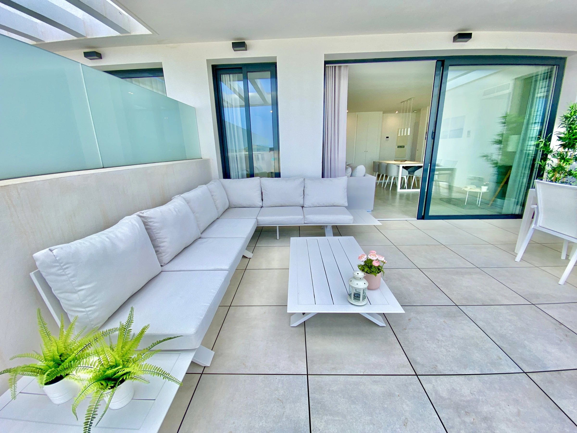 La sala de estar abierta da acceso directo a la terraza que ofrece una agradable sala de estar para relajarse y un comedor, con vistas a la Sierra de Mijas y al mar. También dispondrás de una segunda terraza soleada con dos tumbonas para trabajar tranquilamente en tu bronceado.