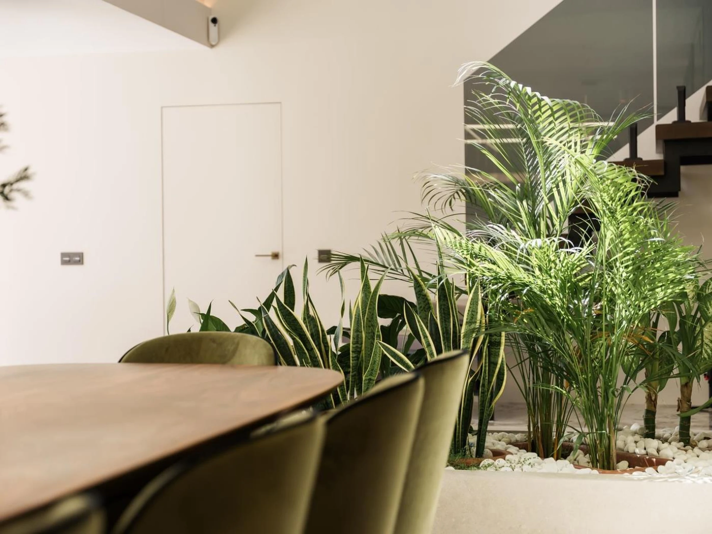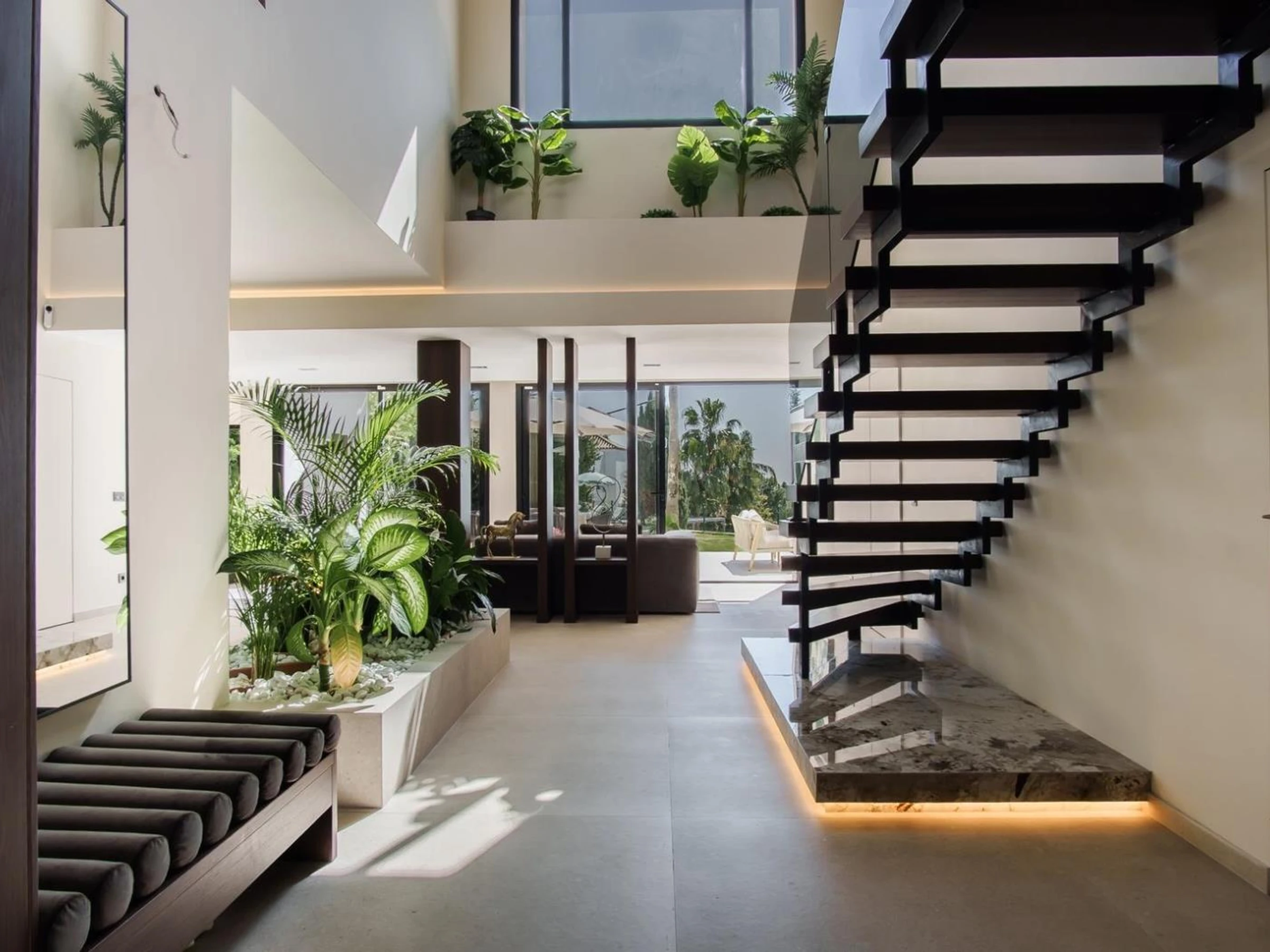 A floating staircase and interior garden create a sense of calm movement through the home, while high-end finishes—from marble surfaces to bespoke design elements—bring a refined edge to every corner.