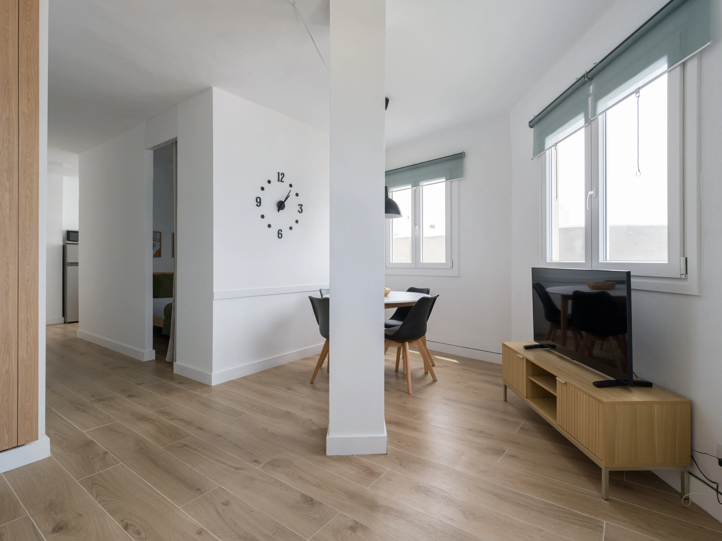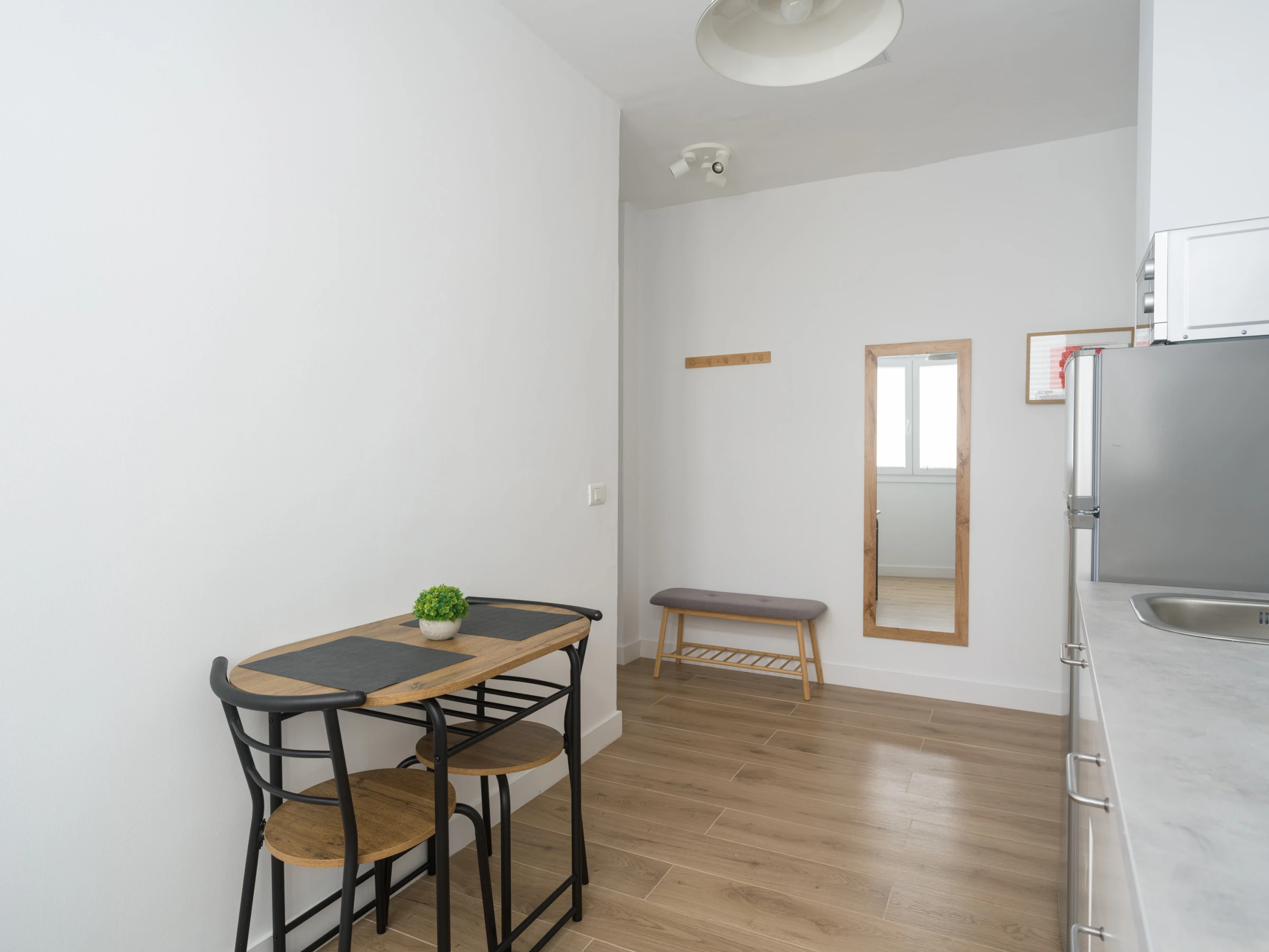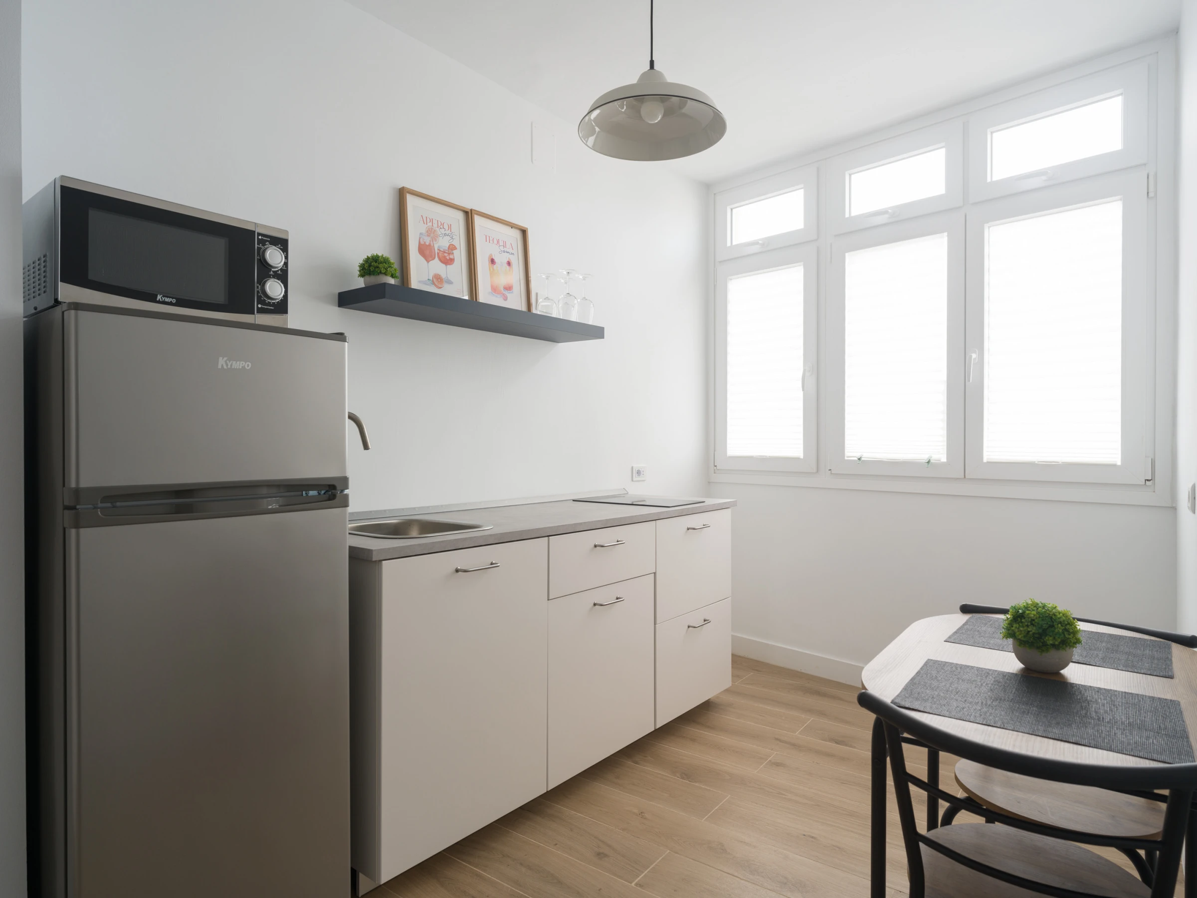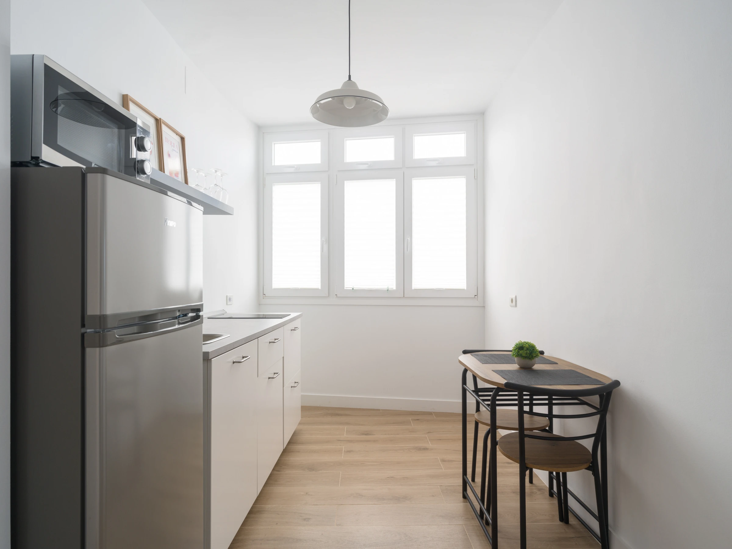 La cocina independiente de inducción está completamente equipada con nevera, congelador, microondas, cafetera, tostadora, hervidor, exprimidor y todos los utensilios que necesitas. Incluye especias, vajilla, cubiertos y batería de cocina para que disfrutes preparando tus propias comidas. También encontrarás una zona de comedor con mesa y sillas para relajarte.
