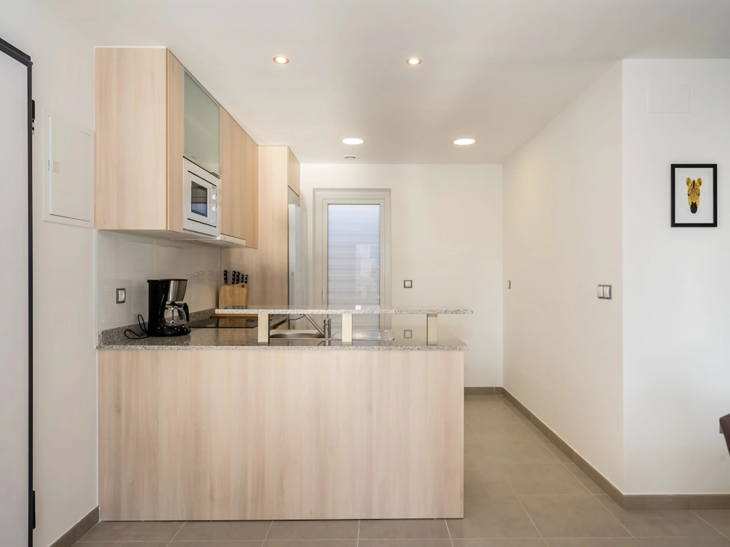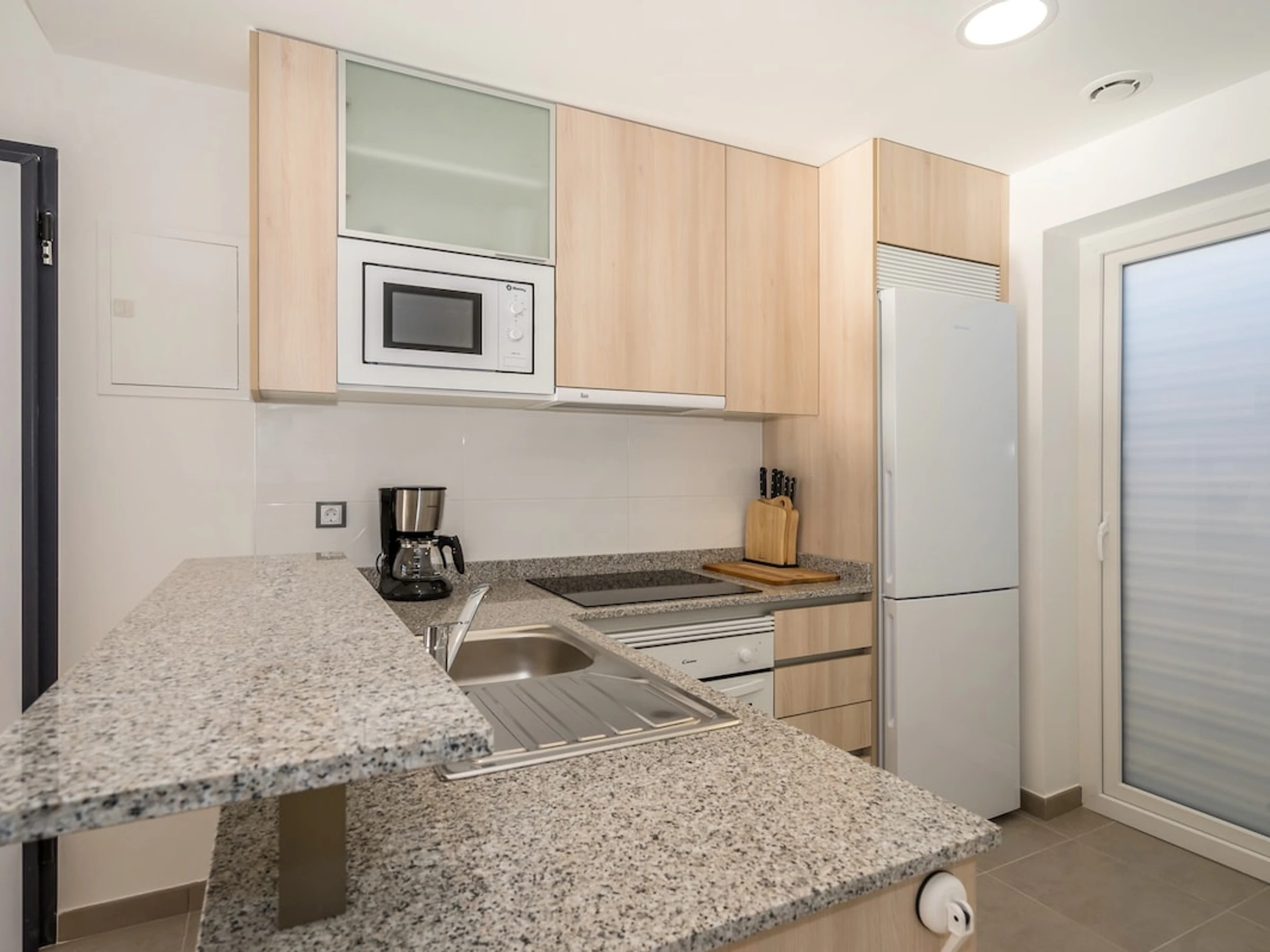 - cocina americana con cocina de inducción, horno eléctrico, microondas, lavavajillas, frigorífico, congelador, cafetera, calentador de agua, tostador y licuadora