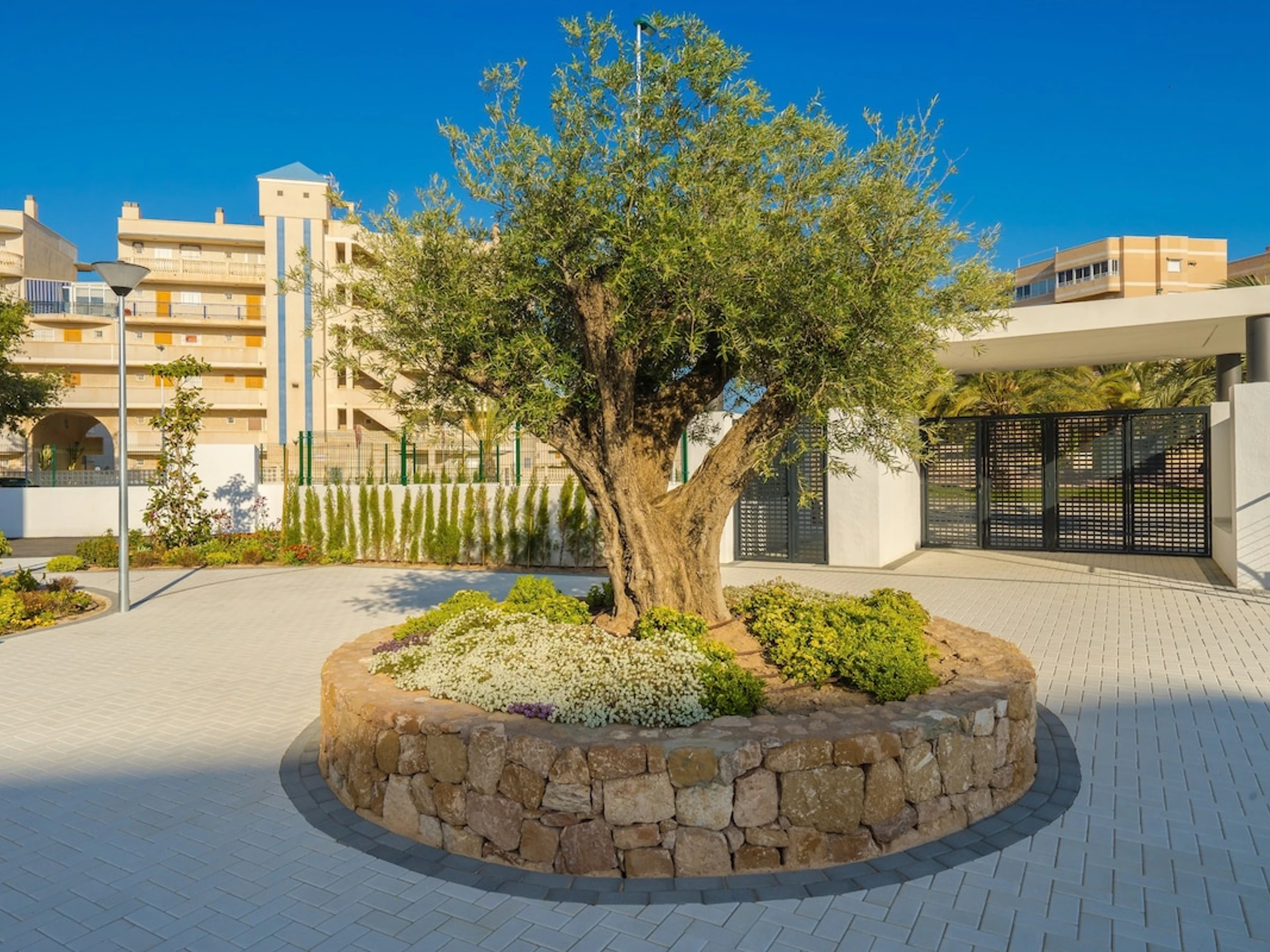 - jardín comunitario con césped y árboles