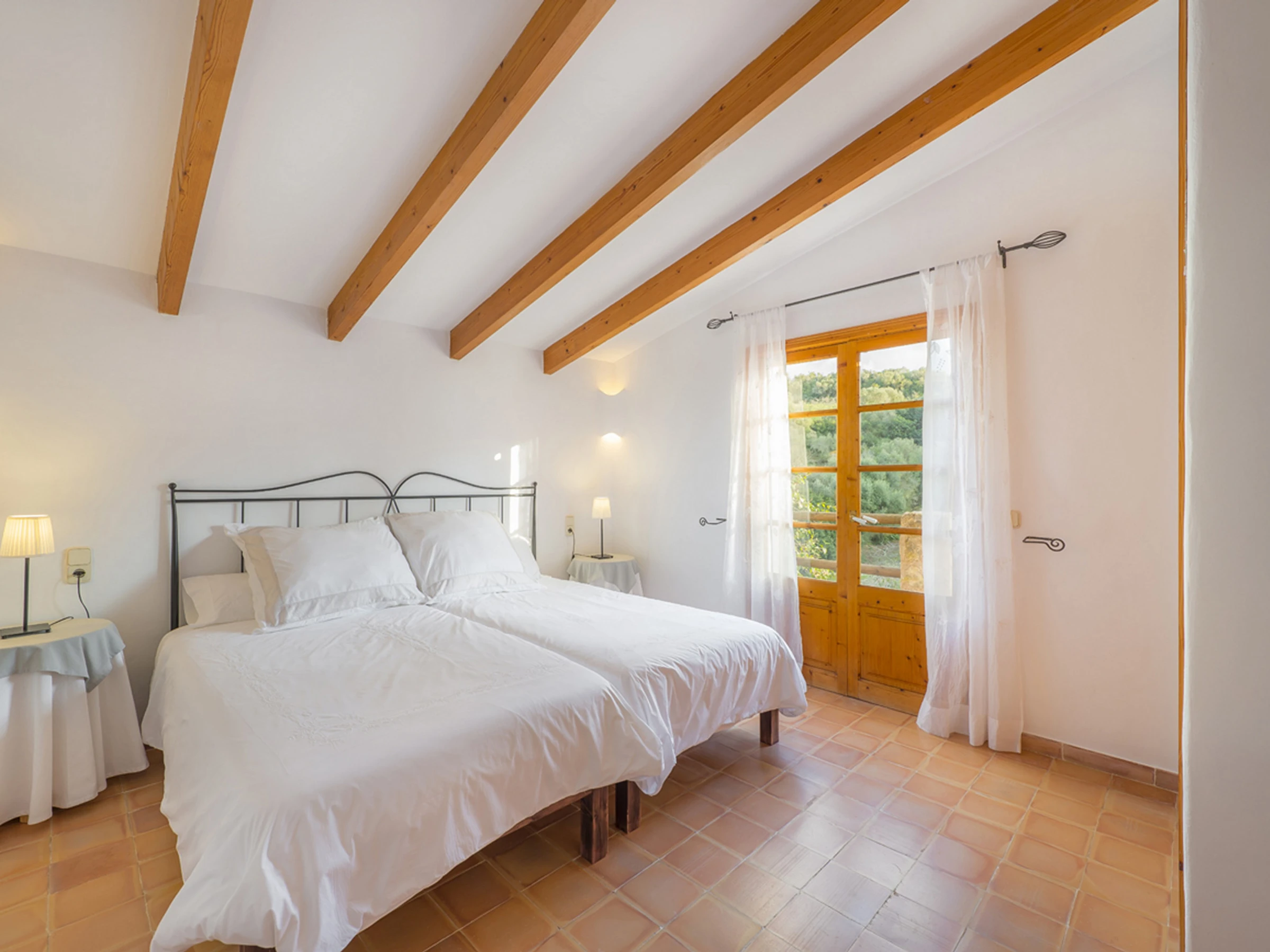En el interior, encontrará un amplio, cómodo y luminoso comedor con un encantador mobiliario mallorquín. El salón es un lugar ideal para estancias largas. Está muy bien decorado. Es amplio, luminoso y, sobre todo, acogedor. Sus cómodos sofás invitan a relajarse viendo la televisión o leyendo alguno de los libros de su extensa y completa biblioteca. Cuenta con una encantadora cocina de gas, muy bien equipada, espaciosa y bien cuidada, que garantiza que tenga todo lo necesario para disfrutar cocinando. Dispone de un lavadero totalmente equipado con lavadora, tabla de planchar y plancha. Sus cuatro dormitorios son amplios y todos tienen vistas al campo y al jardín. Se distribuyen de la siguiente manera: uno en la planta baja y tres en la primera planta. El dormitorio de la planta baja es doble con cama de matrimonio. Los dormitorios de la primera planta son dobles con camas individuales. Hay dos baños, uno en cada planta, ambos con bañera.