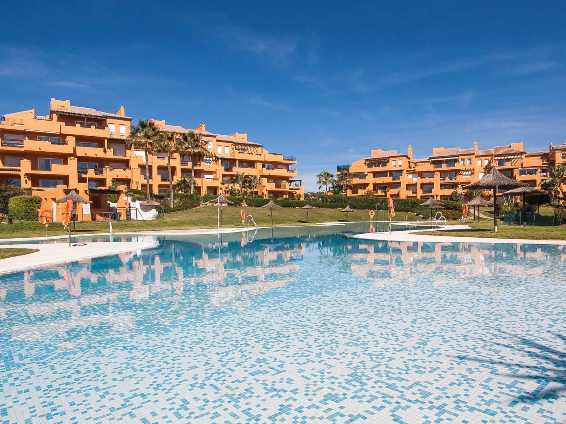 El complejo está ubicado en primera línea de playa y cuenta con una gran piscina estilo laguna, estacionamiento subterráneo, seguridad las 24 horas y se encuentra a pocos pasos del Castillo de la Duquesa o del Puerto de la Duquesa.