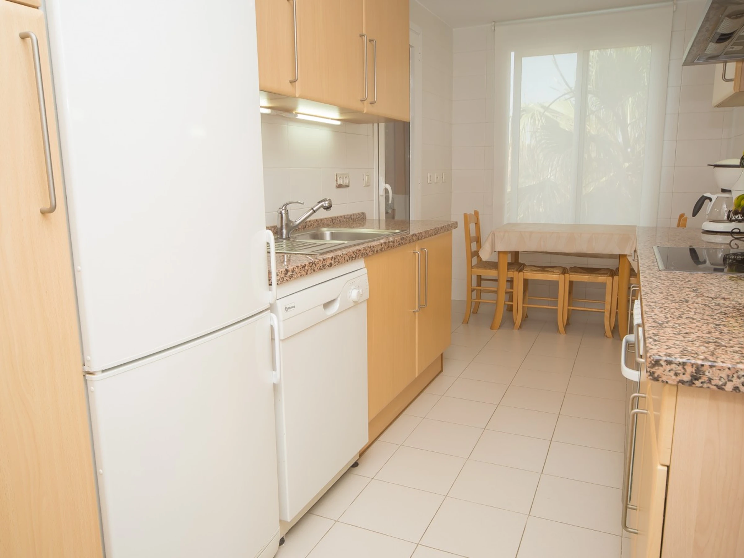 Apartamento de 3 dormitorios y 2 baños con aire acondicionado y terraza con piscina y vistas al mar. Este apartamento duerme hasta 8 debido a que el tercer dormitorio tiene literas, pero estos son realmente adecuados para niños en lugar de adultos. El apartamento también tiene una cocina totalmente equipada con lavavajillas y un salón de buen tamaño. La terraza ofrece 2 opciones para comer y tiene vistas a los jardines comunitarios, la piscina y el mar.