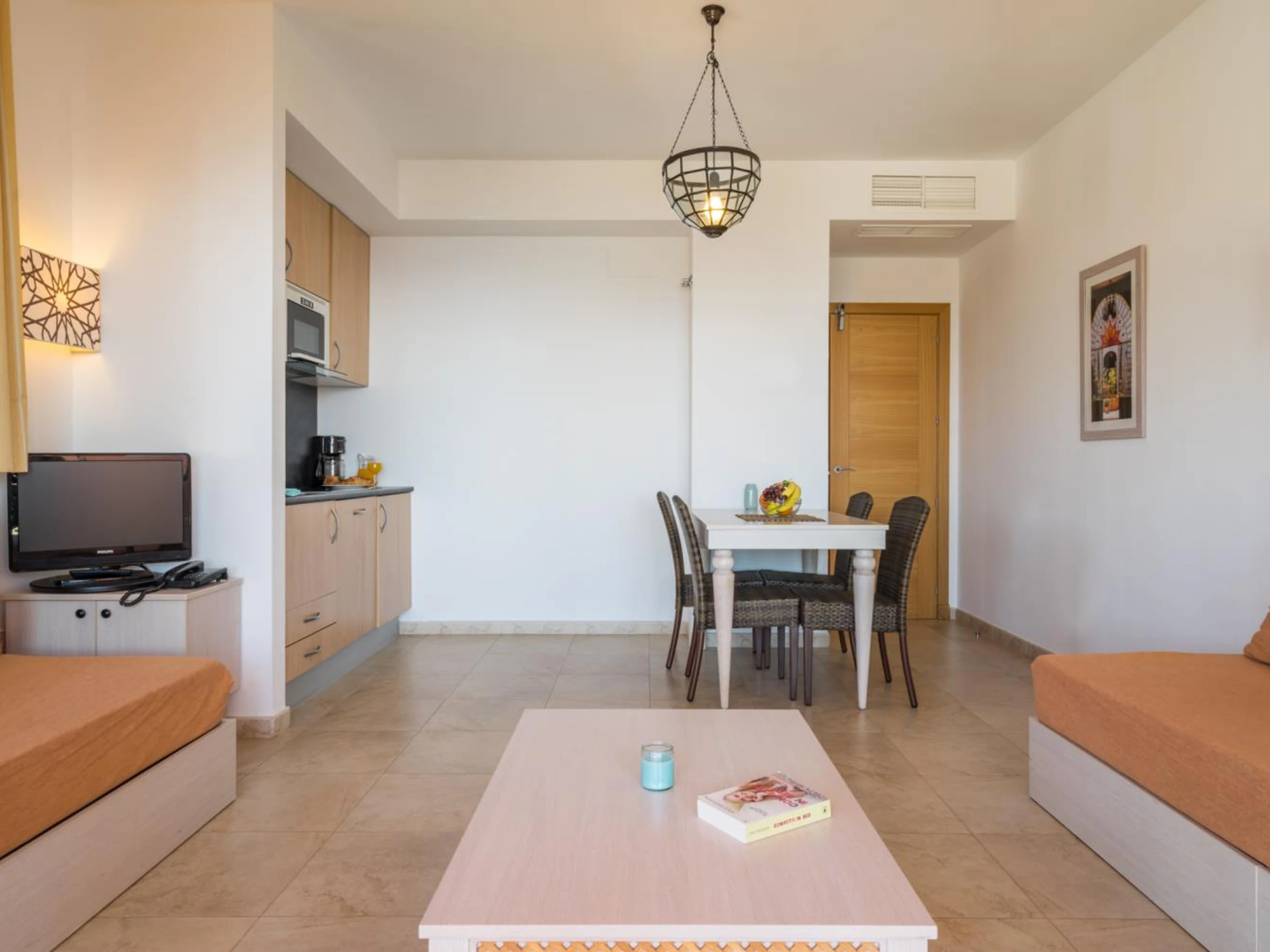 Totalmente equipado y espacioso, su acogedor apartamento se completa con una terraza con vistas al mar, a los jardines o a las piscinas. Los colores suaves y la decoración andaluza le dan una sensación de tranquilidad. Todos los apartamentos disponen de aire acondicionado, lo que los hace perfectos para el verano.