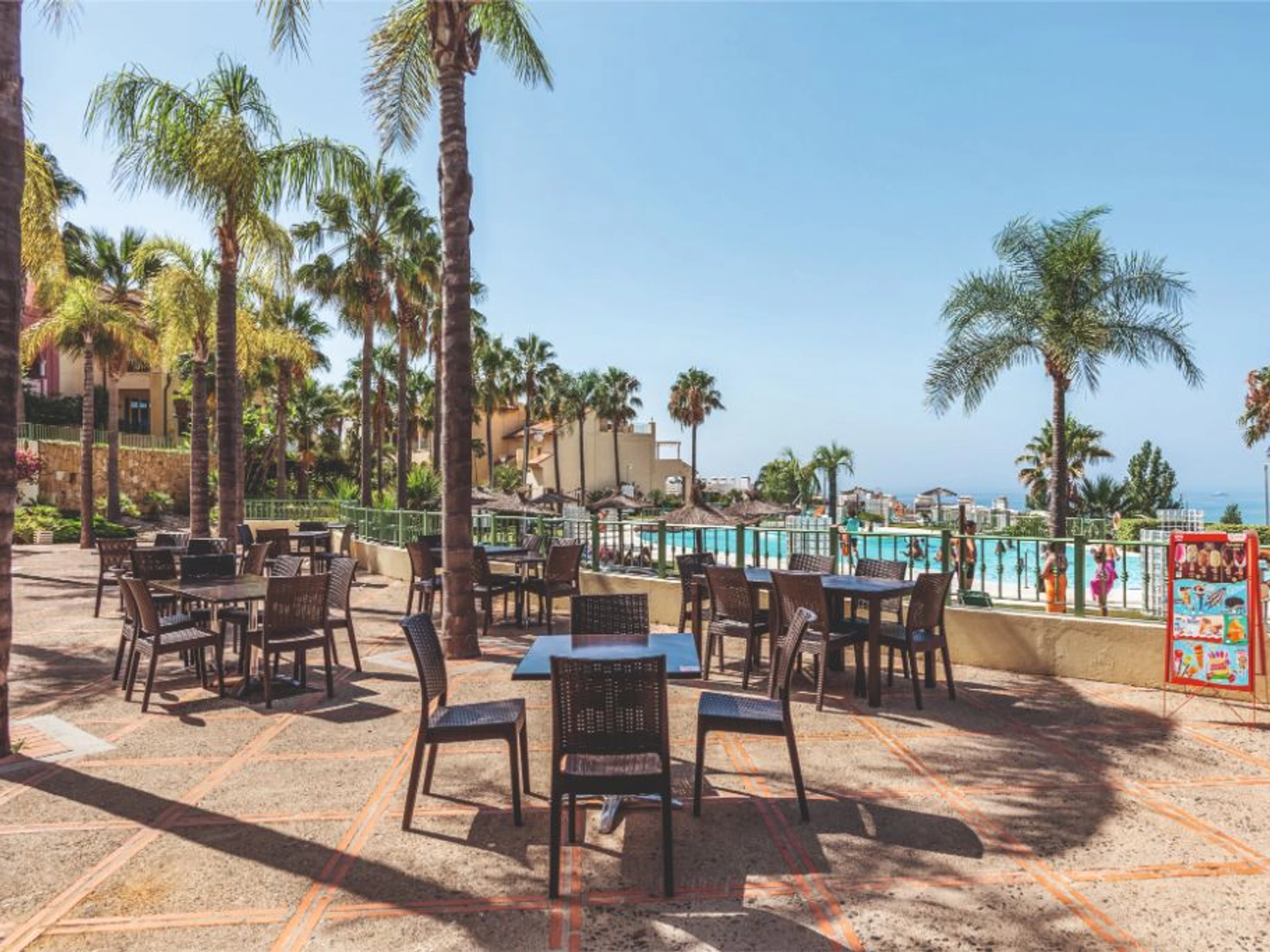 Aproveche una de nuestras 2 piscinas bajo el sol andaluz. El más grande mide 420 m² y cuenta con piscina infantil y chorros de masaje. ¡Días felices!