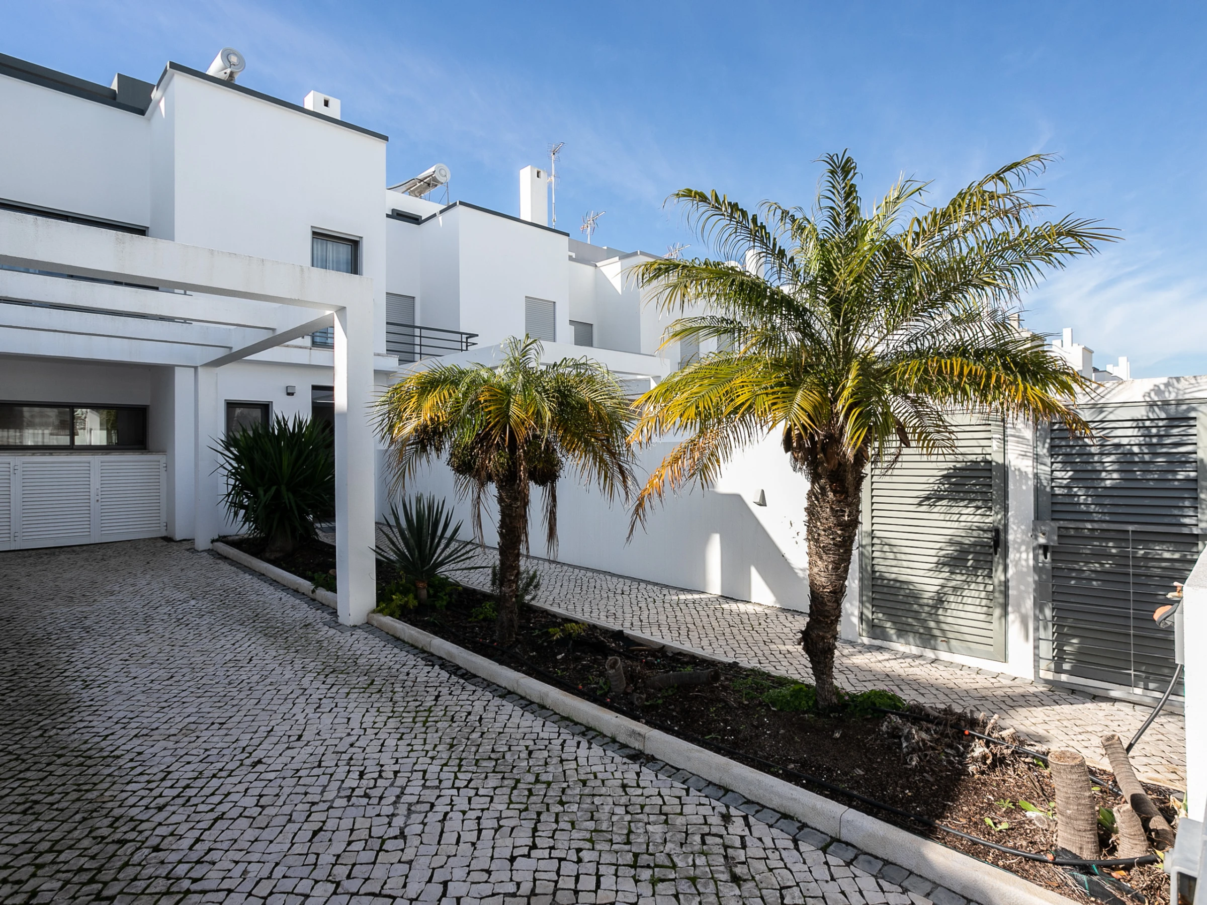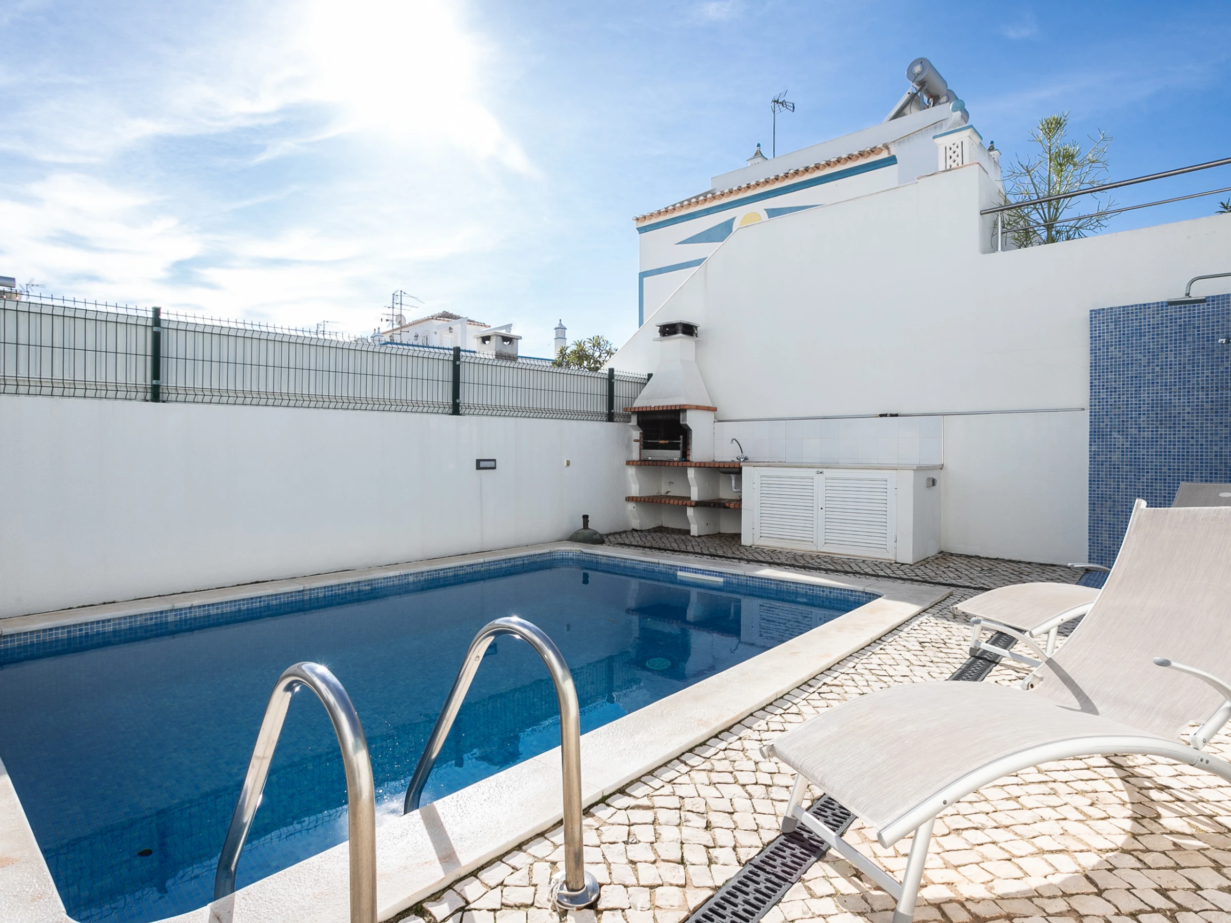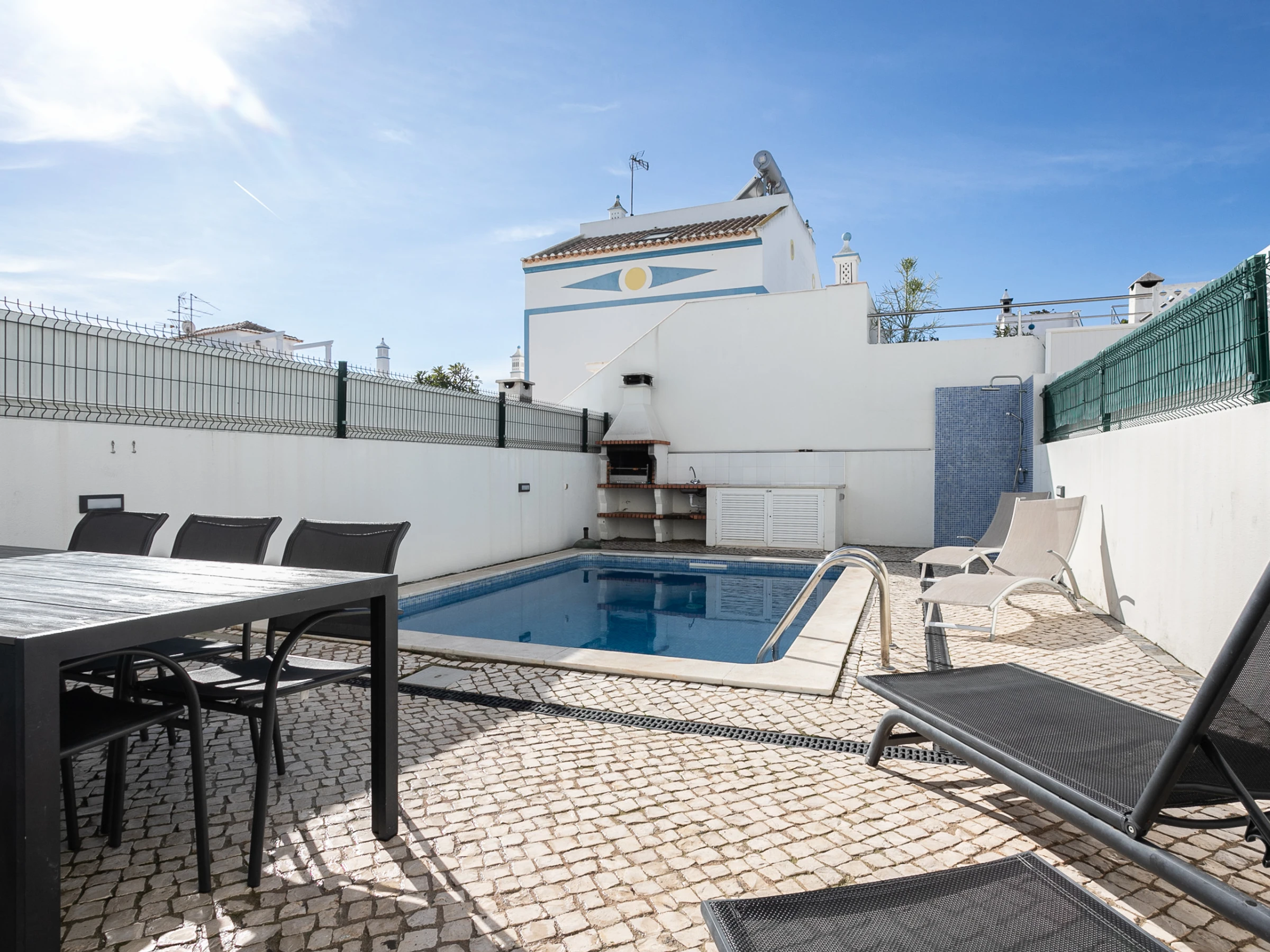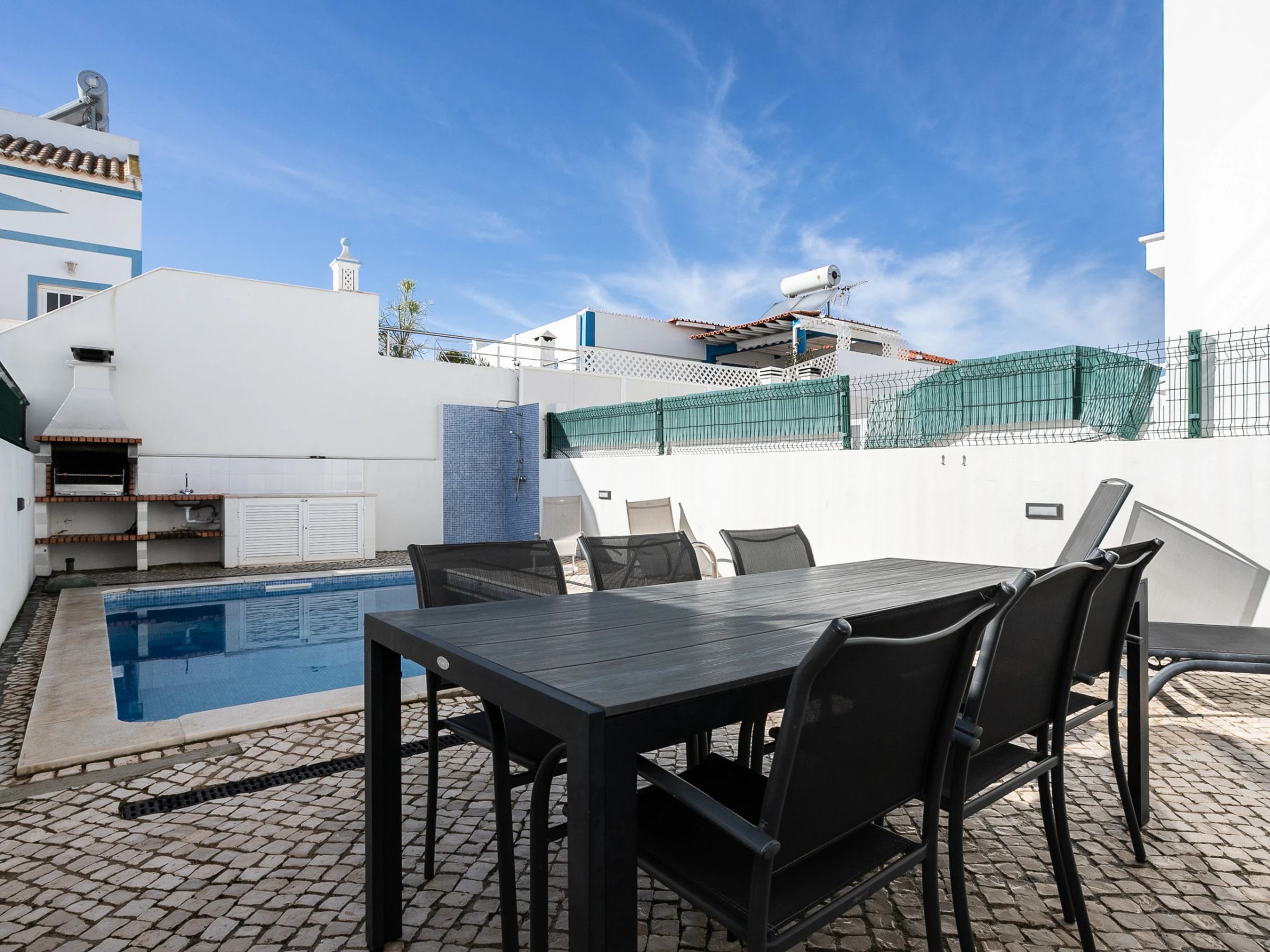 El espacio exterior maximiza la vida al aire libre, con una piscina privada orientada al oeste, tumbonas para relajarse al sol, y una zona cubierta con toldo, equipada con mesa, sillas y barbacoa para comidas al aire libre. Una terraza adicional de 20m² con mobiliario de jardín proporciona más espacio para disfrutar del clima del Algarve. La vivienda dispone además de estacionamiento privativo para hasta 2 vehículos dentro de la propiedad.