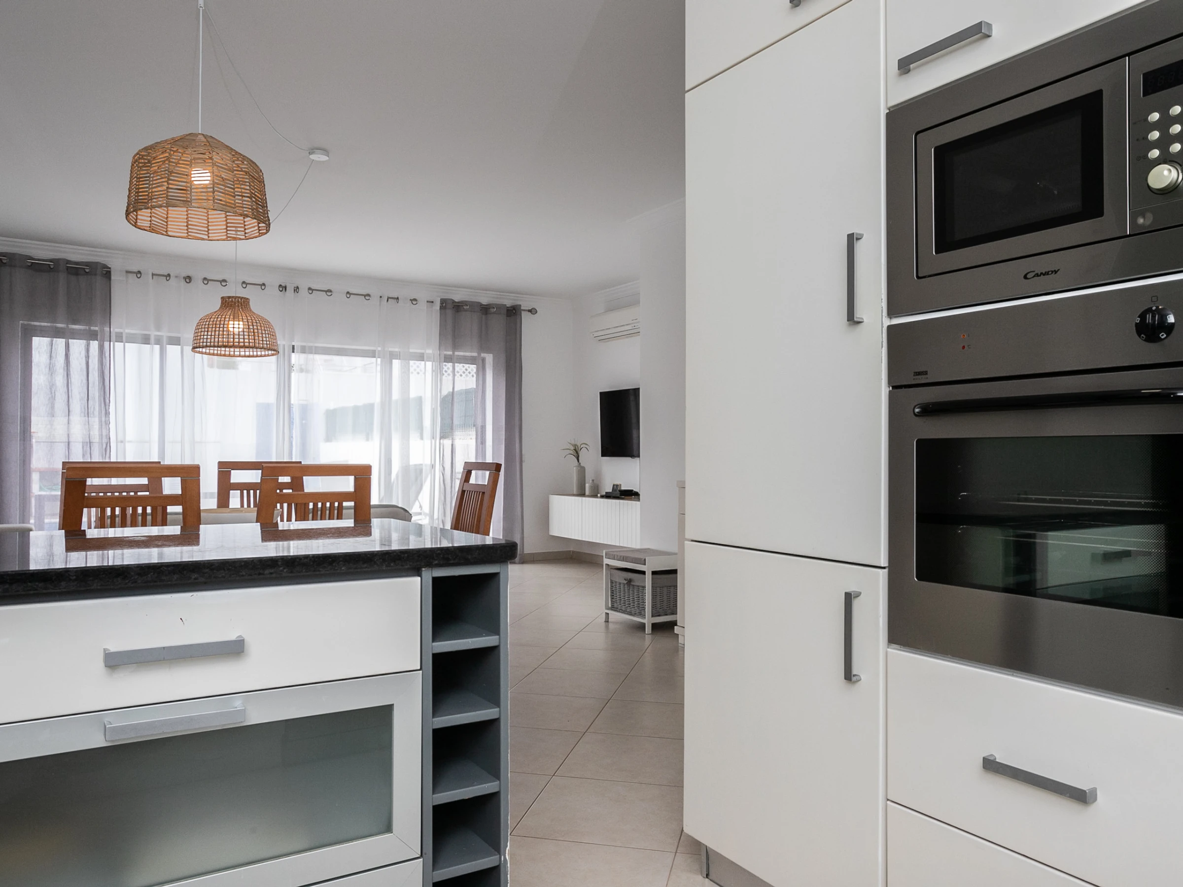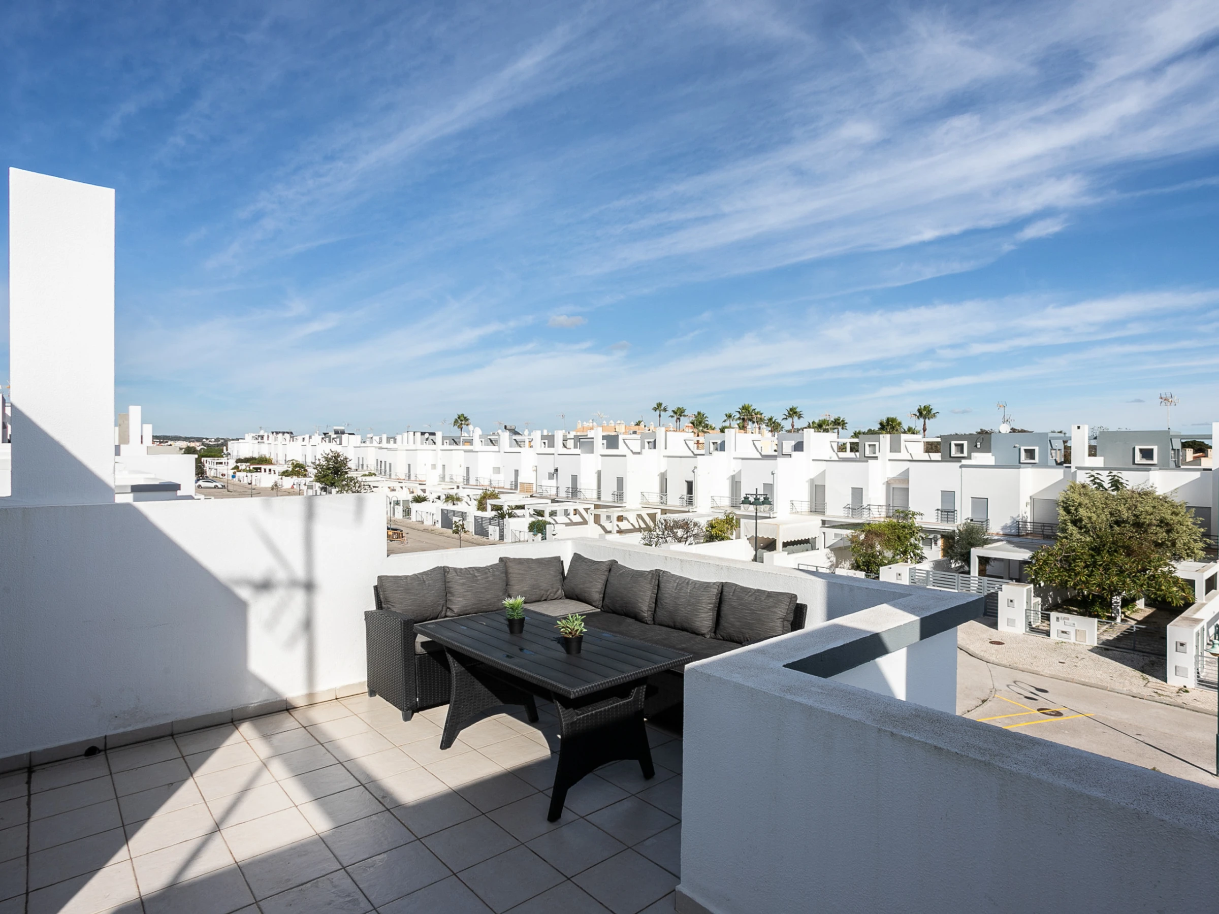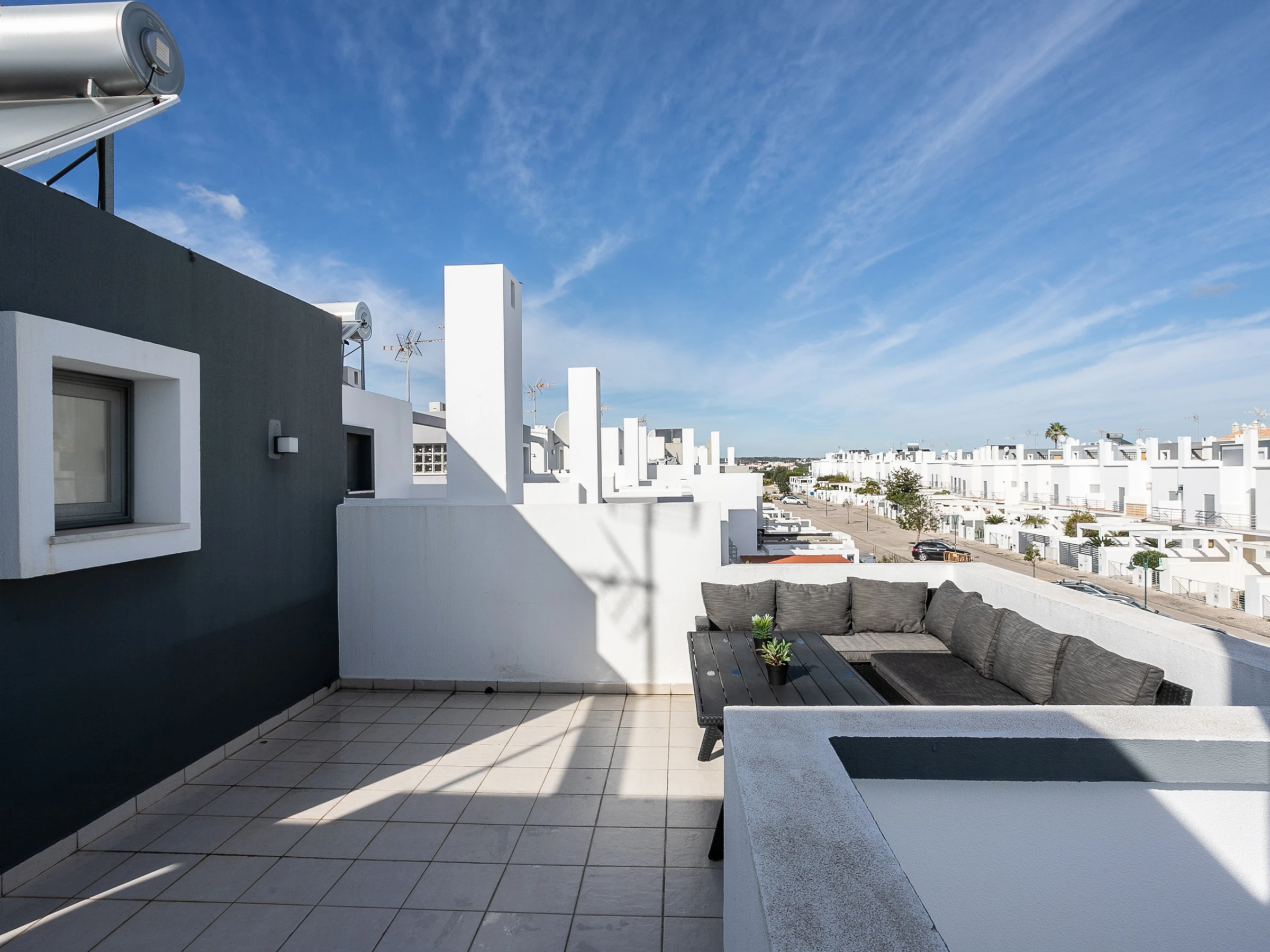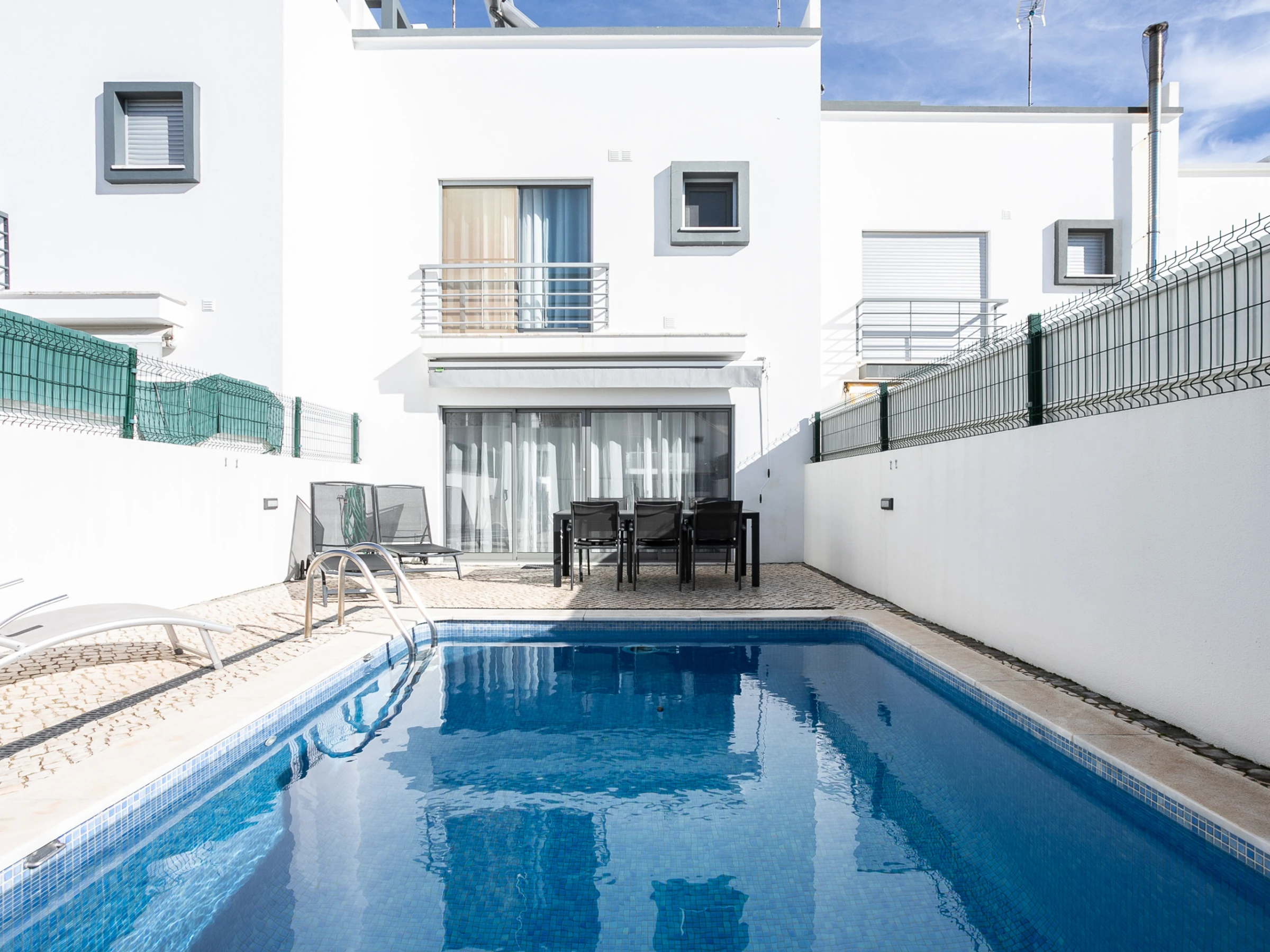 El espacio exterior maximiza la vida al aire libre, con una piscina privada orientada al oeste, tumbonas para relajarse al sol, y una zona cubierta con toldo, equipada con mesa, sillas y barbacoa para comidas al aire libre. Una terraza adicional de 20m² con mobiliario de jardín proporciona más espacio para disfrutar del clima del Algarve. La vivienda dispone además de estacionamiento privativo para hasta 2 vehículos dentro de la propiedad.