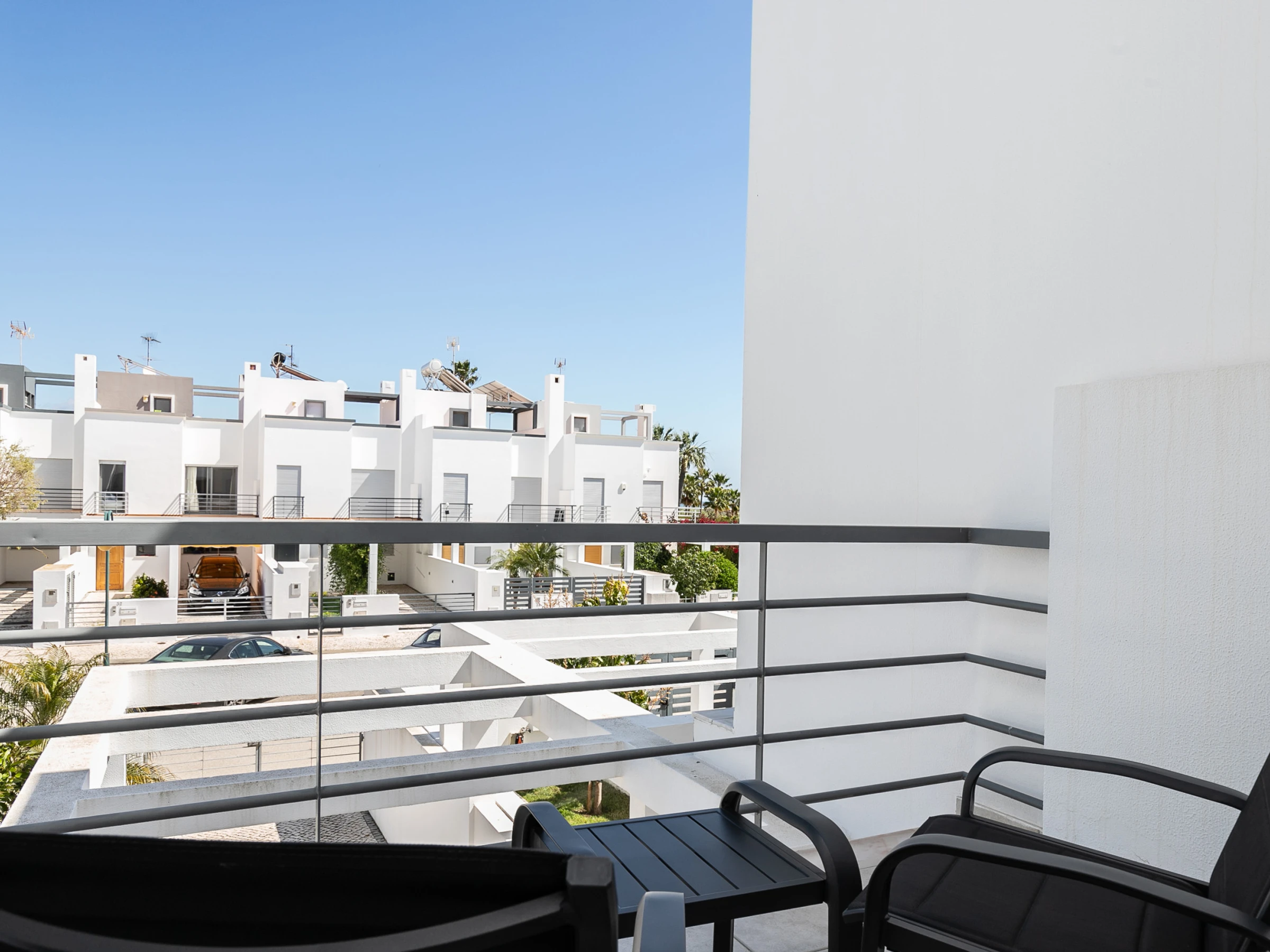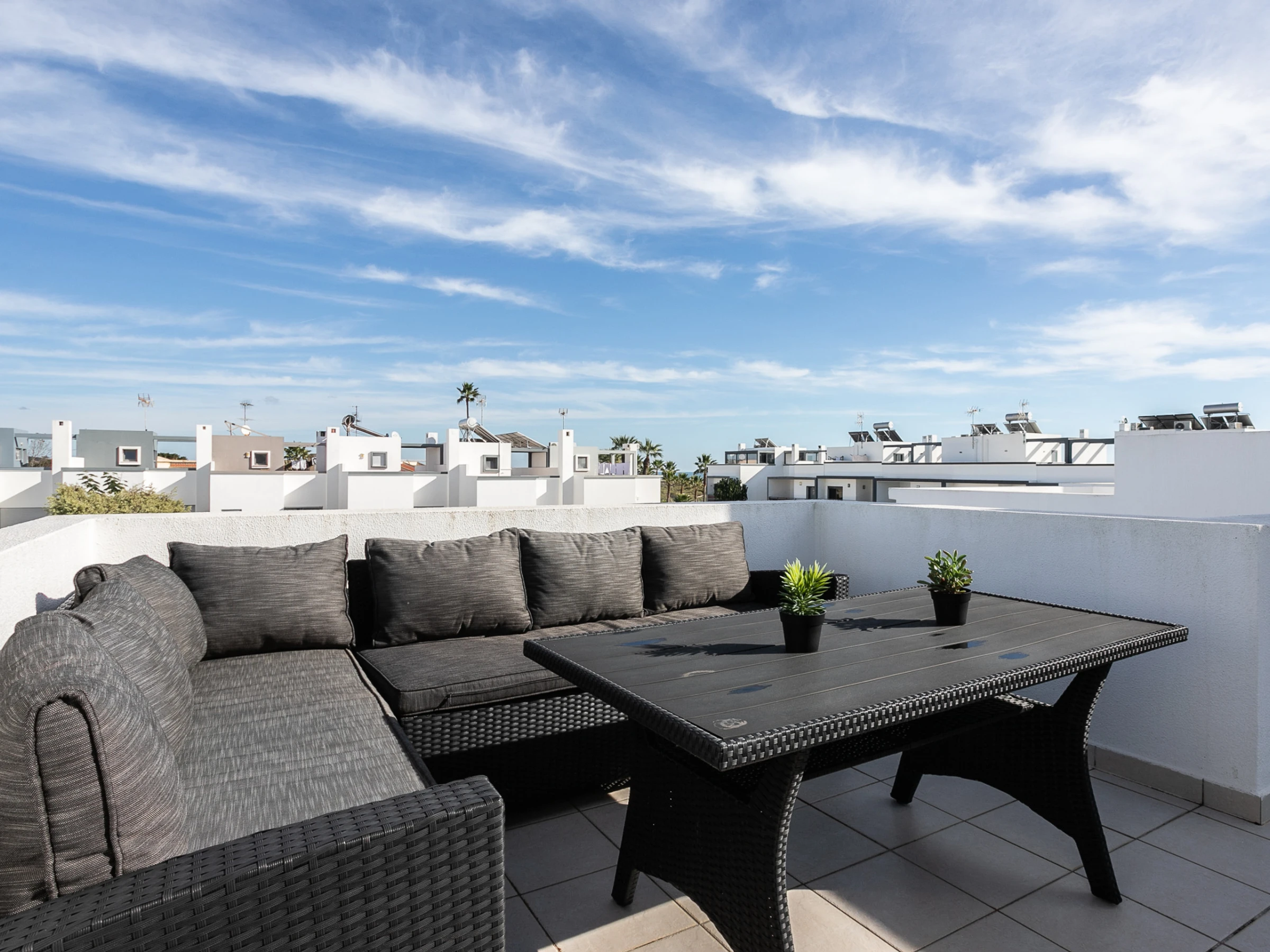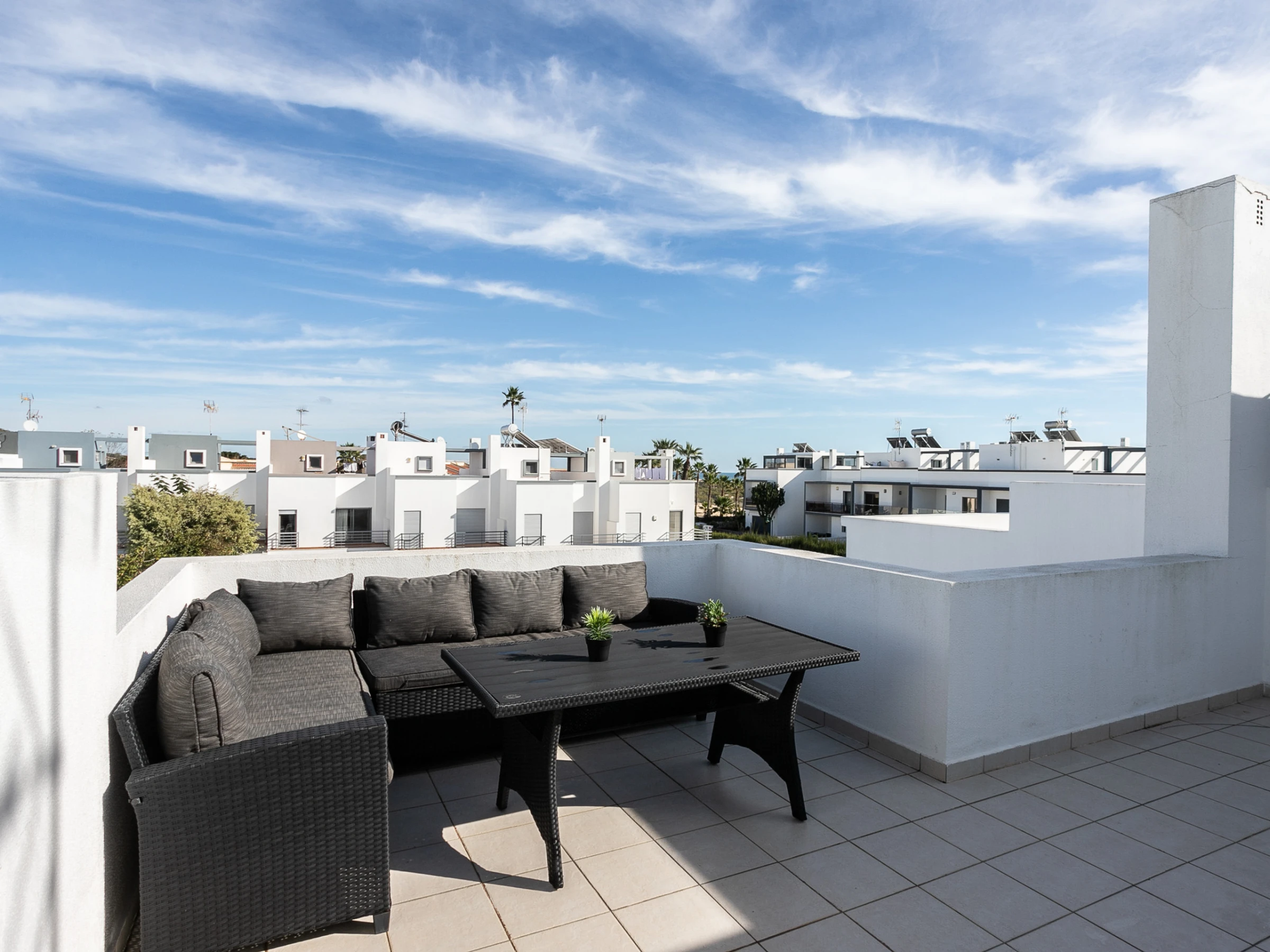 La vivienda cuenta con 3 habitaciones confortables, incluyendo una suite con cama de matrimonio y dos habitaciones con dos camas individuales cada una, todas con armarios empotrados. Dispone de 3 cuartos de baño — dos con ducha y uno con bañera — garantizando privacidad y comodidad para todos los huéspedes. Una de las habitaciones además se beneficia de un balcón orientado al este. En el ático, se encuentra una terraza con el área total de la casa y una fantástica vista al mar, perfecta para apreciar la puesta de sol o relajarse al final del día.