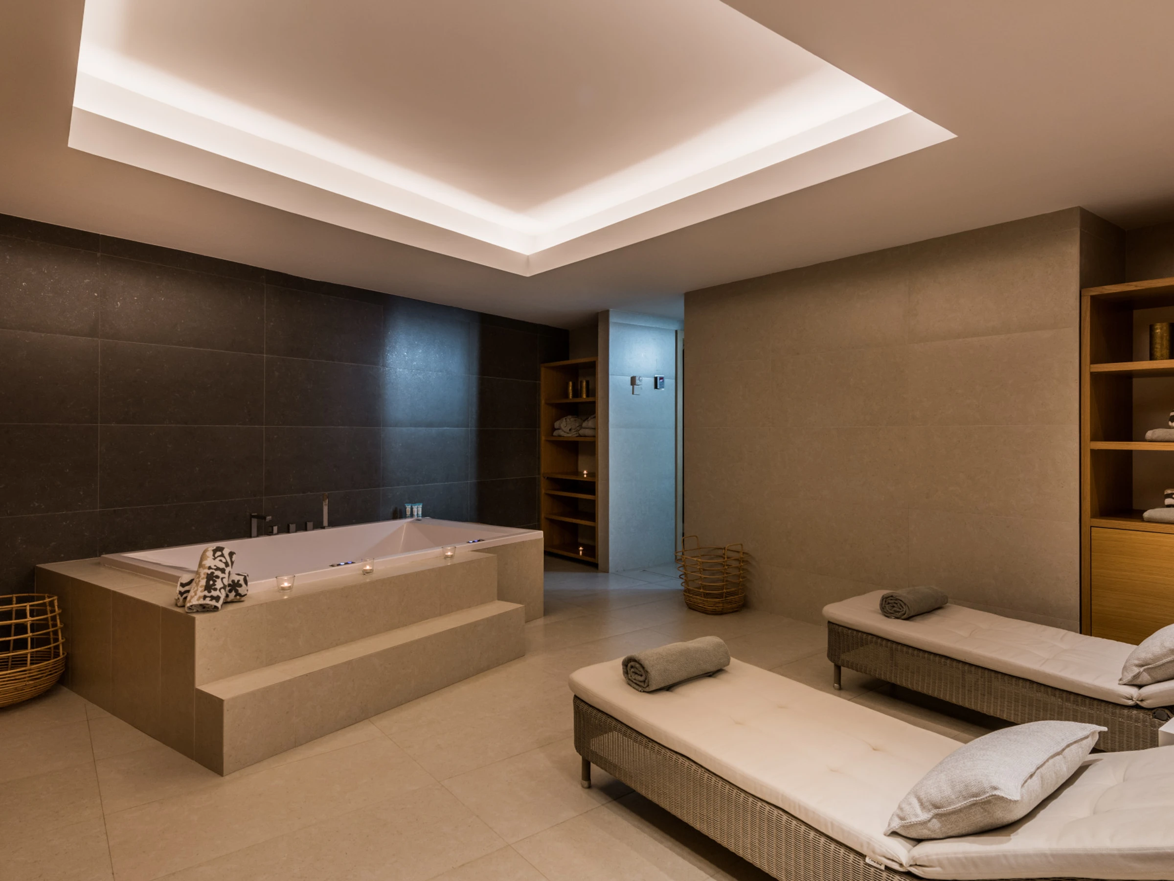 Esta villa tiene 6 dormitorios, 4 baños, un aseo de invitados y para los amantes del spa, instalaciones como baño de vapor turco y jacuzzi interior.