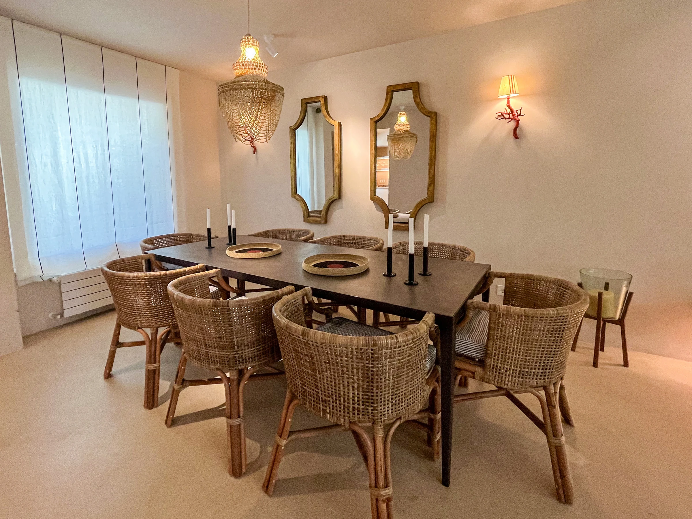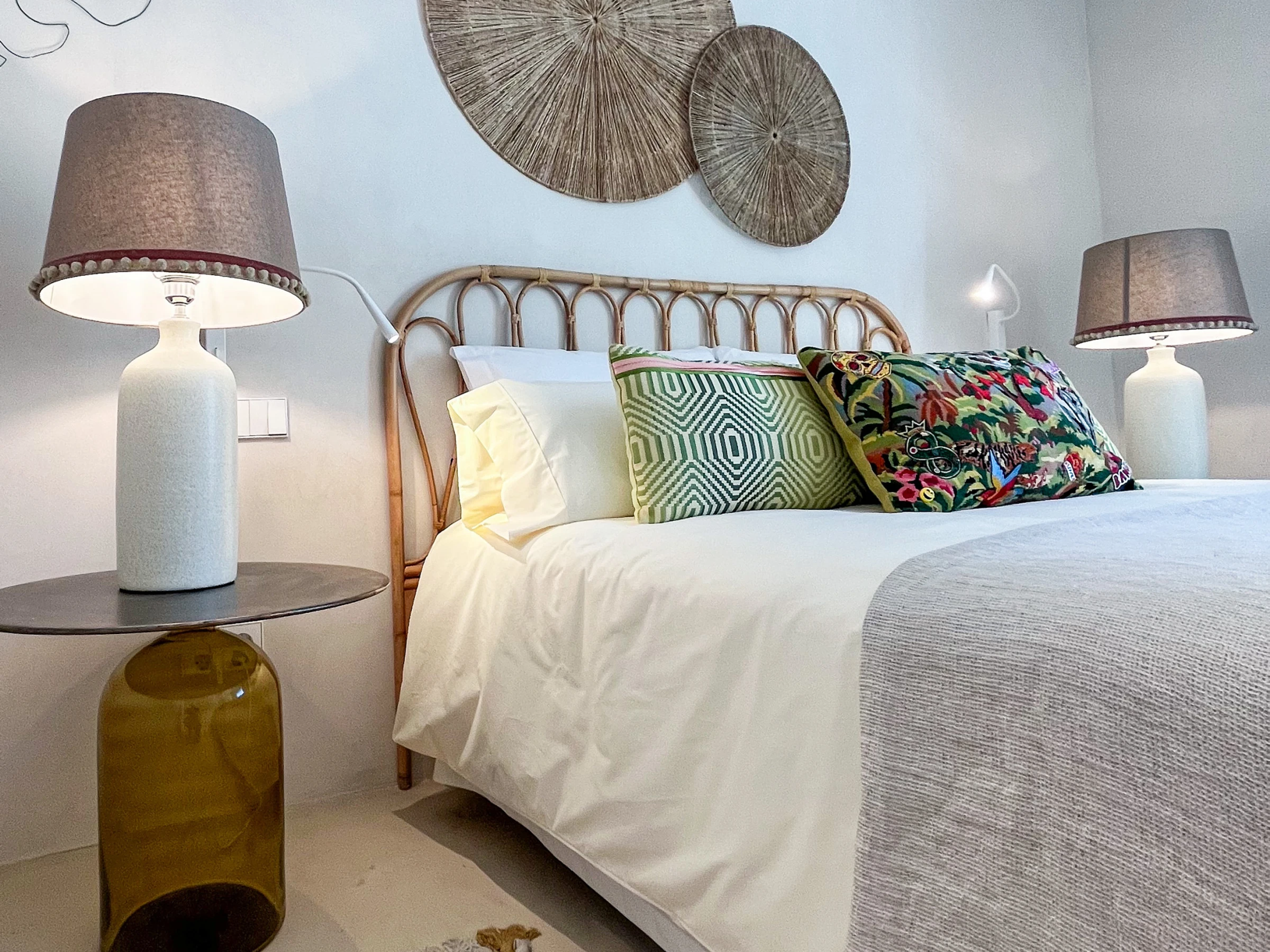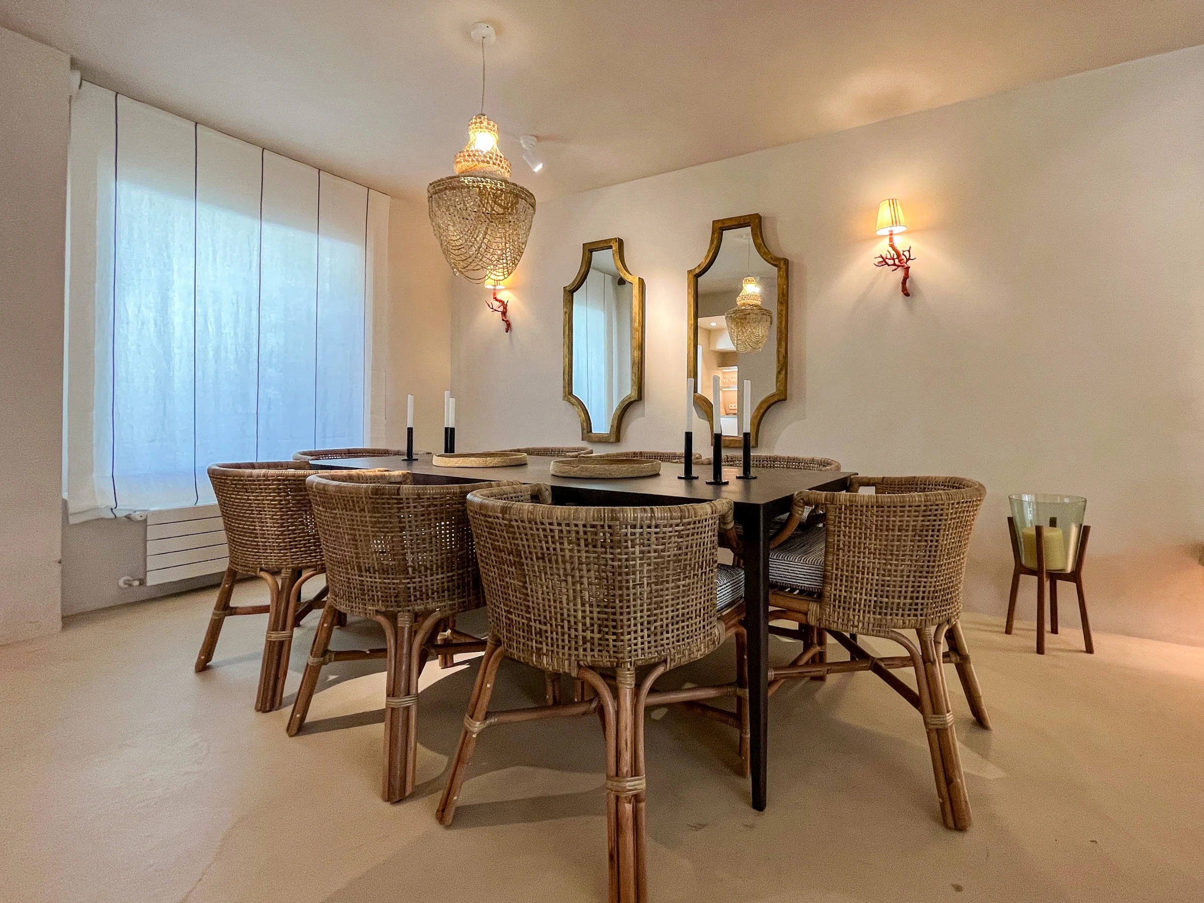 Completamente renovada en colaboración con un equipo de arquitectos y diseñadores de interiores, Casa Bambu muestra una impresionante fusión de diseño minimalista y estilo mediterráneo atemporal. El salón y el área de comedor de planta abierta están bañados de luz natural y decorados con gusto con iluminación inspirada en el coral, velas flotantes y refinados acentos decorativos. Las puertas francesas de suelo a techo se abren a una exuberante terraza privada orientada al este, que ofrece asientos sombreados, un área de comedor elegante y una vista verde tranquila, perfecta para una vida al aire libre relajada.