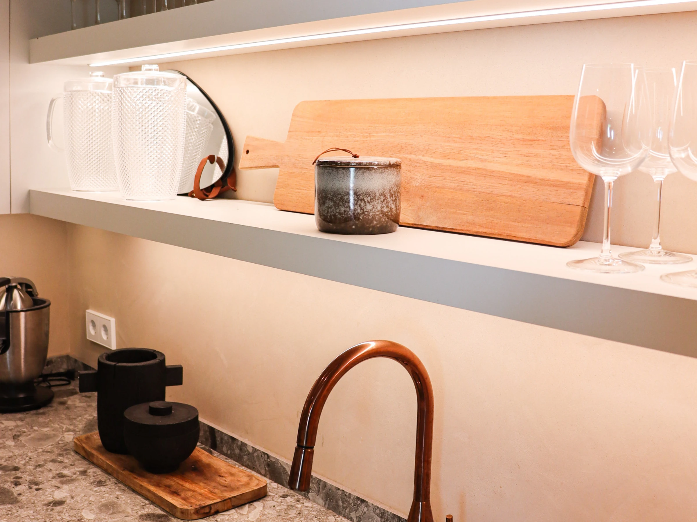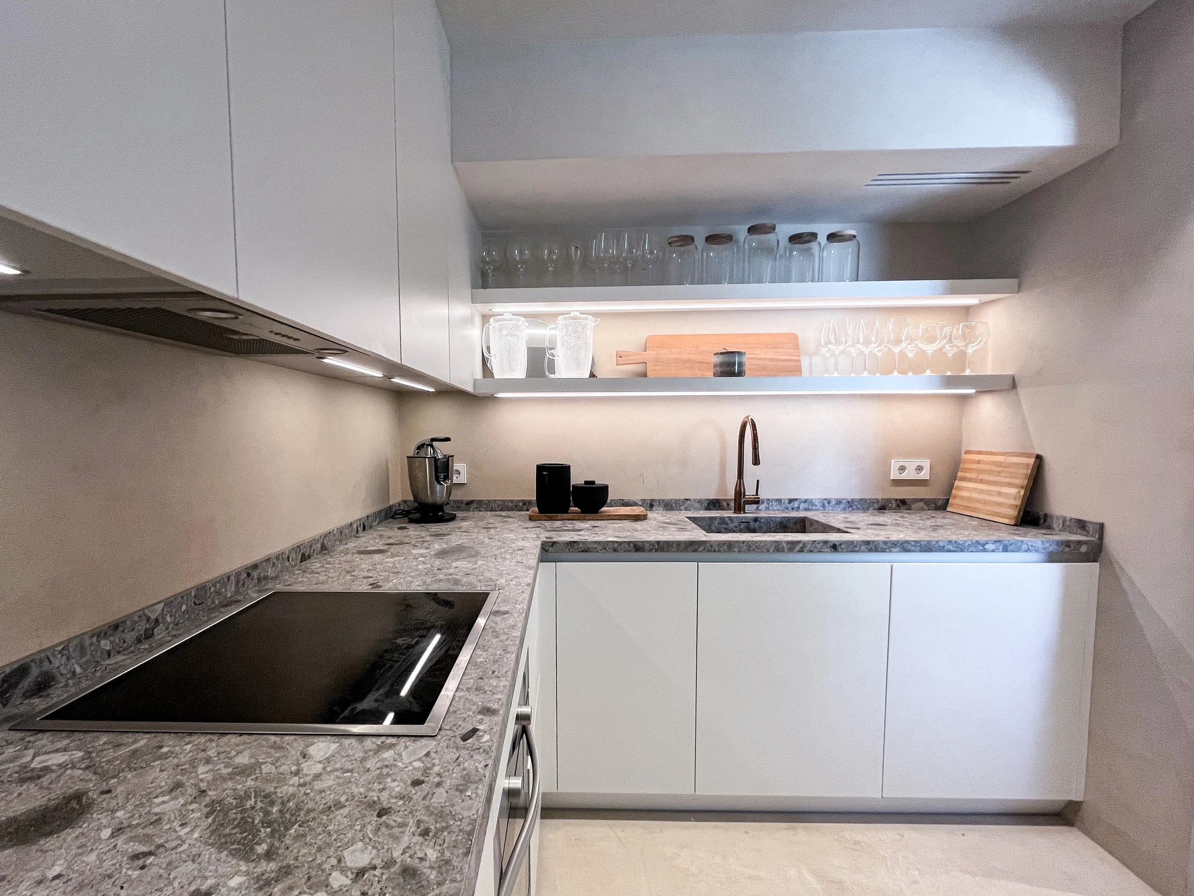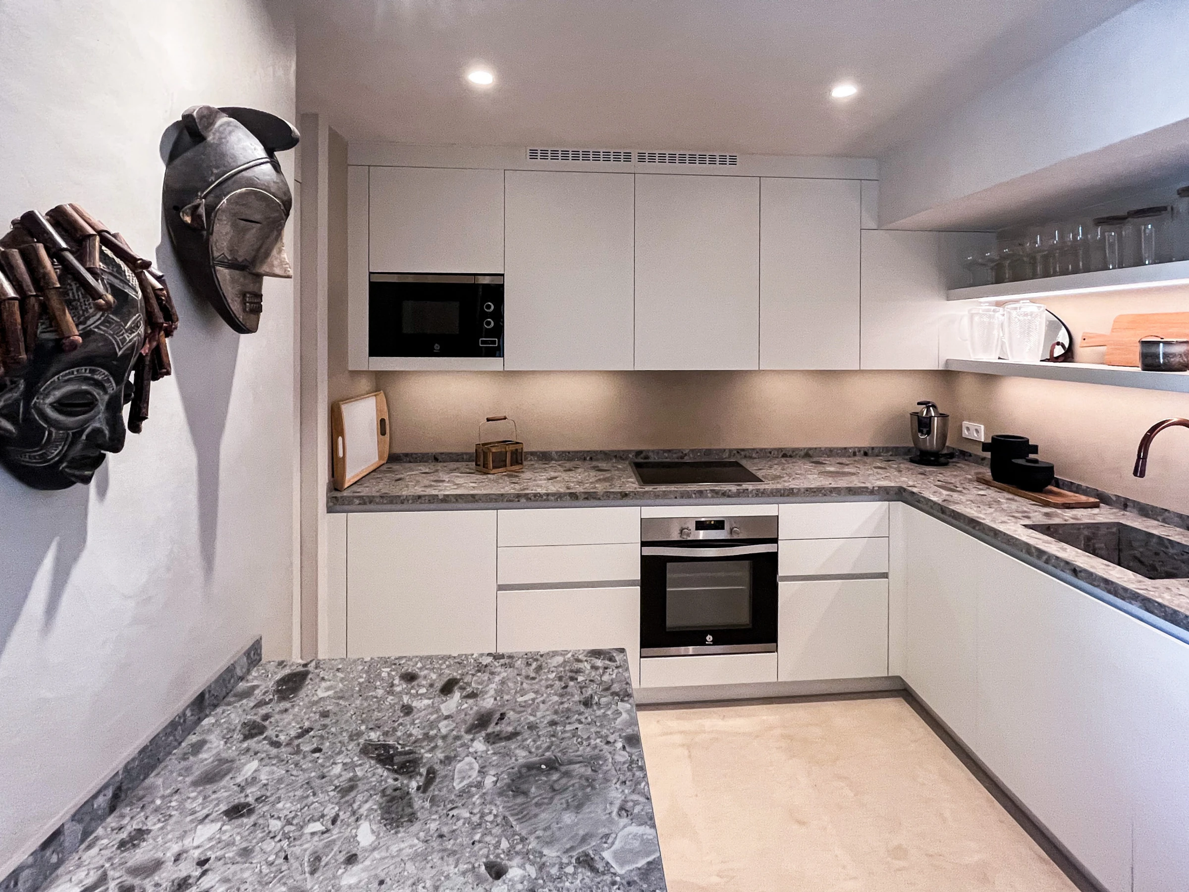 La cocina de última generación es elegante y está completamente equipada con electrodomésticos de primera, incluyendo una máquina Nespresso. La planta baja también cuenta con un aseo de invitados, un área de almacenamiento y un ascensor privado que conecta los tres niveles de la vivienda.