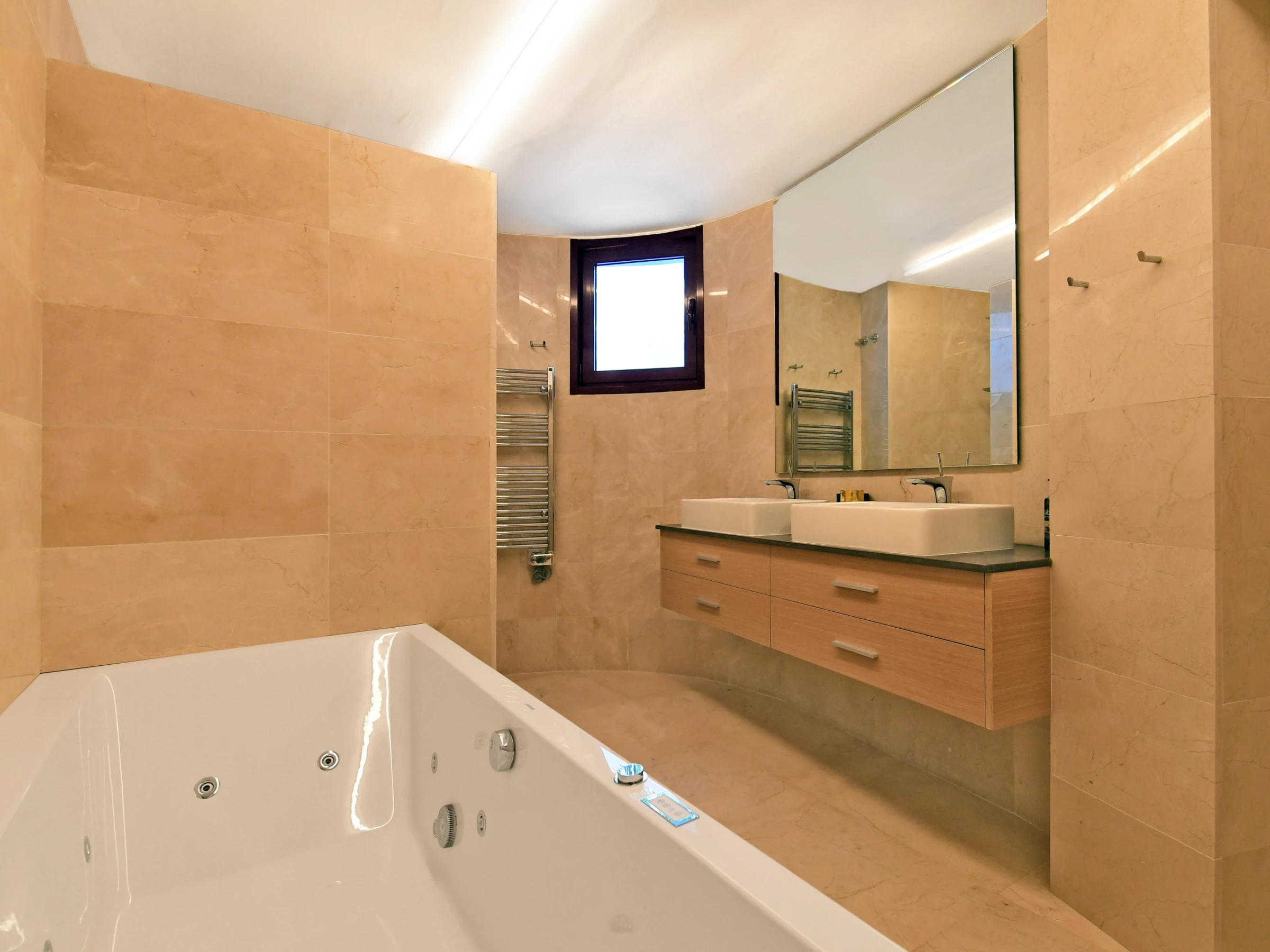 Algunas habitaciones seleccionadas ofrecen acceso directo a la terraza y al área de la piscina. Además, la planta baja alberga una sala de cine/juegos con mesa de billar y un gimnasio al aire libre. El área de estacionamiento al aire libre y cerrada en la entrada principal puede acomodar cómodamente cuatro autos, garantizando tanto seguridad como comodidad. Sumérgete en la epitome de la vida de lujo en esta cautivadora villa, donde cada detalle ha sido cuidadosamente seleccionado para ofrecer una experiencia incomparable.