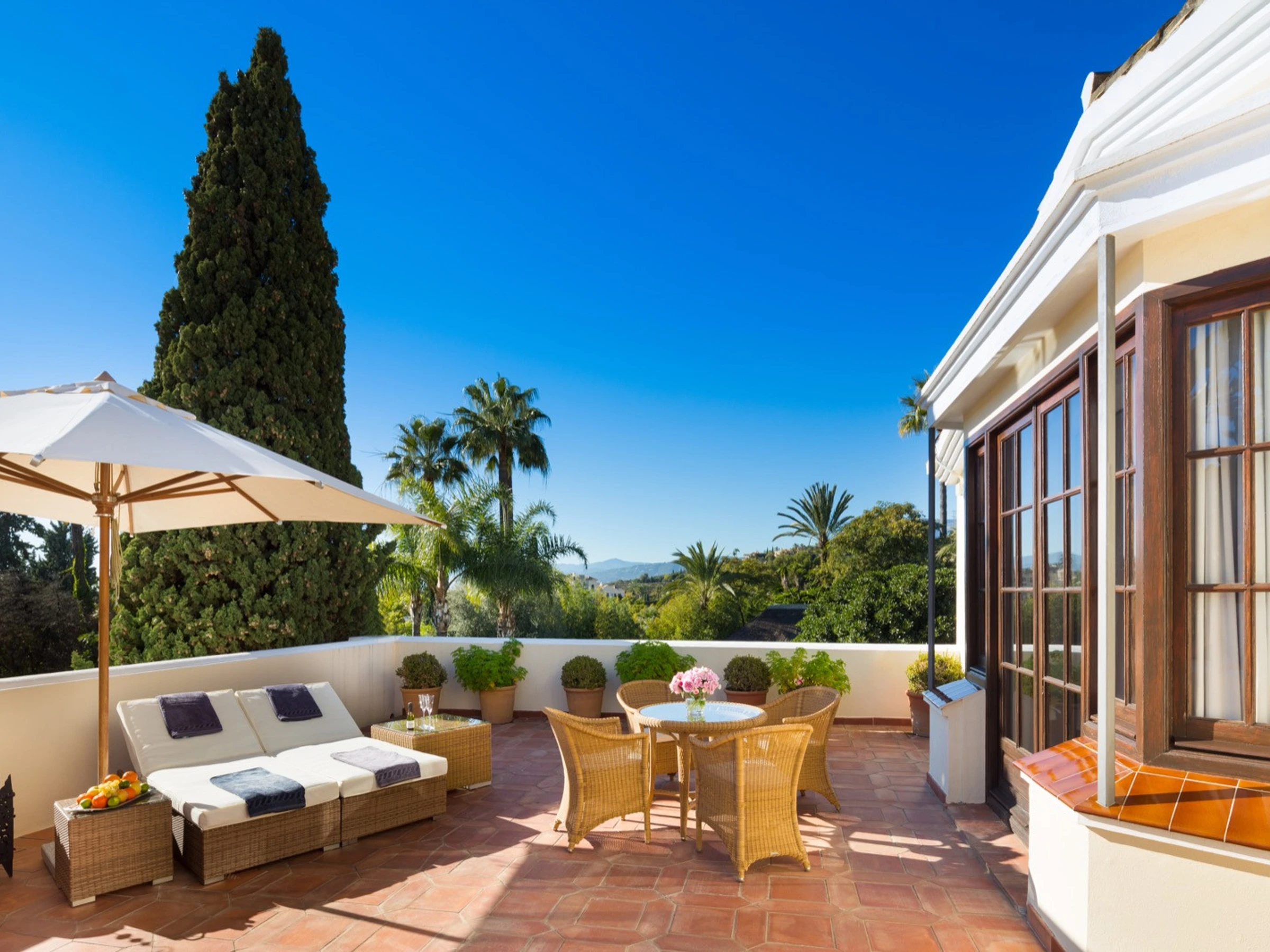 La propiedad cuenta con 9 dormitorios en suite, decorados con elegancia y equipados con Sky TV, sonido premium y amplios armarios. El dormitorio principal destaca por su terraza privada con vistas para disfrutar desayunos al aire libre. Con capacidad para 15 personas, esta villa es perfecta para familias o grupos que quieran compartir una estancia de lujo en un ambiente cómodo y muy luminoso, con vistas a la montaña y al jardín. 🌄🛌