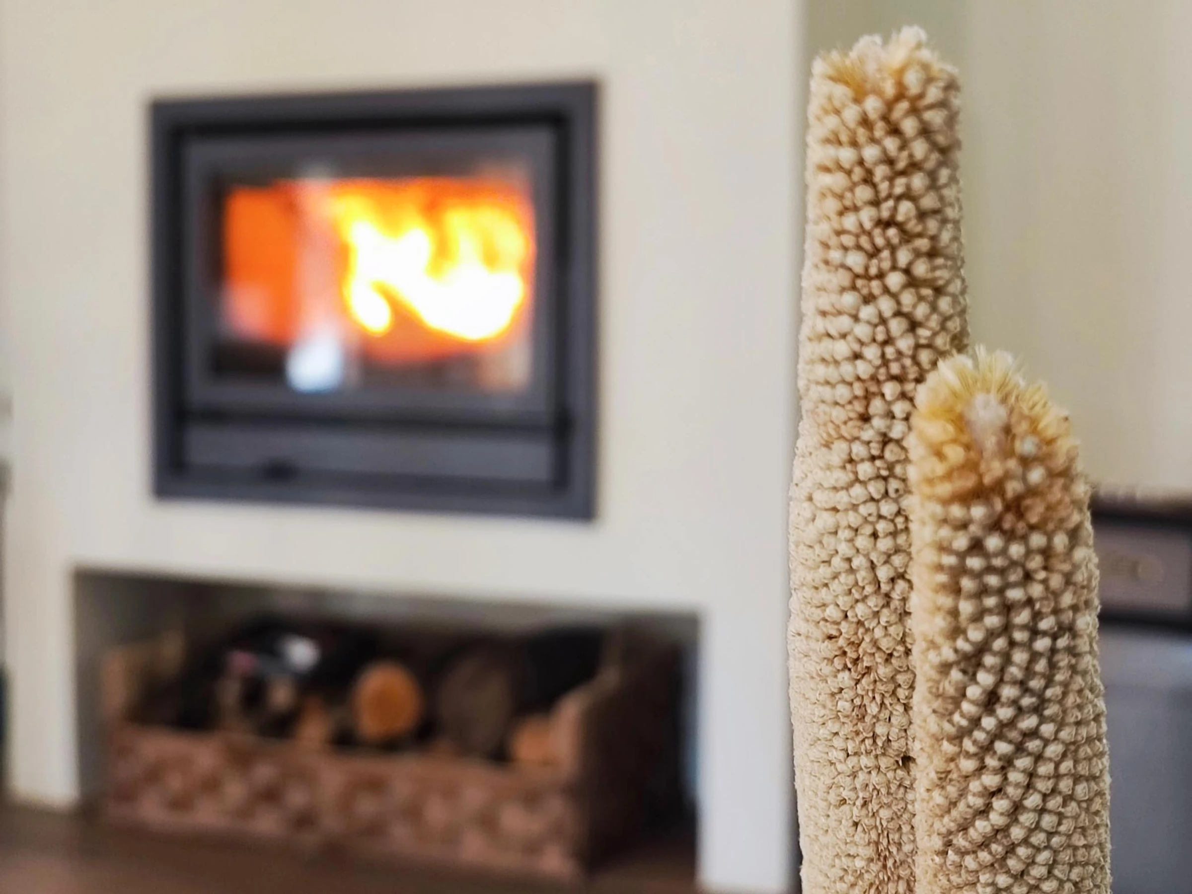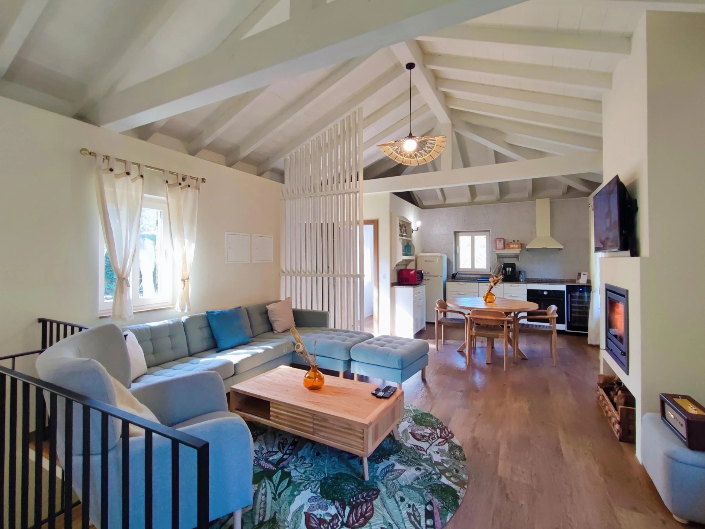 Subiendo al piso de arriba, encontrará una cocina y una sala de estar totalmente equipadas. La cocina es espaciosa y moderna, con todos los utensilios y electrodomésticos necesarios para preparar deliciosas comidas en familia. La sala de estar es un espacio acogedor y atractivo, perfecto para relajarse después de un día lleno de aventuras en la naturaleza, con una chimenea para crear un ambiente más cálido y acogedor.