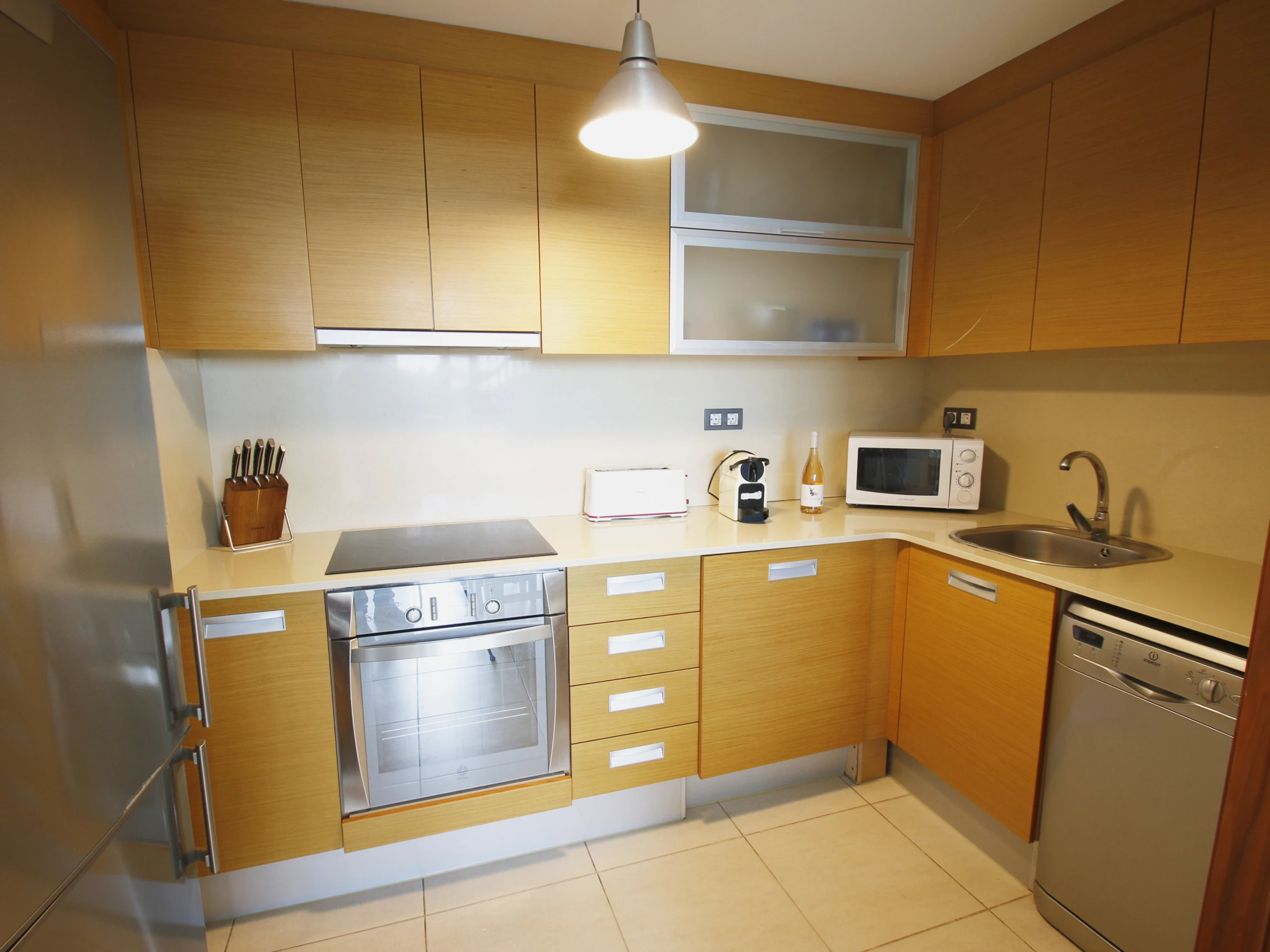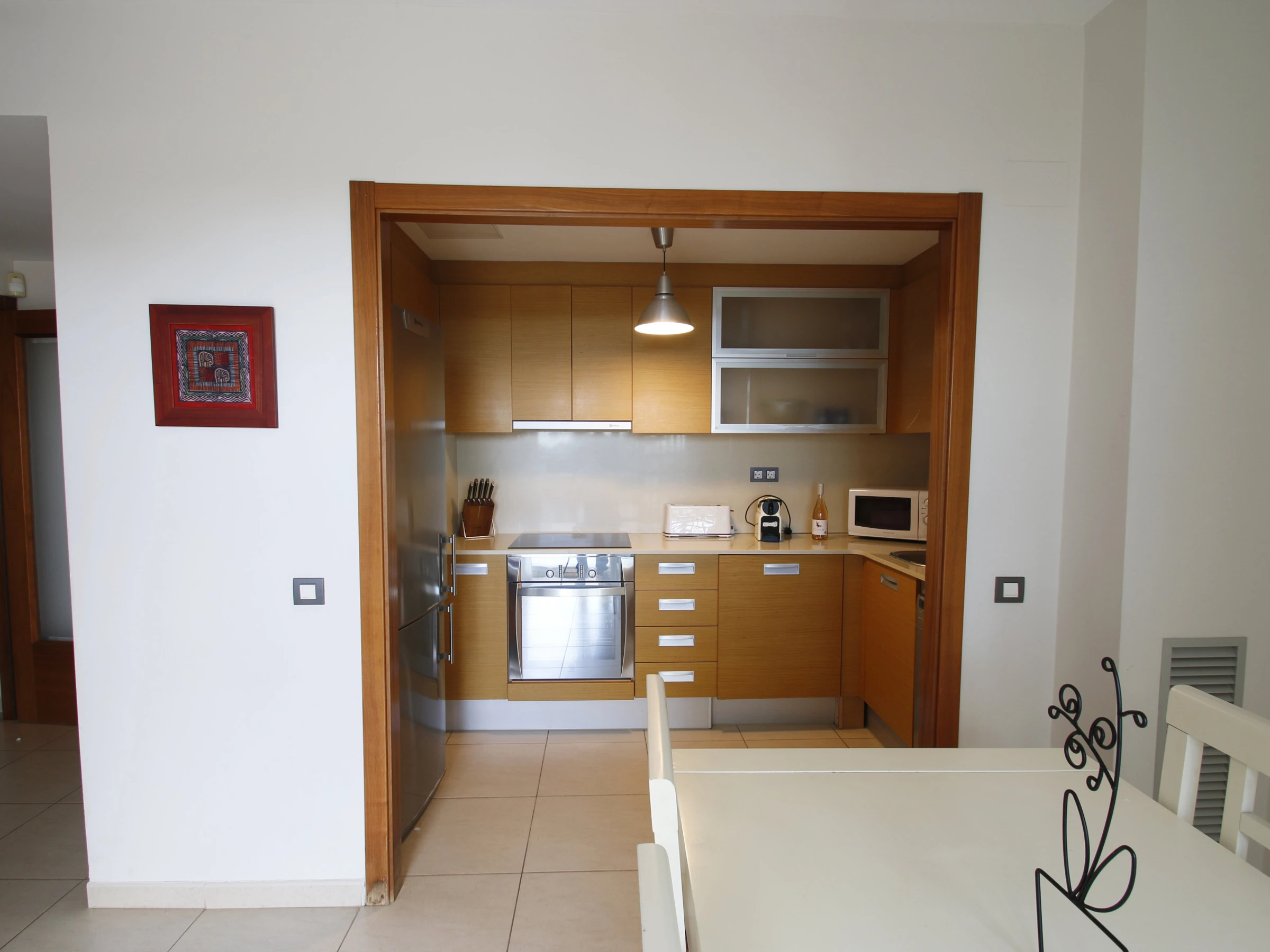 La cocina americana cuenta con vitrocerámica, horno, microondas, lavavajillas, nevera, congelador, cafetera, tostadora y menaje completo, ofreciendo total autonomía durante la estancia.
