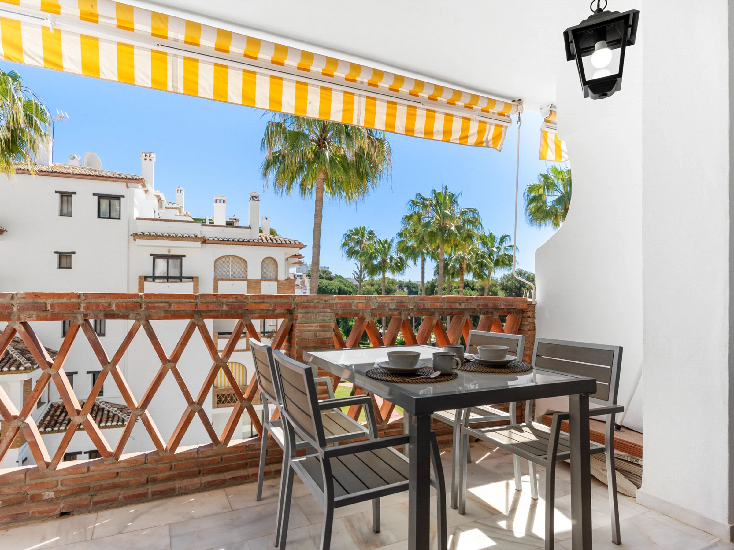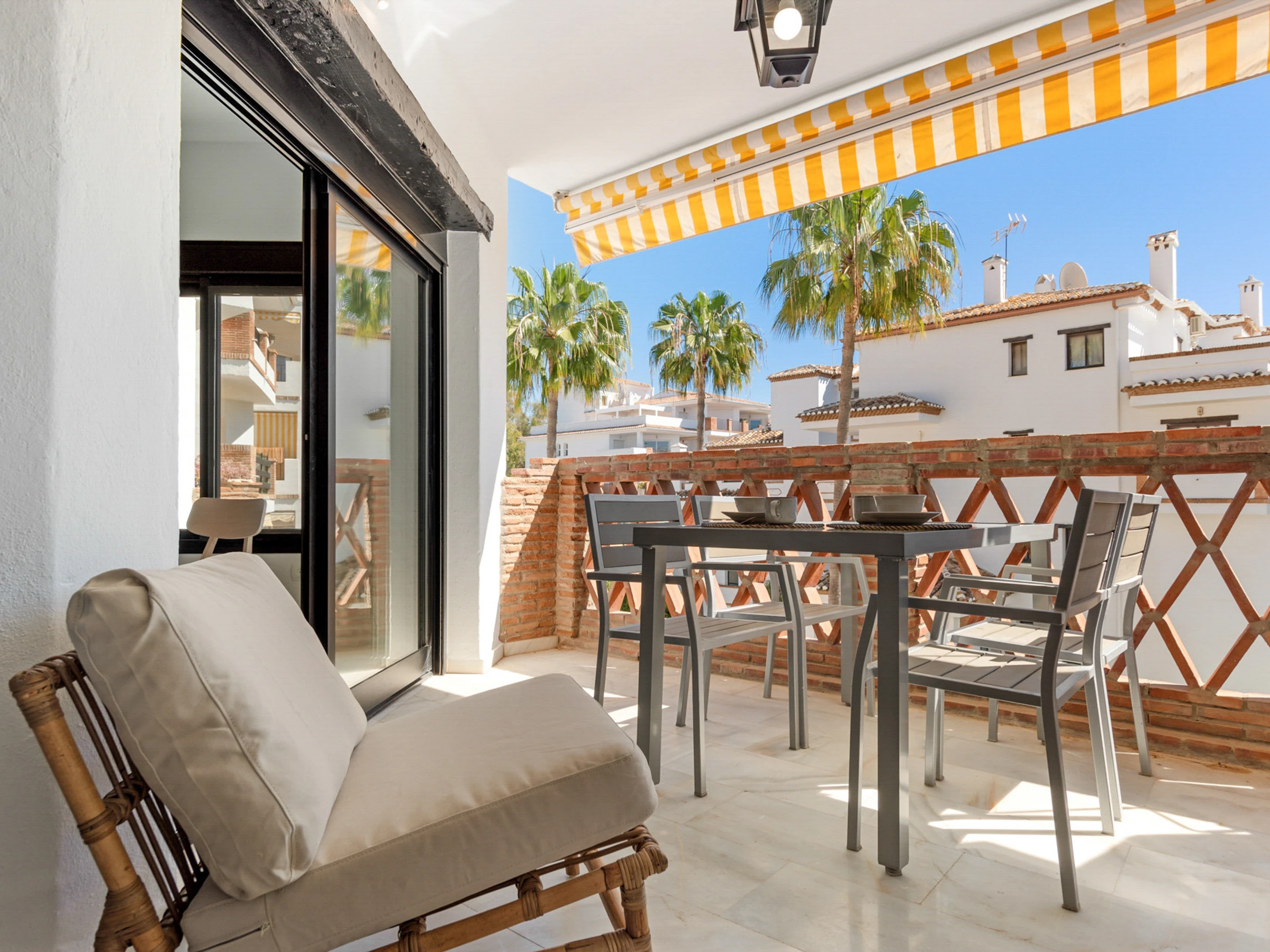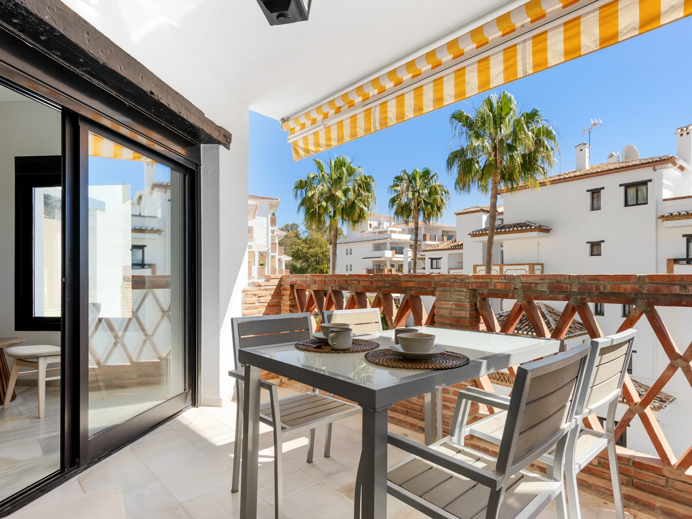 Disfruta del lado más suave de la Costa del Sol desde la hermosa terraza, donde puedes relajarte bajo la cálida luz otoñal y disfrutar del entorno tranquilo.