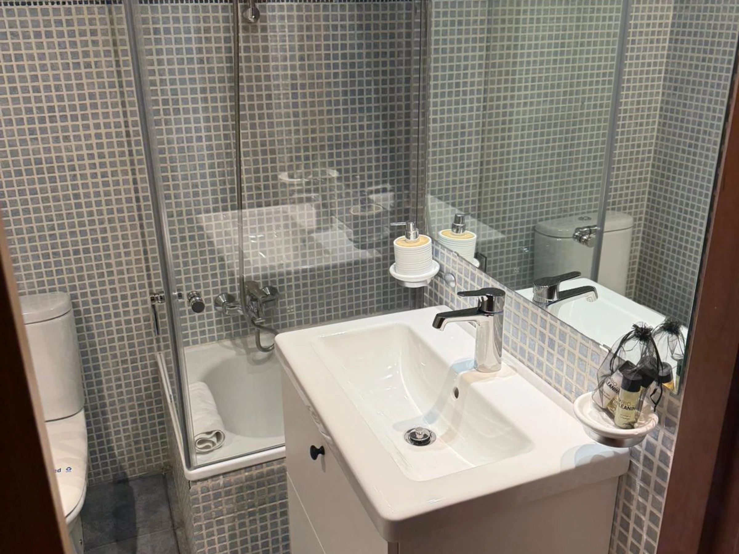 - Baño con ducha, bañera, gel de cuerpo y champú, toallas y secador de pelo.