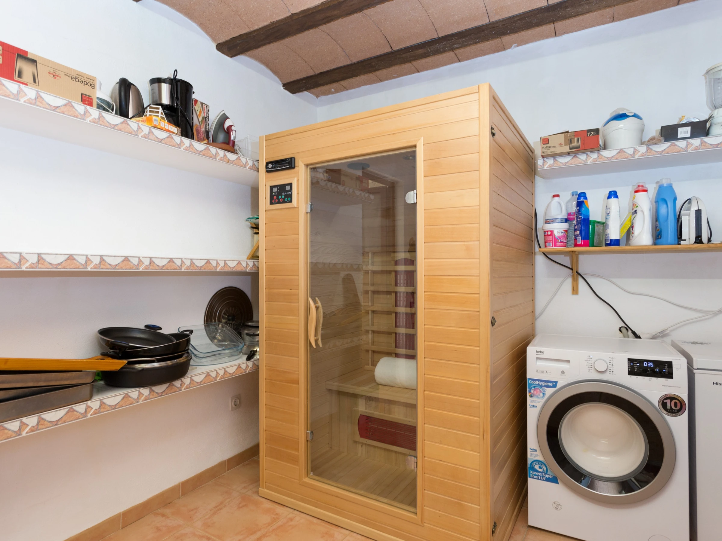 En esta preciosa casa rústica pero moderna disfrutarás del ambiente campestre del interior de Mallorca pero estando muy cerca de todo. La impresionante piscina de cloro, realmente grande, de 12 x 5 metros con una profundidad de 0,7 a 1,9 metros está rodeada por una hermosa terraza con varias tumbonas para disfrutar del sol. Esta parte está vallada del resto de la terraza. Un lugar ideal para familias con niños pequeños. Varias mesas y hamacas invitan al relax junto a la zona amueblada con sofás y antiguas mecedoras restauradas desde donde disfrutar del atardecer, y una mesa rústica y original en la que comer o cenar al aire libre los deliciosos platos cocinados en la barbacoa que está a vuestra disposición. . Hay una mesa de ping-pong, una canasta de baloncesto, una cama elástica y una sauna para relajarse después de practicar deporte. Toda la parcela de 3400 m2 está completamente vallada, y aunque hay algunos vecinos en los alrededores, podrás disfrutar de tu privacidad.