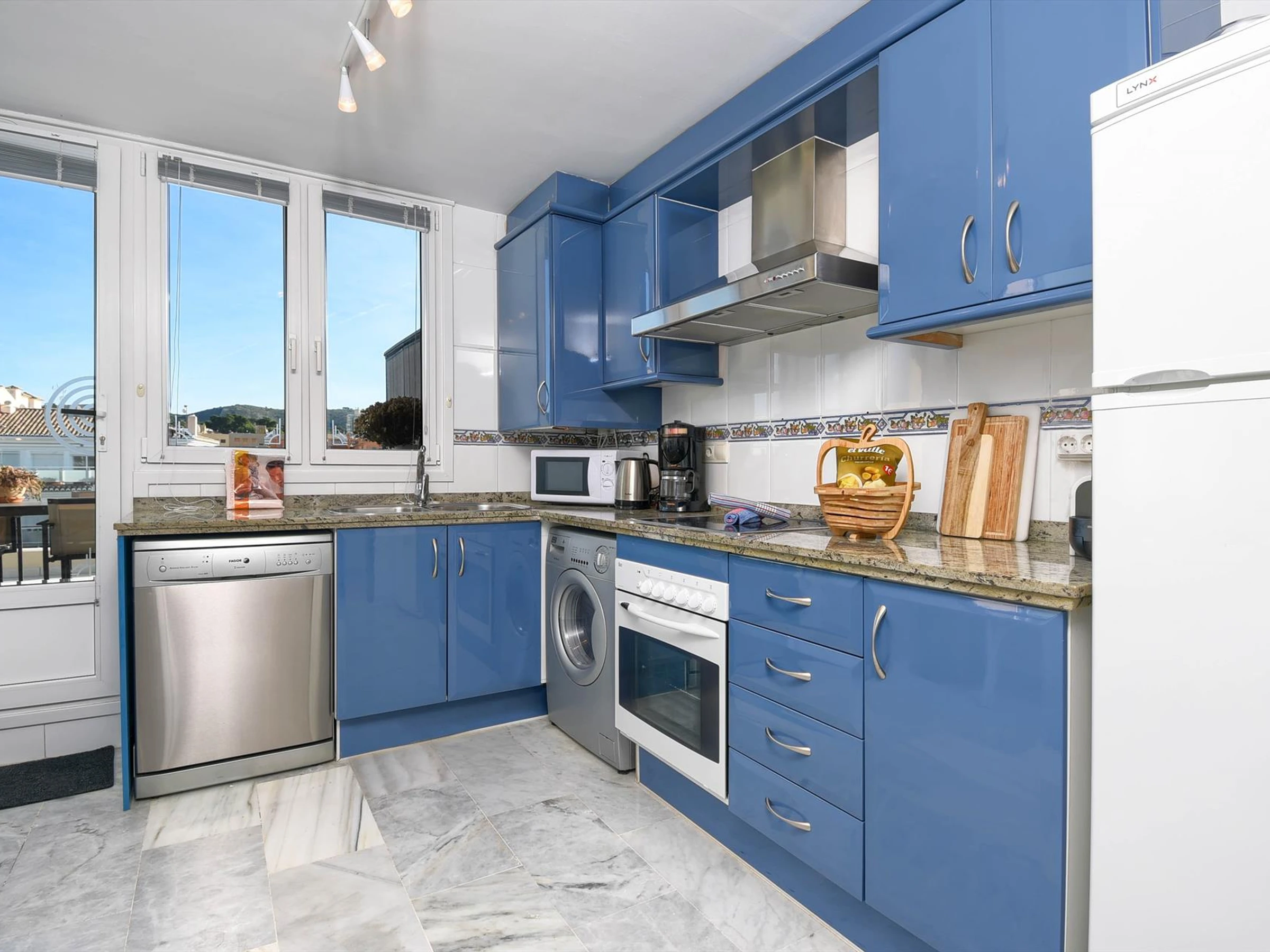 Cocinacocina abierta con vitrocerámica, horno eléctrico, lavavajillas, frigorífico-congelador, cafetera, hervidor eléctrico, batidora, tostadora y exprimidor.