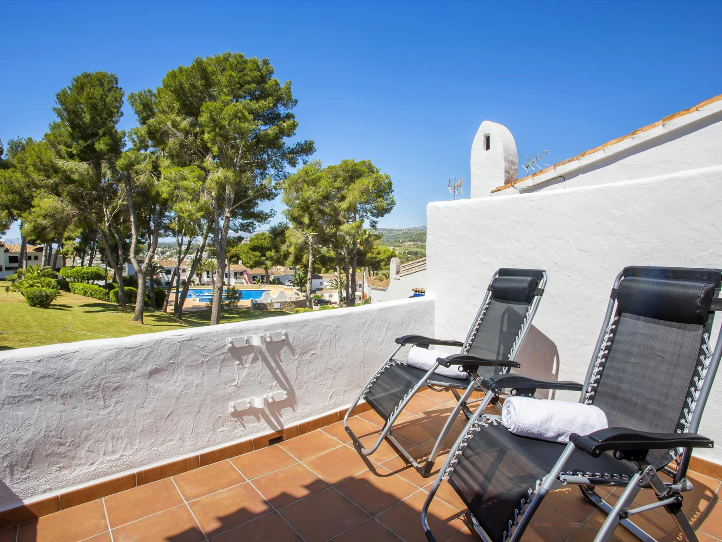 Cómoda casa de vacaciones en Moraira, Costa Blanca, España con piscina comunitaria para 4 personas. La casa está situada en una zona costera, arbolada y residencial, a 3 km de la playa.