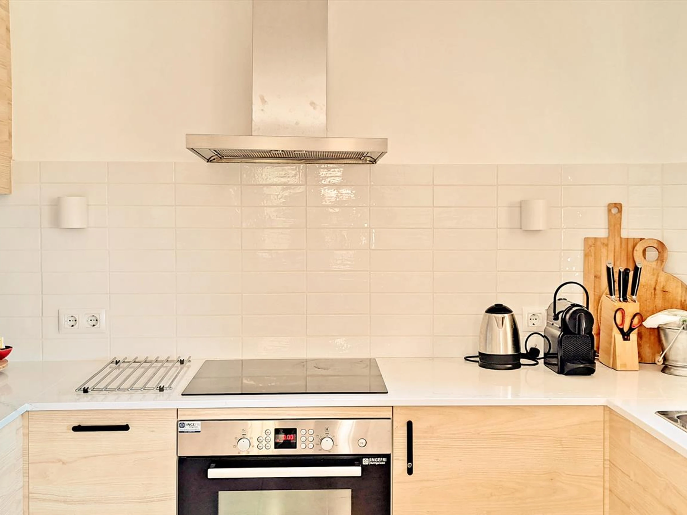 * cocina abierta con cocina de inducción, horno eléctrico, microondas,