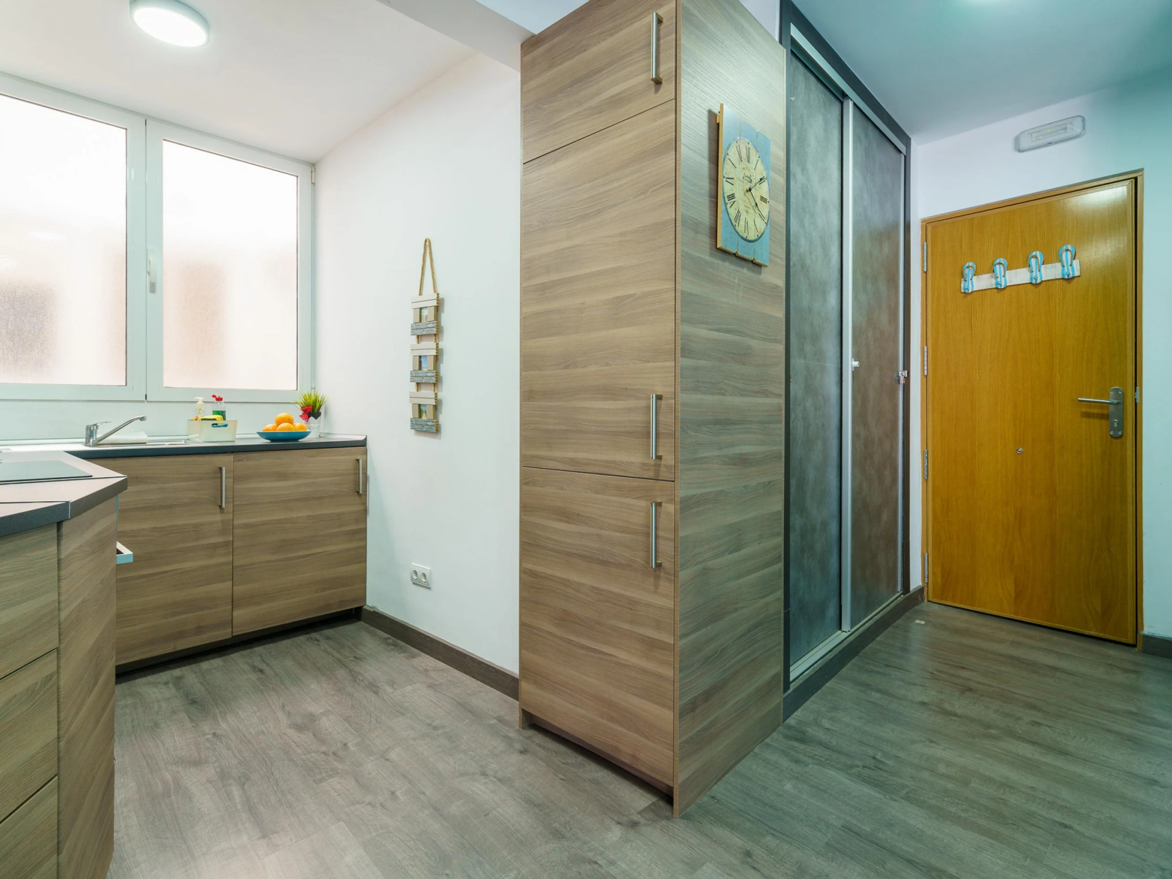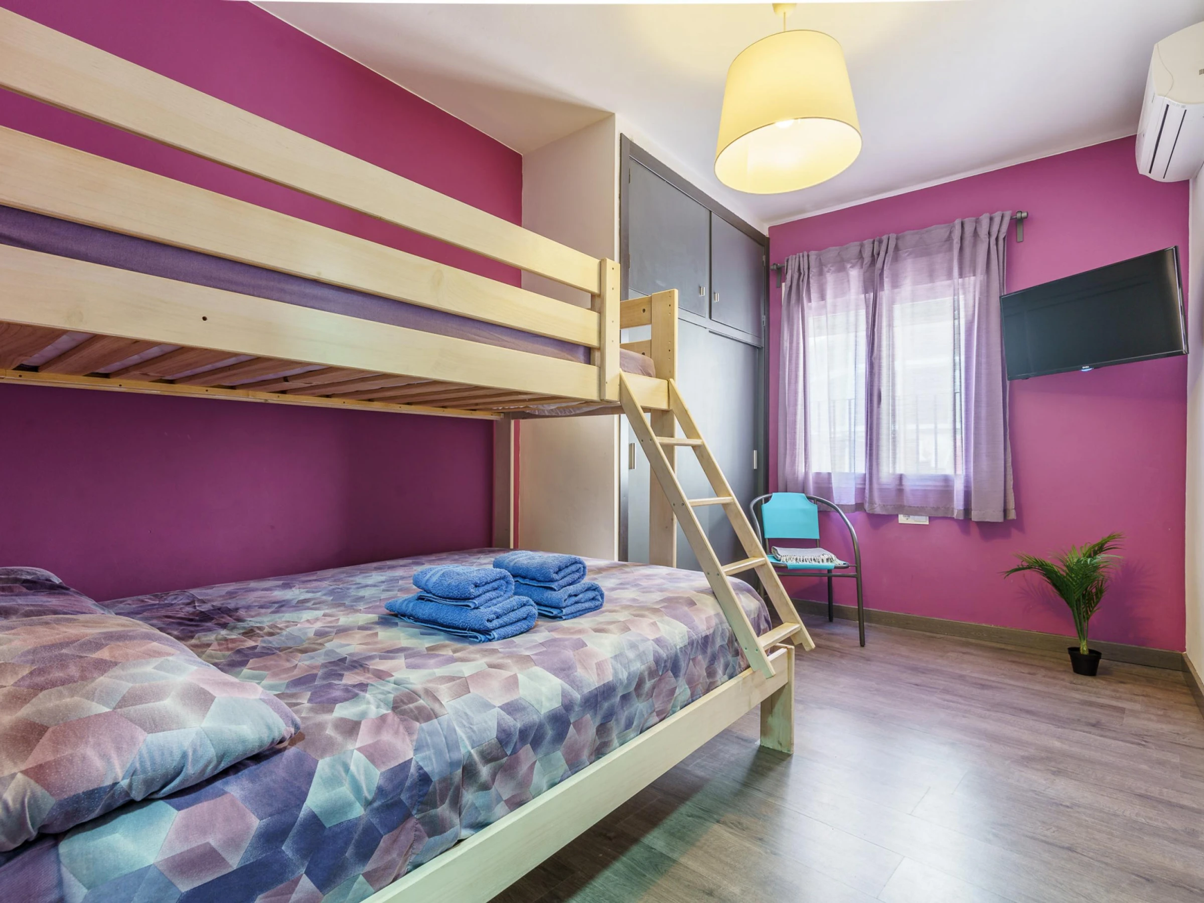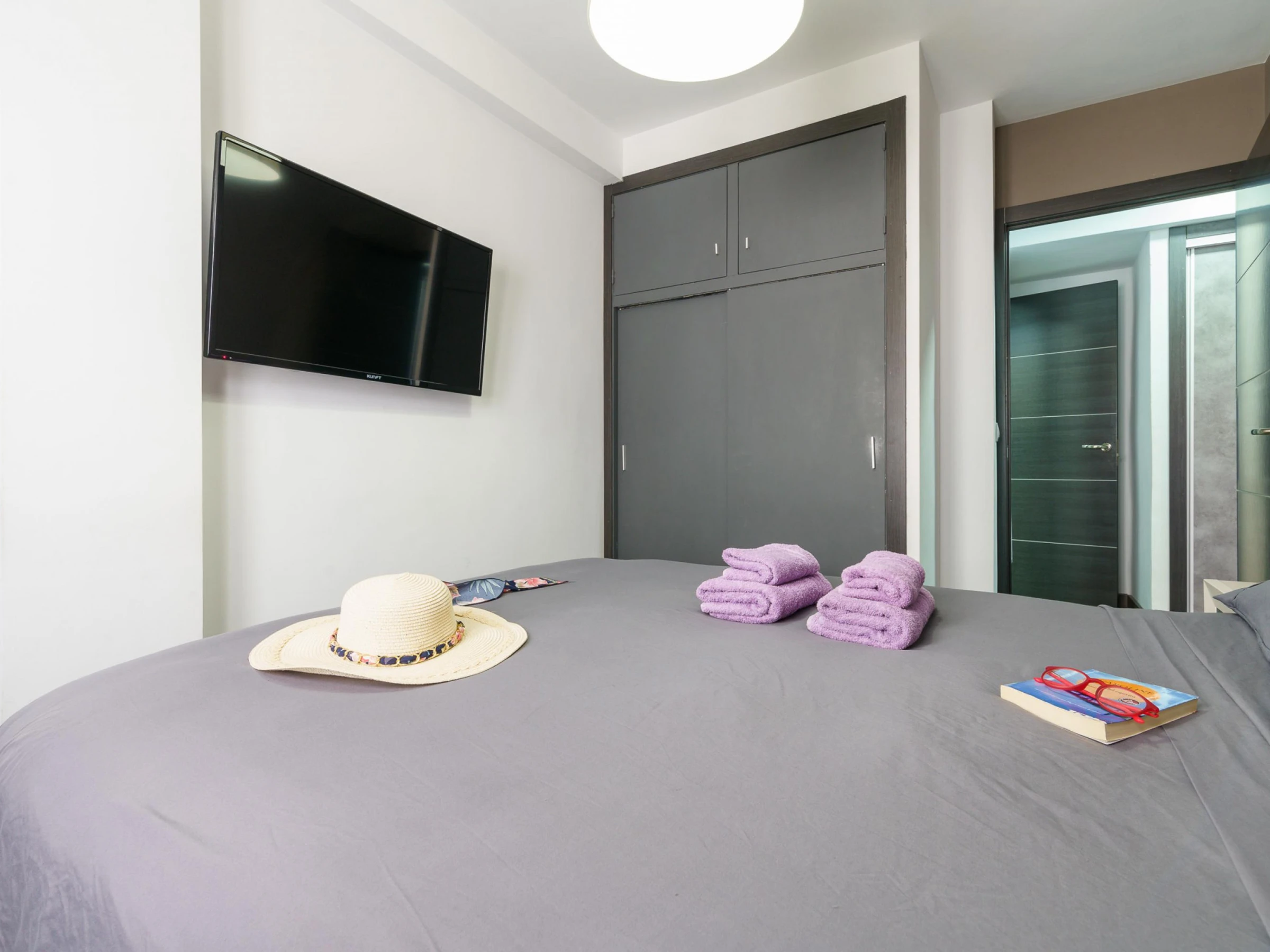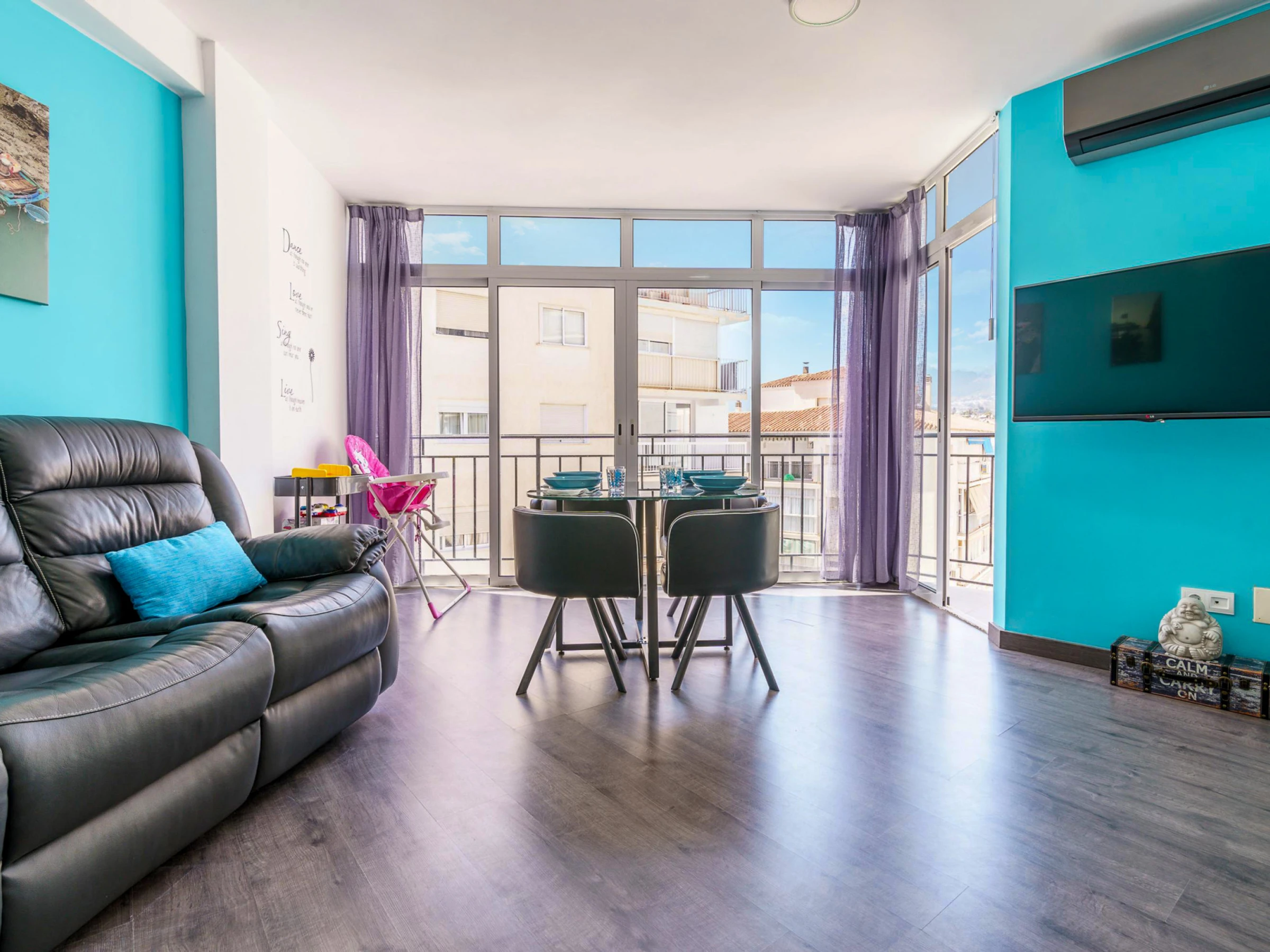 El moderno apartamento del quinto piso cuenta con una sala de estar con aire acondicionado, puertas de cristal del suelo al techo, sofás de cuero, una gran Smart-TV, comedor interior y acceso directo a un balcón. La cocina integrada incluye barra americana, lavavajillas, horno, microondas y cafetera. El dormitorio principal tiene una cama doble y TV de pantalla plana, mientras que el dormitorio triple tiene literas y una cama individual. El moderno cuarto de baño incluye ducha y WC.