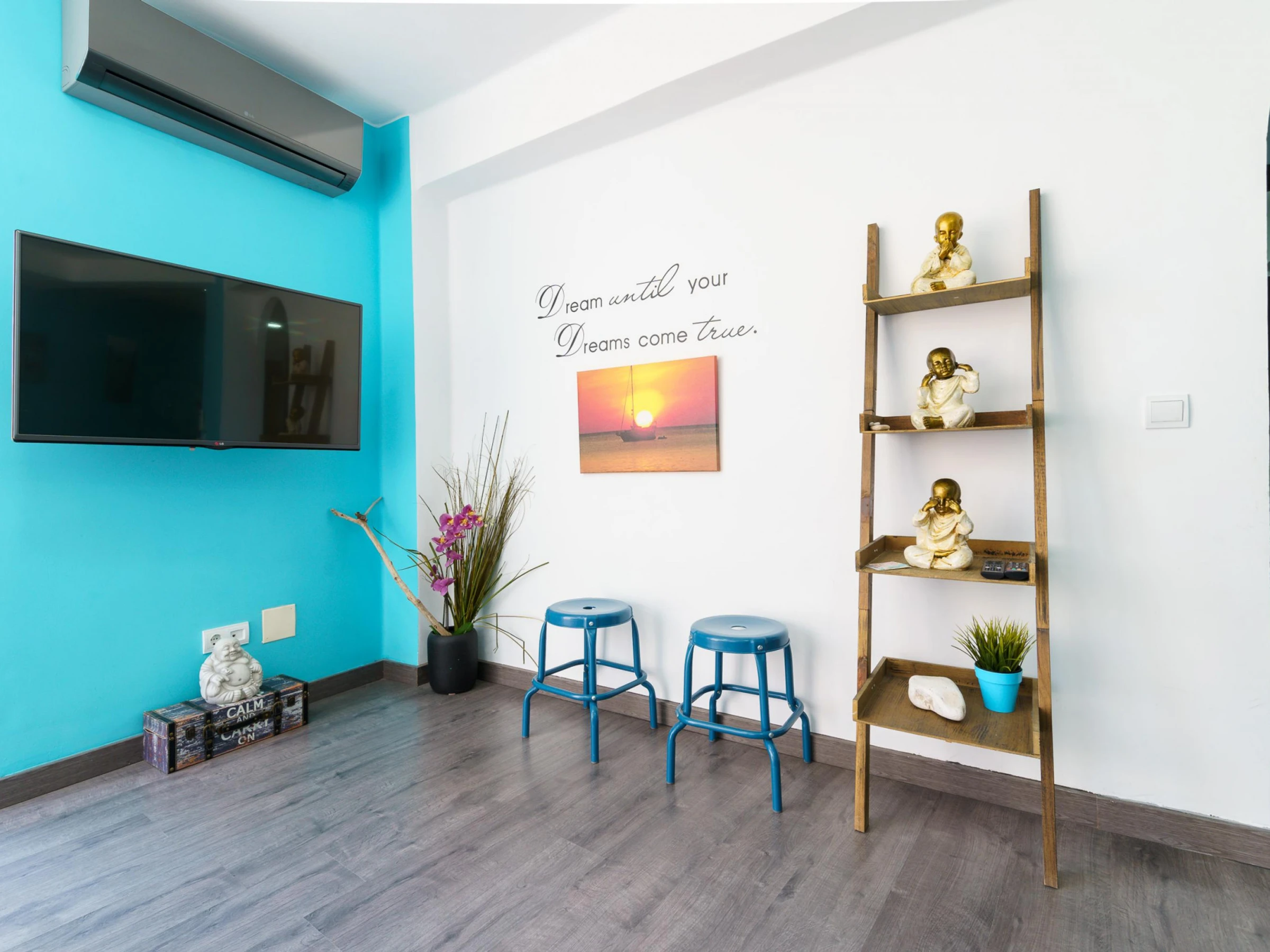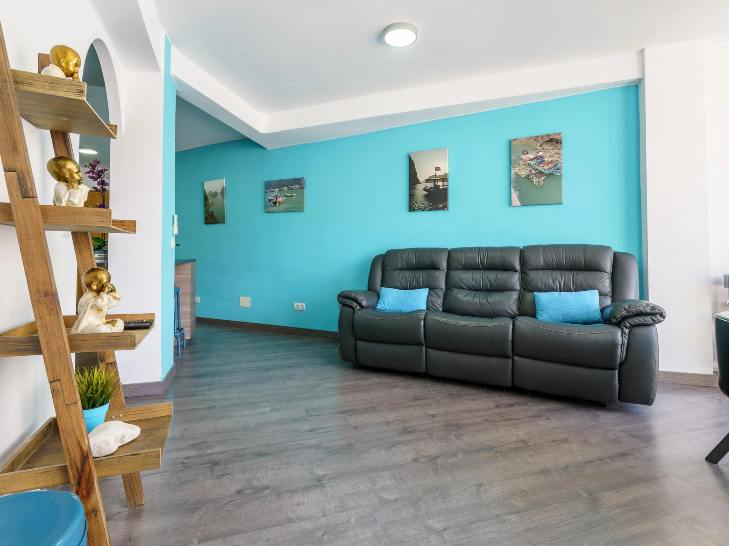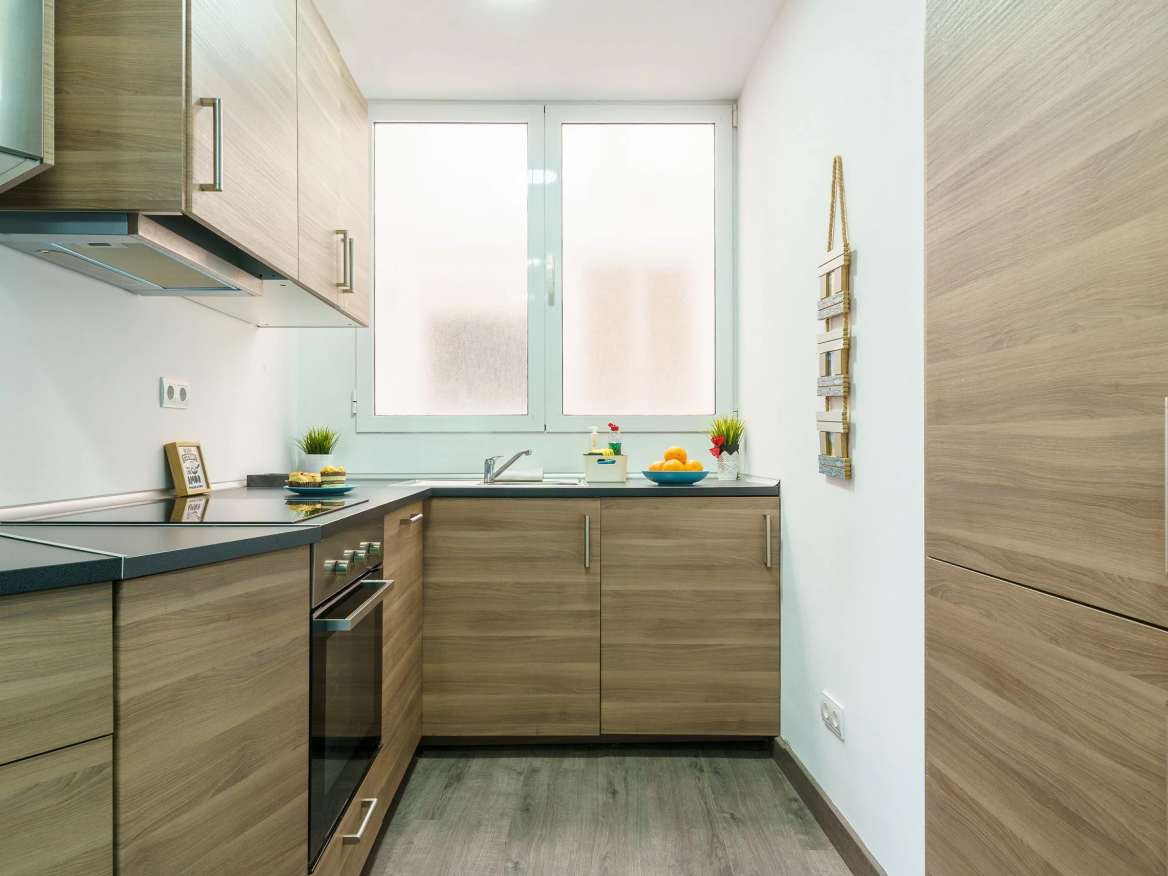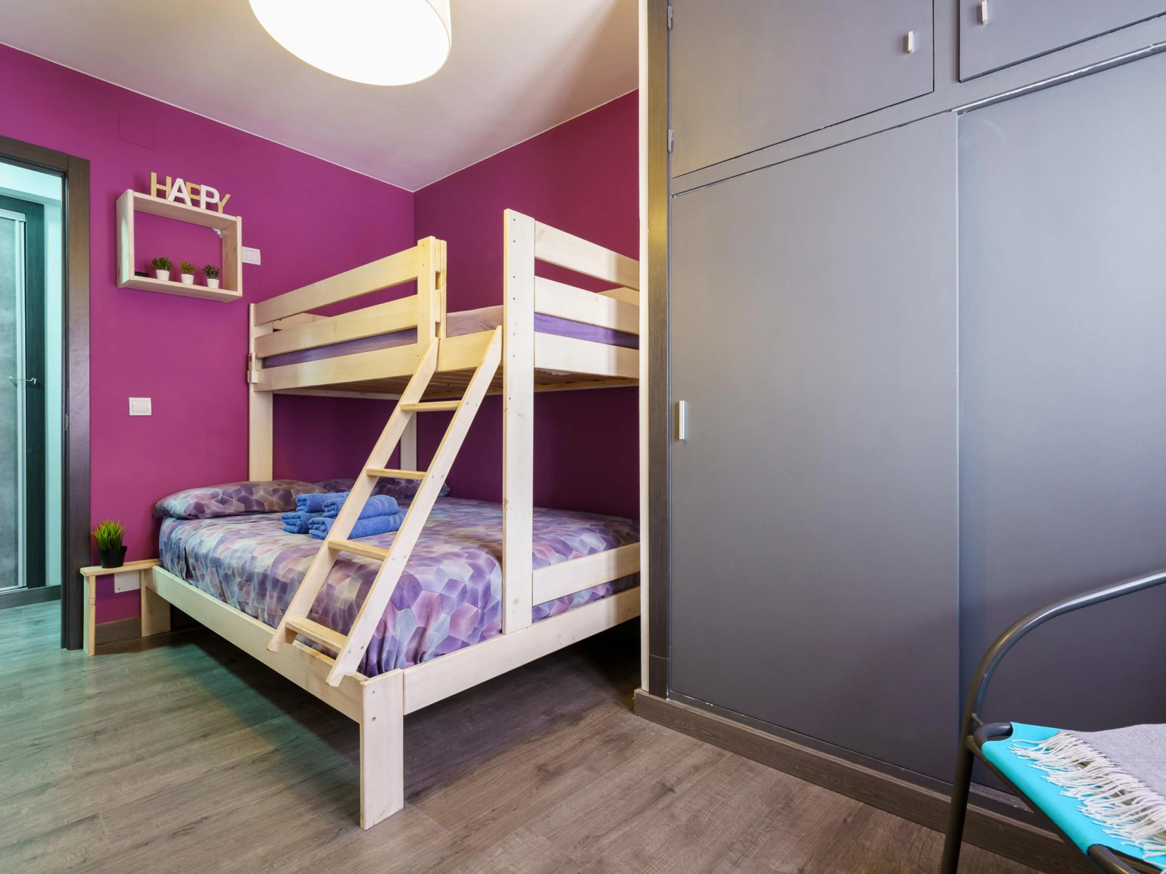 El moderno apartamento del quinto piso cuenta con una sala de estar con aire acondicionado, puertas de cristal del suelo al techo, sofás de cuero, una gran Smart-TV, comedor interior y acceso directo a un balcón. La cocina integrada incluye barra americana, lavavajillas, horno, microondas y cafetera. El dormitorio principal tiene una cama doble y TV de pantalla plana, mientras que el dormitorio triple tiene literas y una cama individual. El moderno cuarto de baño incluye ducha y WC.