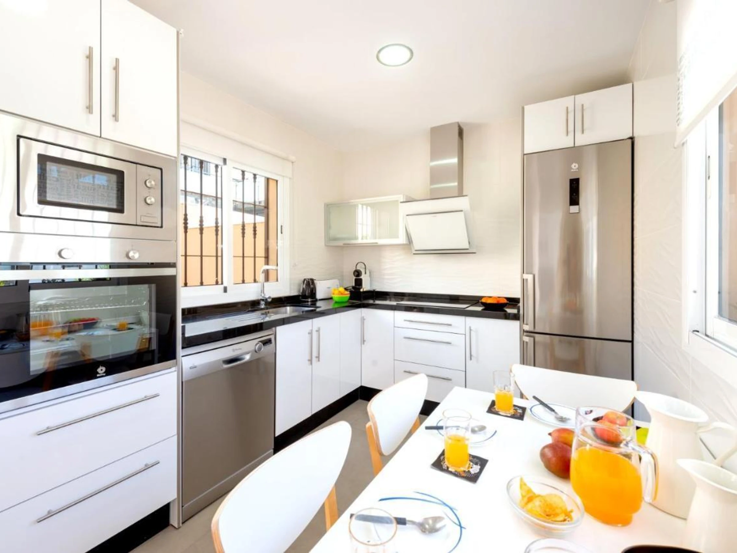 La cocina, está equipada con nevera, microondas, horno, congelador, lavavajillas, cafetera y tostadora.