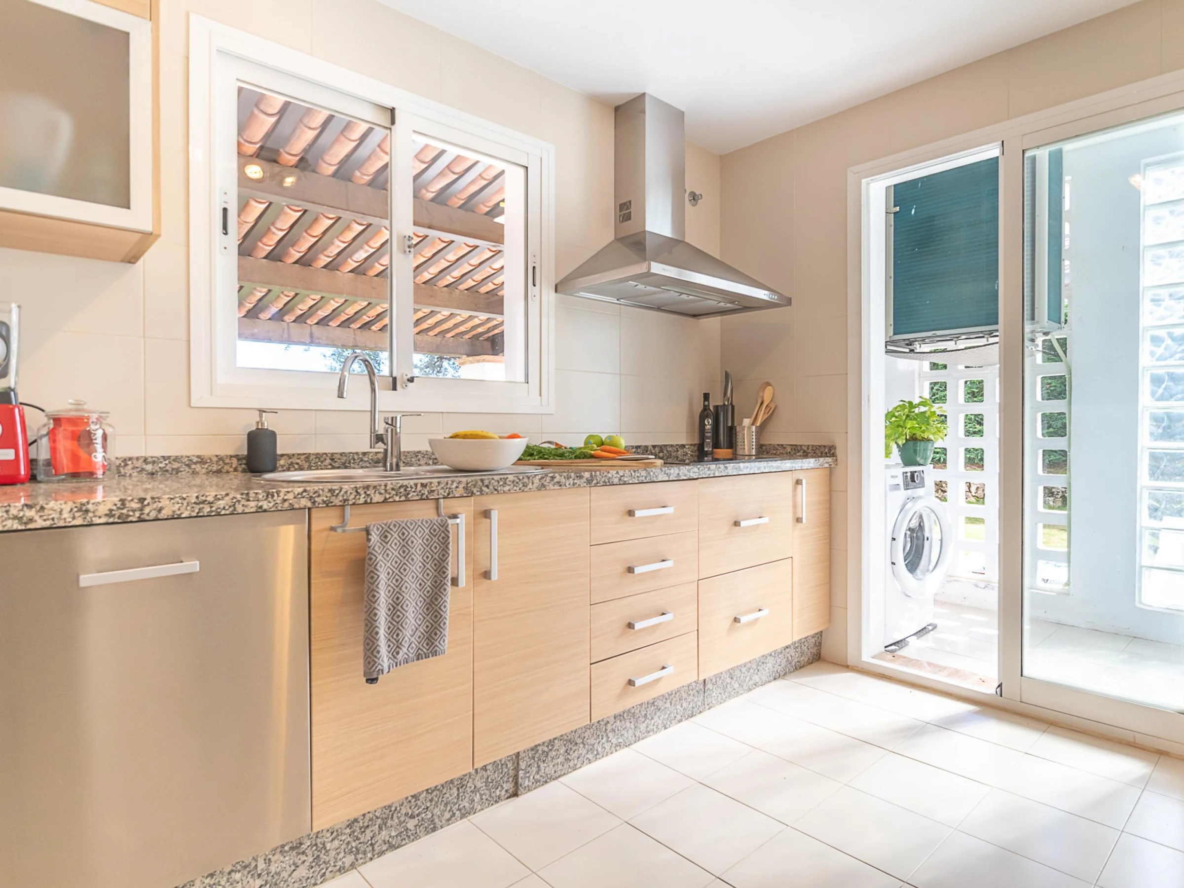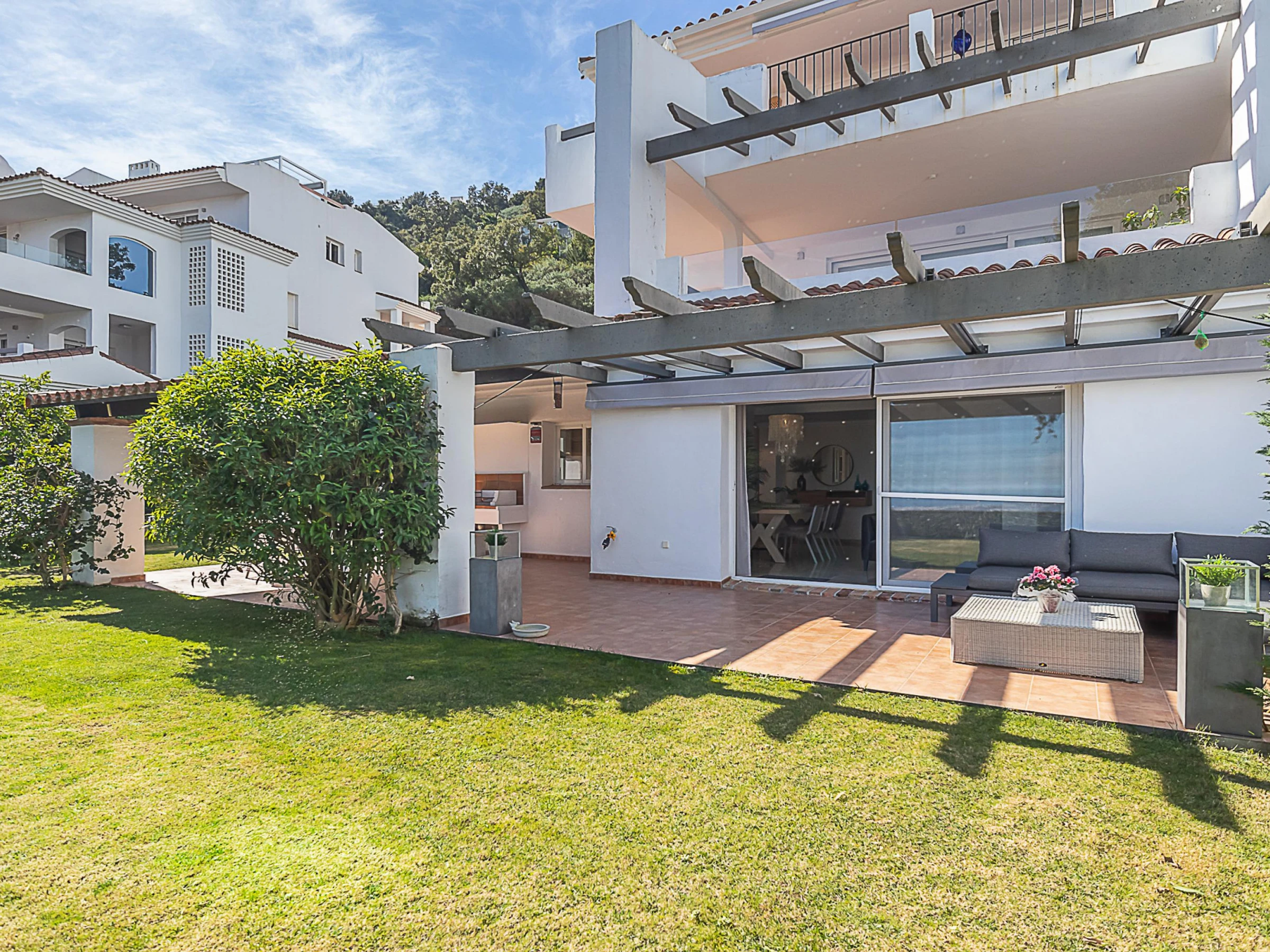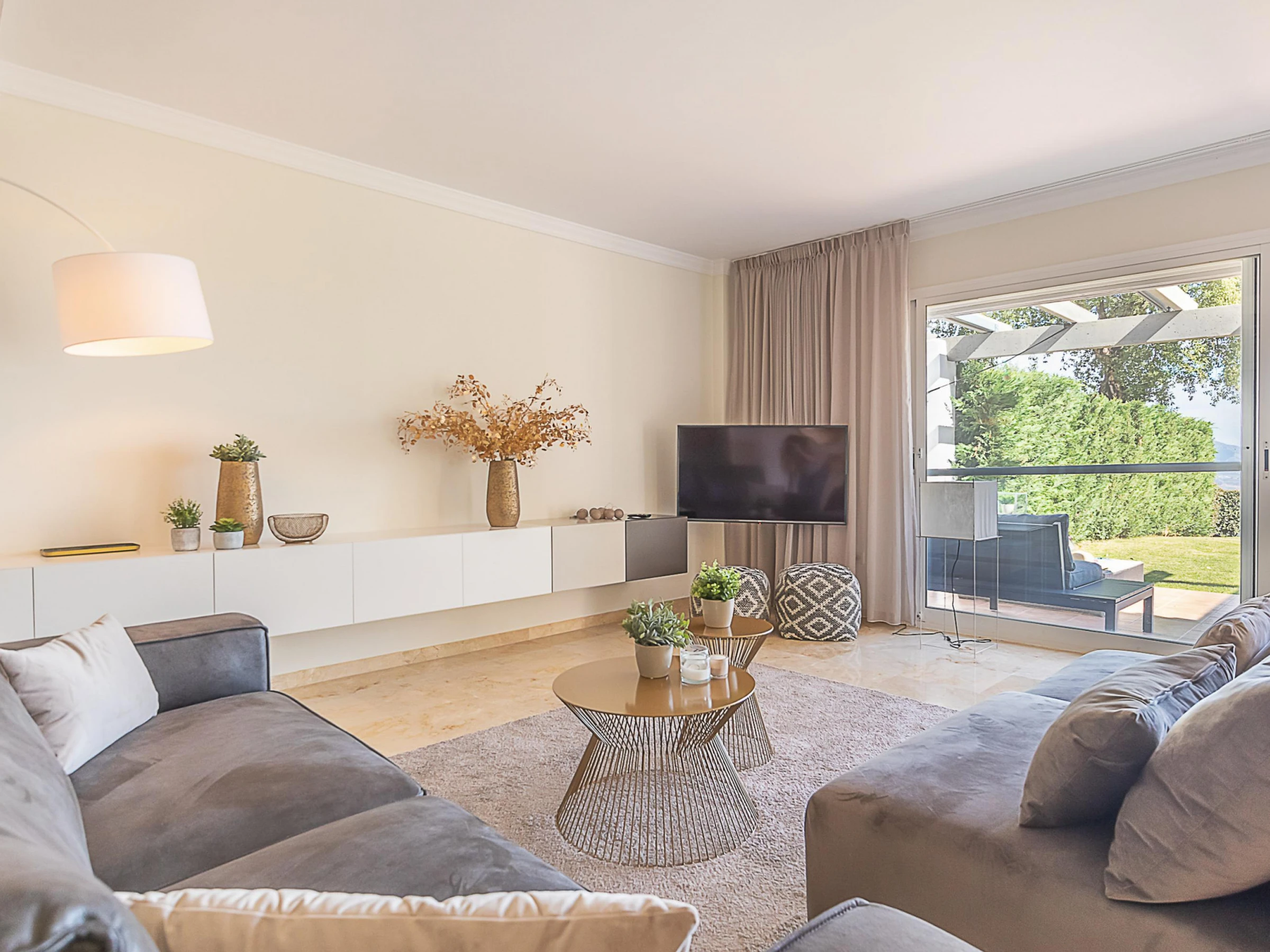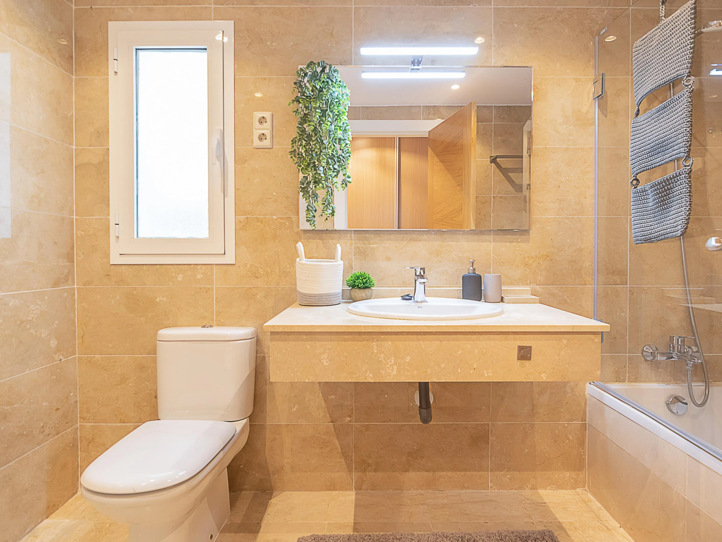 El maravilloso apartamento en la planta baja tiene un gran jardín donde los huéspedes tienen acceso a una piscina compartida, un gran jardín que gusta especialmente a los niños. Hay un hermoso espacio con un cómodo sofá para disfrutar de las vistas y relajarse. La terraza está cubierta y es un auténtico placer cenar aquí al aire libre o simplemente descansar en el gran sofá. La sala de estar tiene una configuración premium con una decoración súper moderna. Hay una elaborada zona de estar y un comedor. La cocina está separada y cuidadosamente diseñada para brindar a los huéspedes el máximo confort mientras cocinan. Está equipada con lavavajillas, cafetera, microondas, placa de inducción, tostadora y nevera. Se abre al área de lavandería.