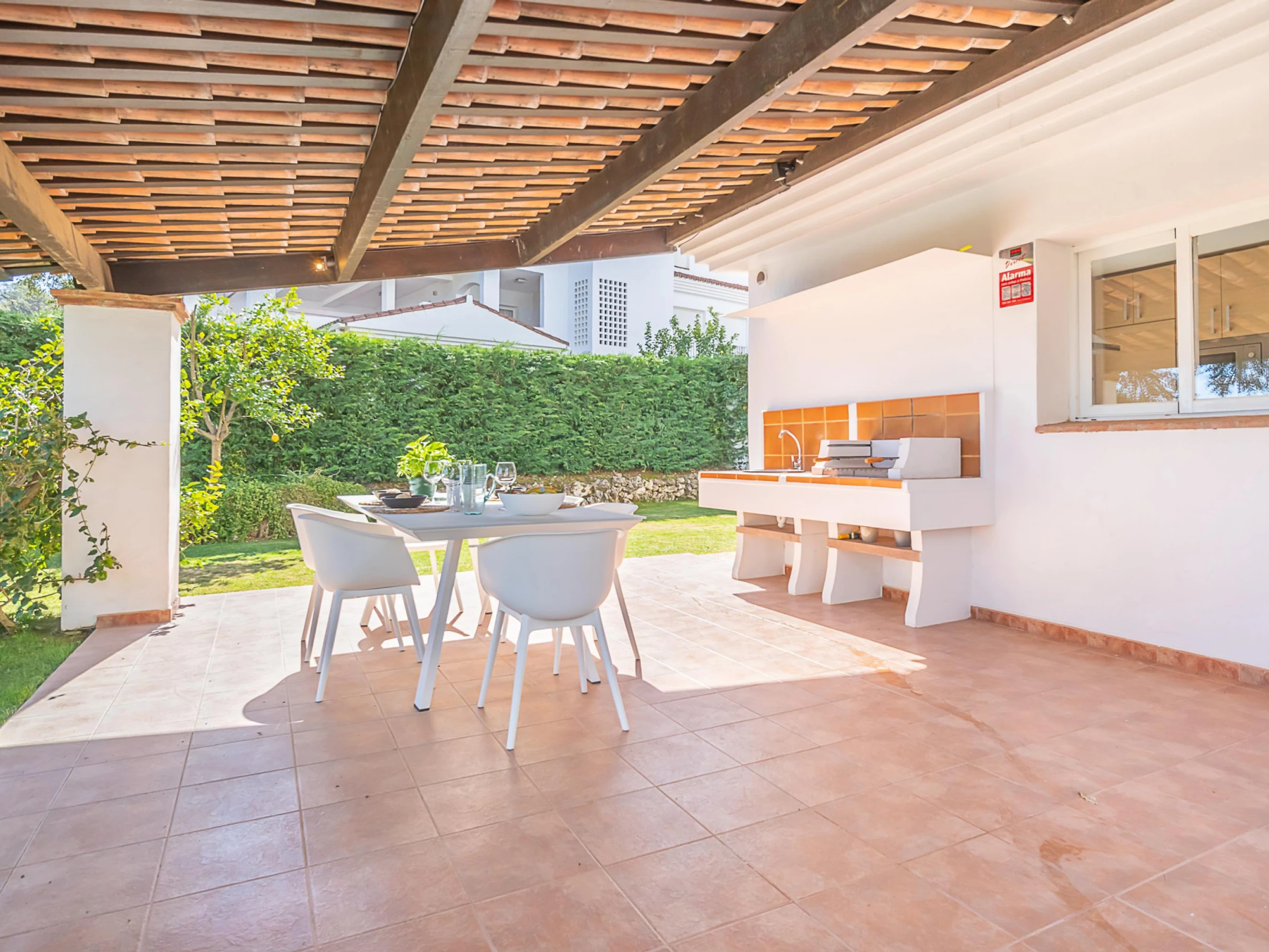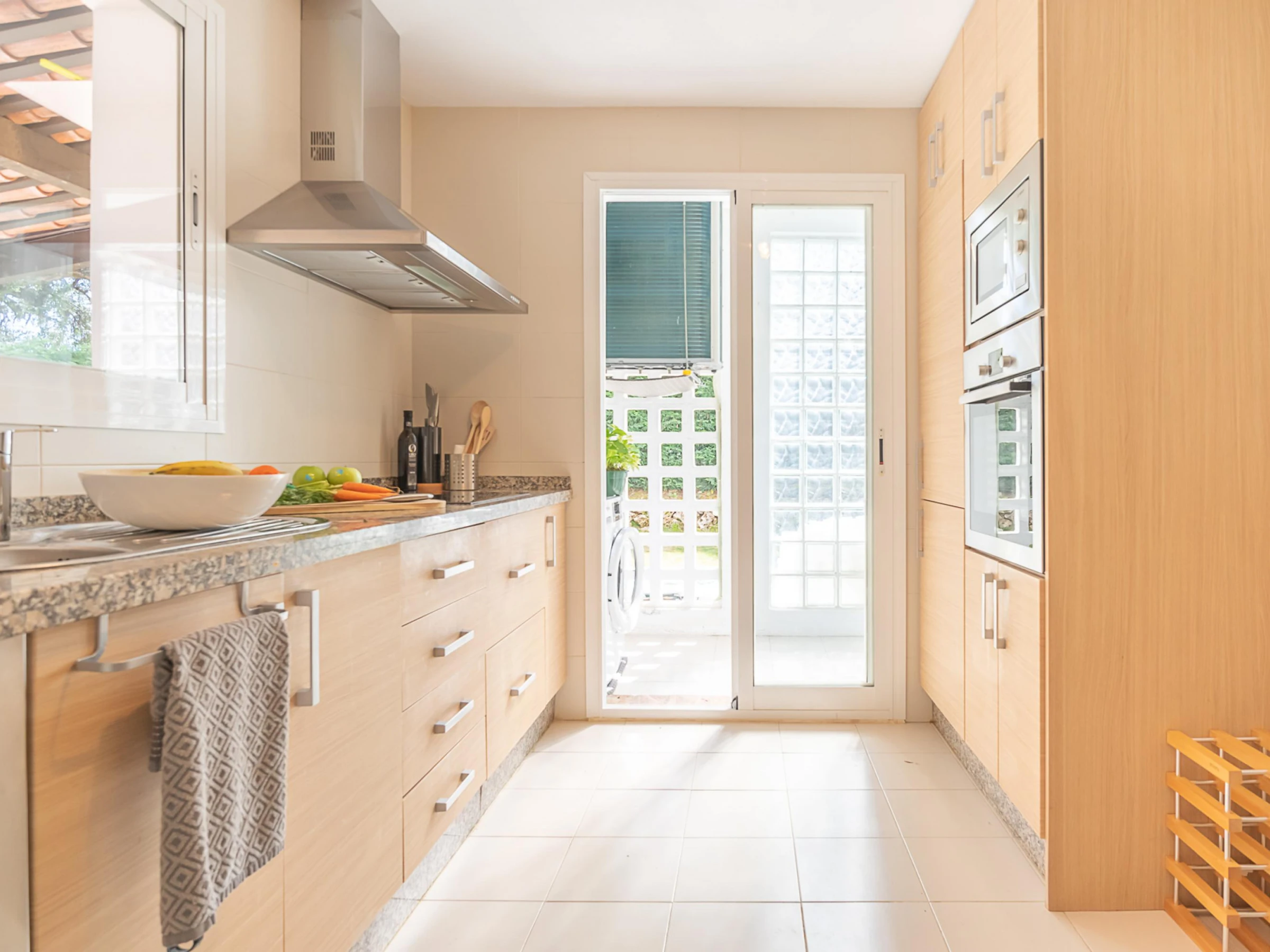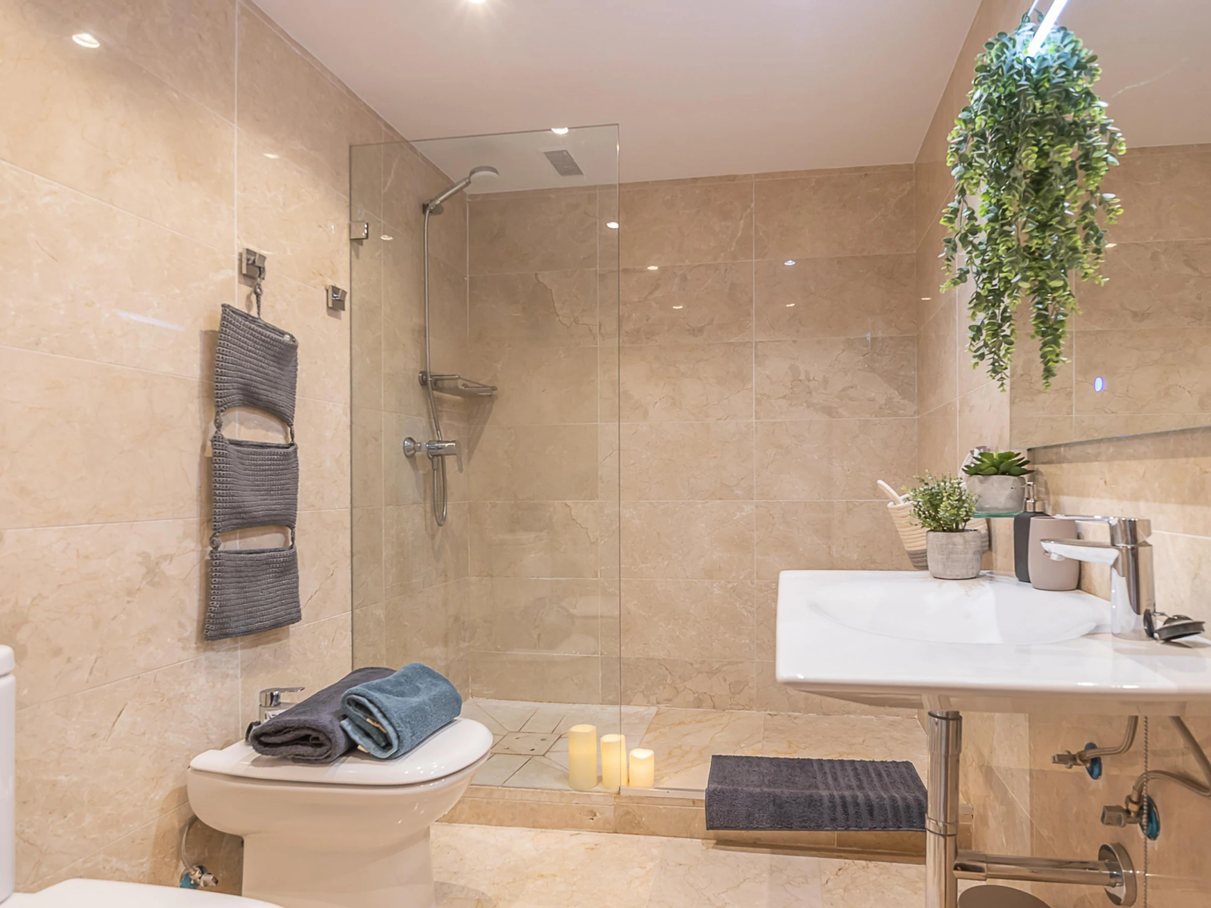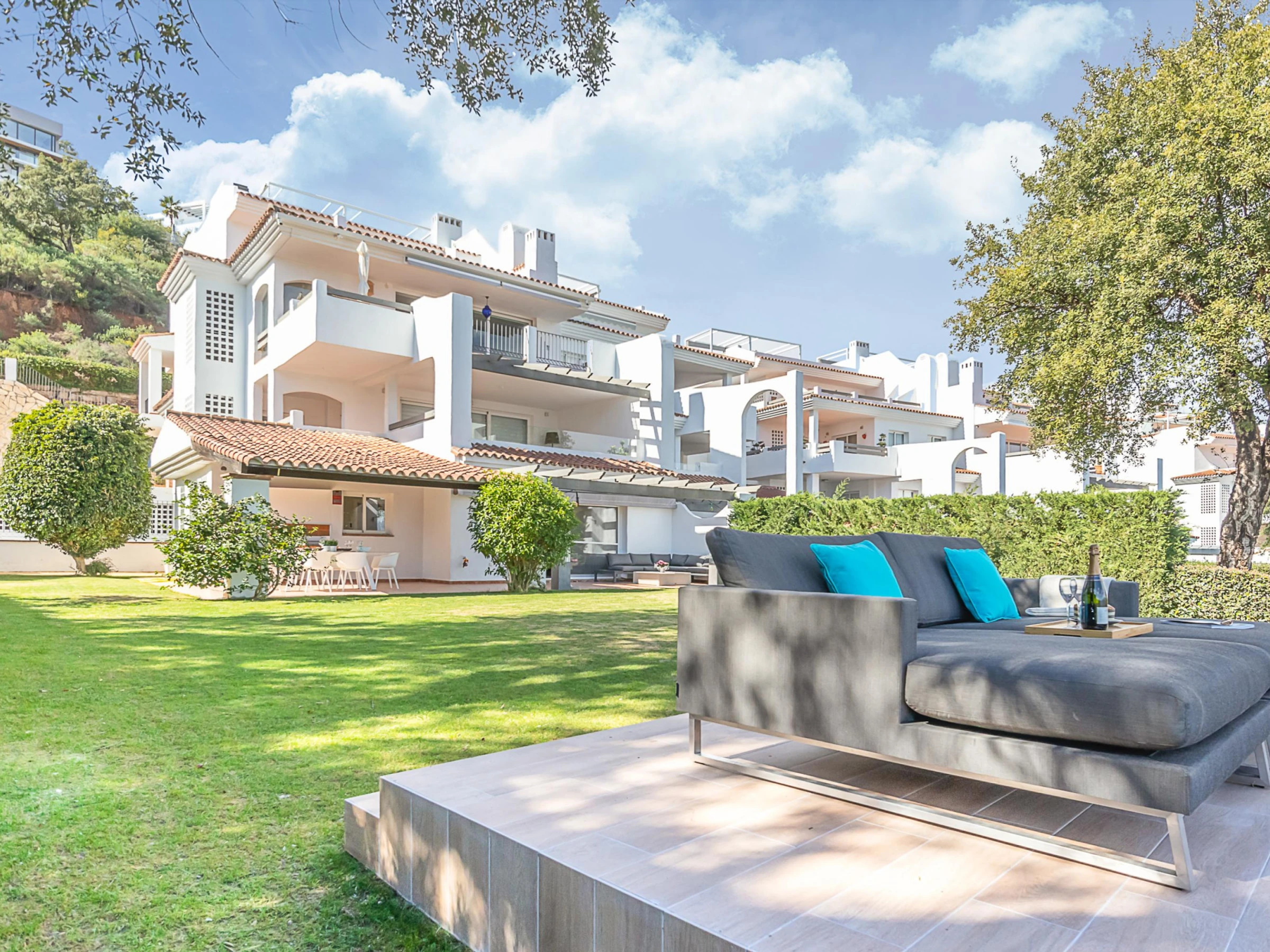 El maravilloso apartamento en la planta baja tiene un gran jardín donde los huéspedes tienen acceso a una piscina compartida, un gran jardín que gusta especialmente a los niños. Hay un hermoso espacio con un cómodo sofá para disfrutar de las vistas y relajarse. La terraza está cubierta y es un auténtico placer cenar aquí al aire libre o simplemente descansar en el gran sofá. La sala de estar tiene una configuración premium con una decoración súper moderna. Hay una elaborada zona de estar y un comedor. La cocina está separada y cuidadosamente diseñada para brindar a los huéspedes el máximo confort mientras cocinan. Está equipada con lavavajillas, cafetera, microondas, placa de inducción, tostadora y nevera. Se abre al área de lavandería.
