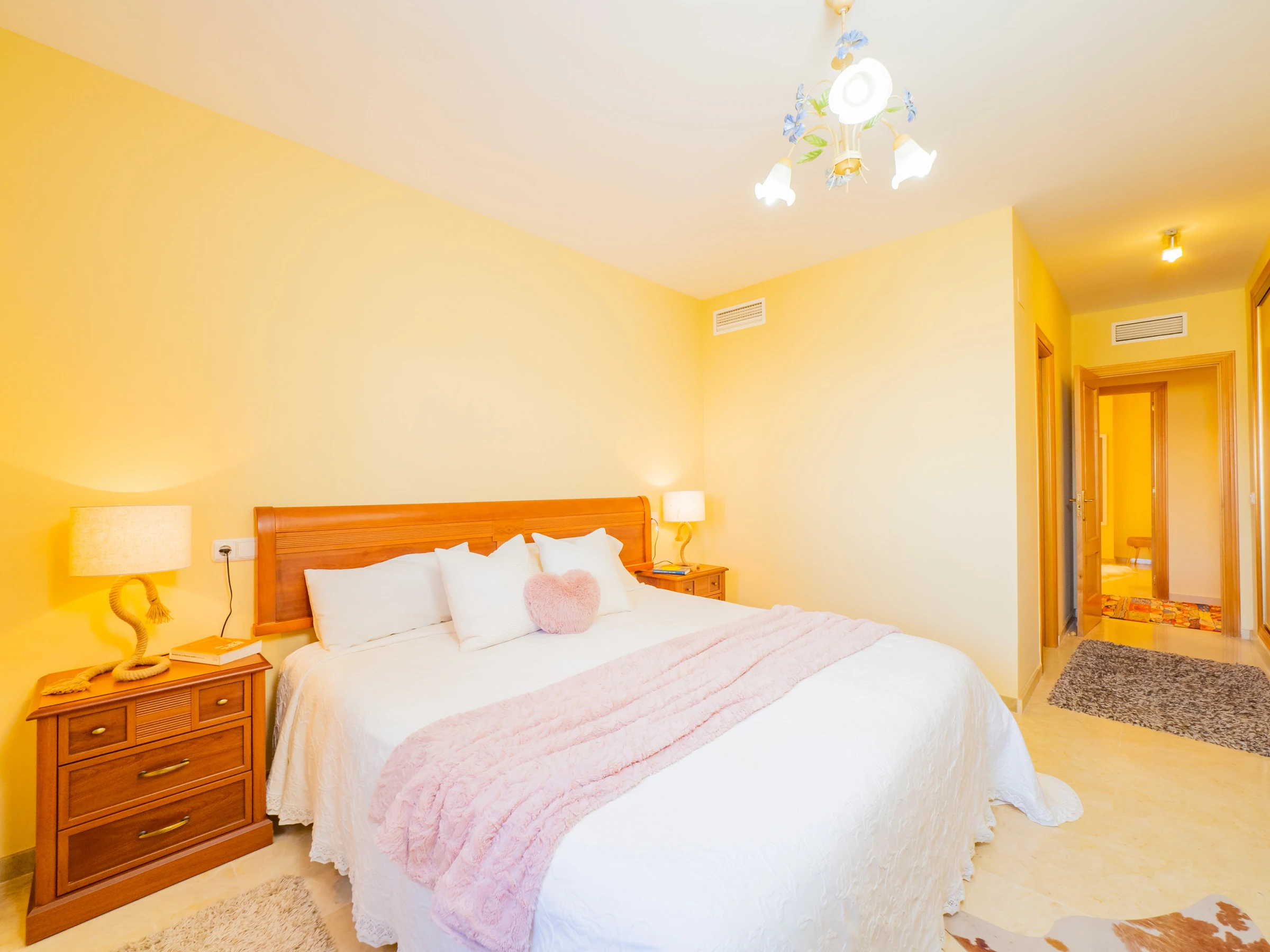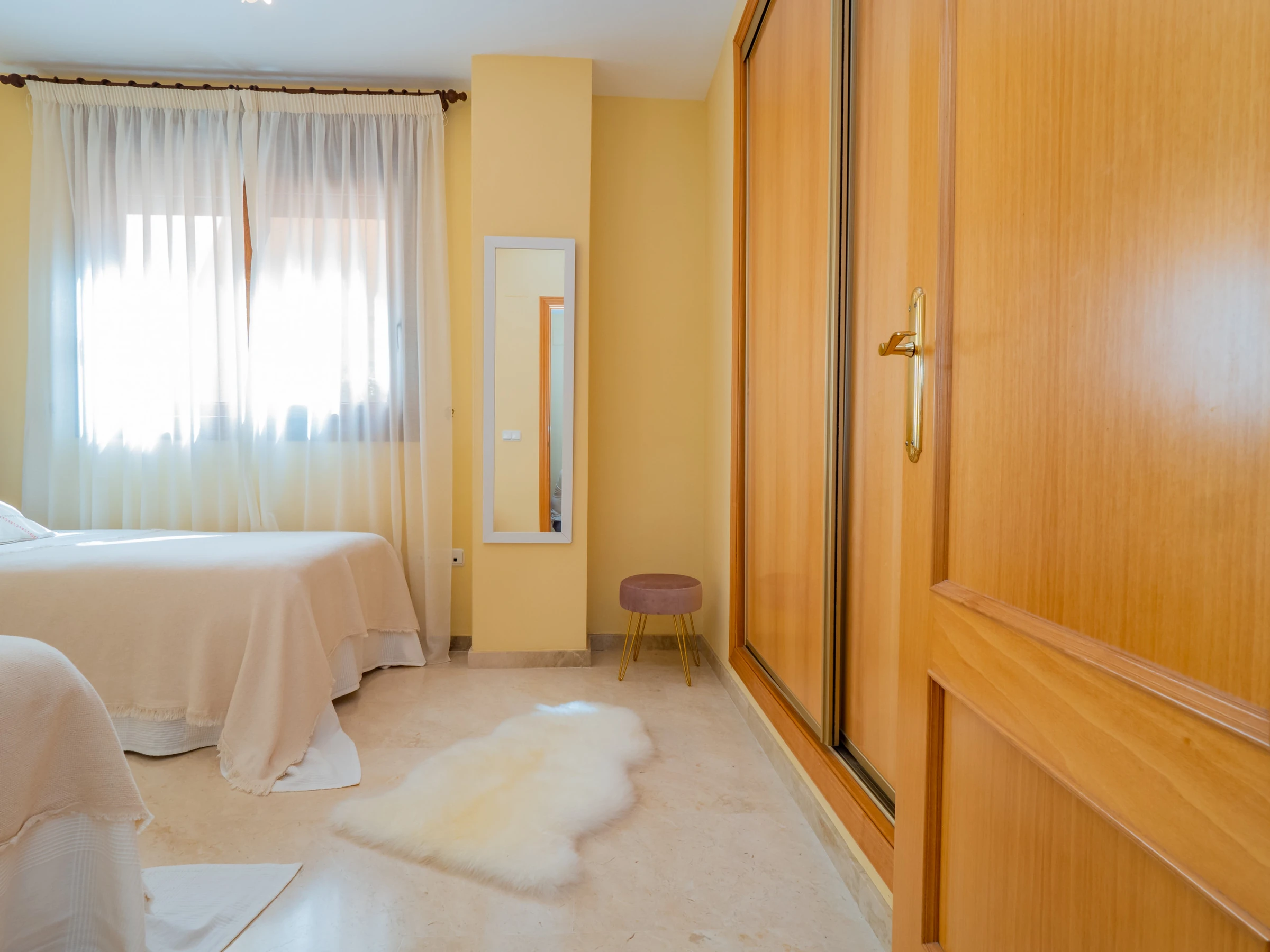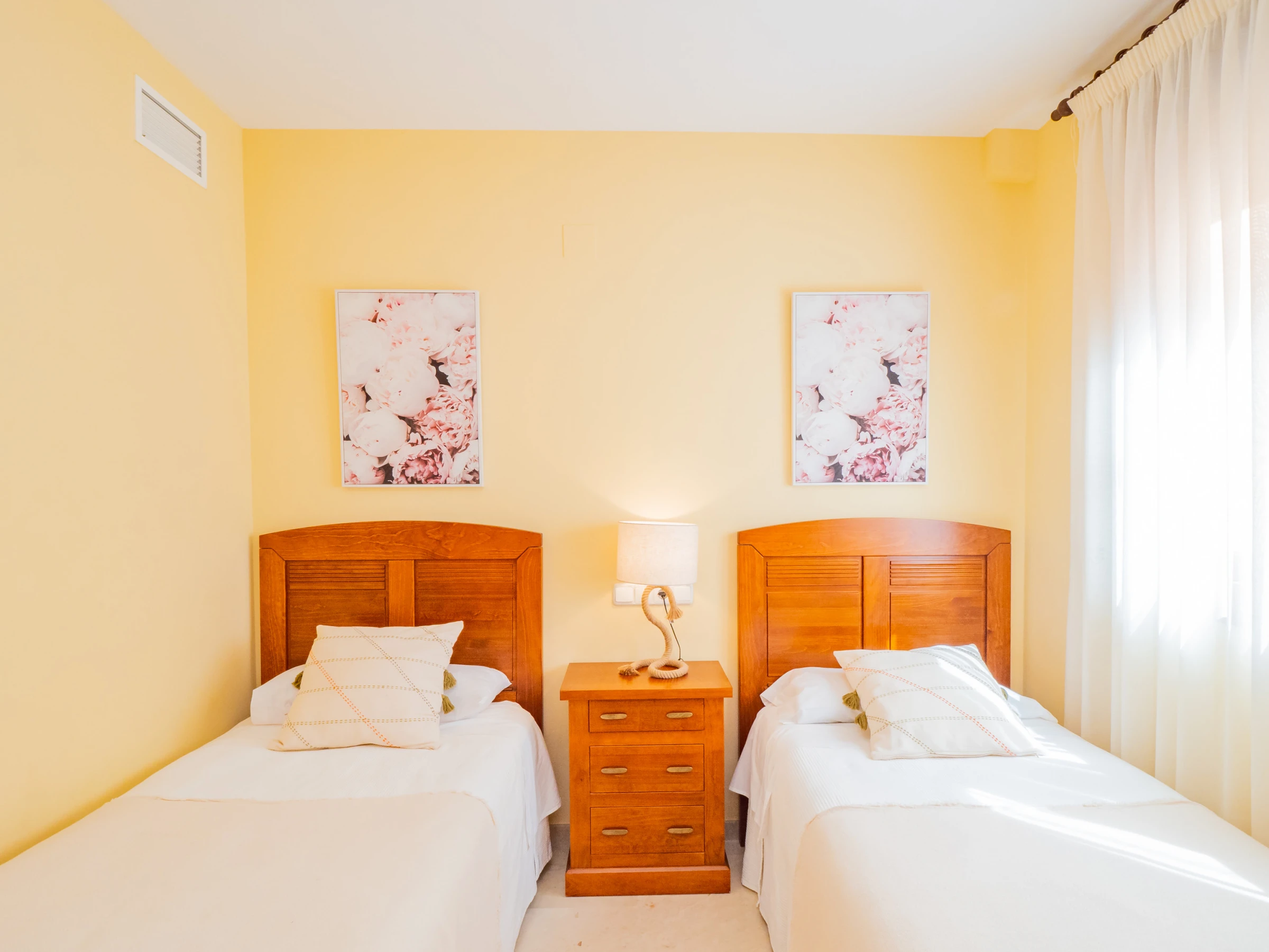 El apartamento dispone de dos dormitorios con capacidad para 4 personas: uno con cama de matrimonio y televisión, y otro con dos camas individuales. Ambos dormitorios tienen ventanas al exterior y suficiente espacio para guardar el equipaje. El baño completo incluye bañera. El aire acondicionado centralizado garantiza confort durante todo el año. Además, el alojamiento tiene wifi y una plaza de parking cubierta incluida en el mismo edificio.