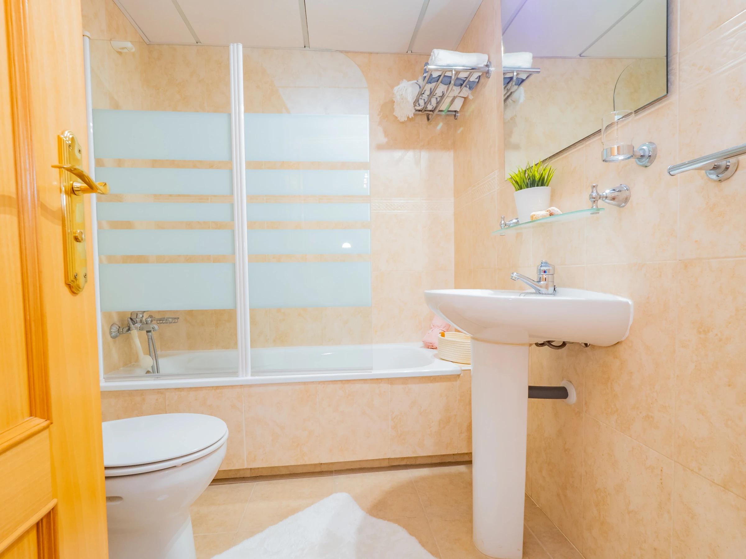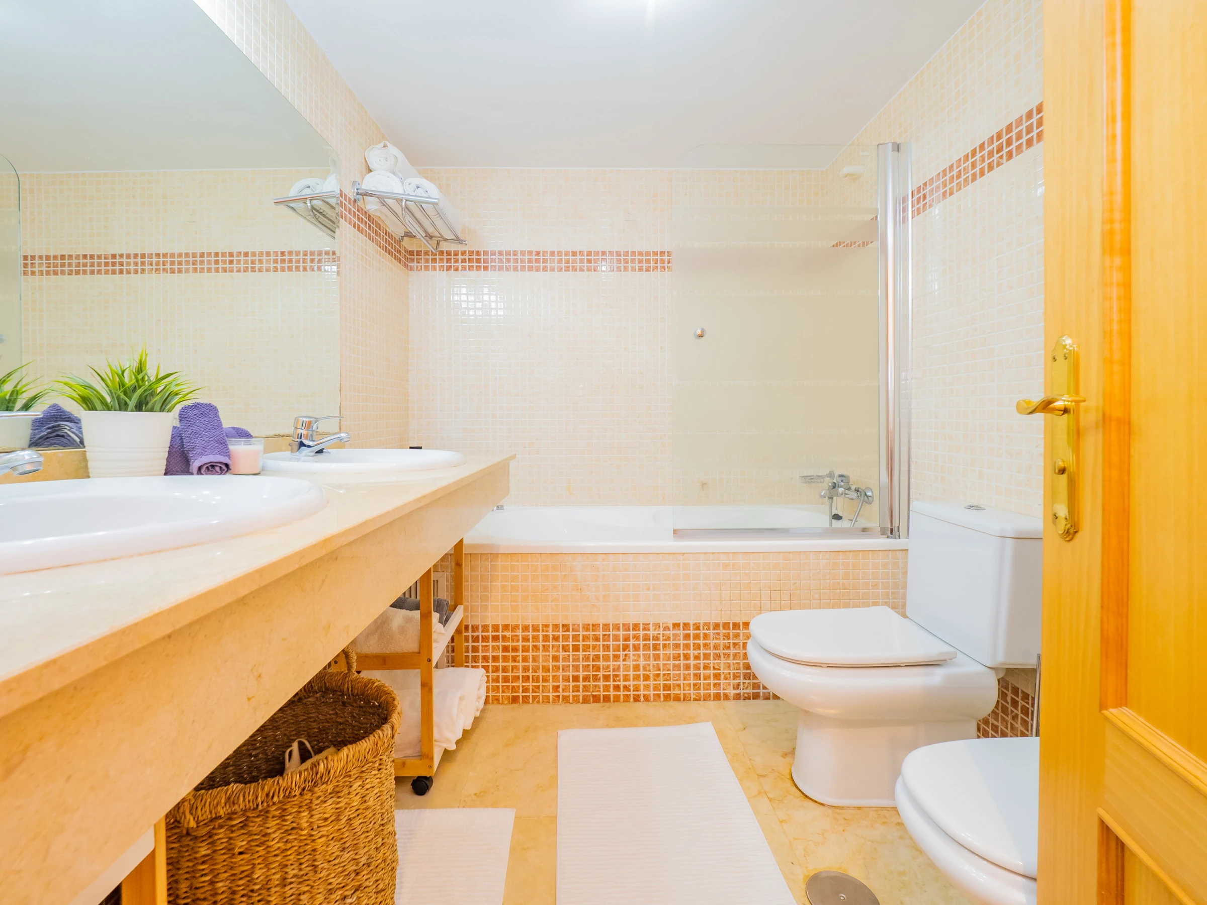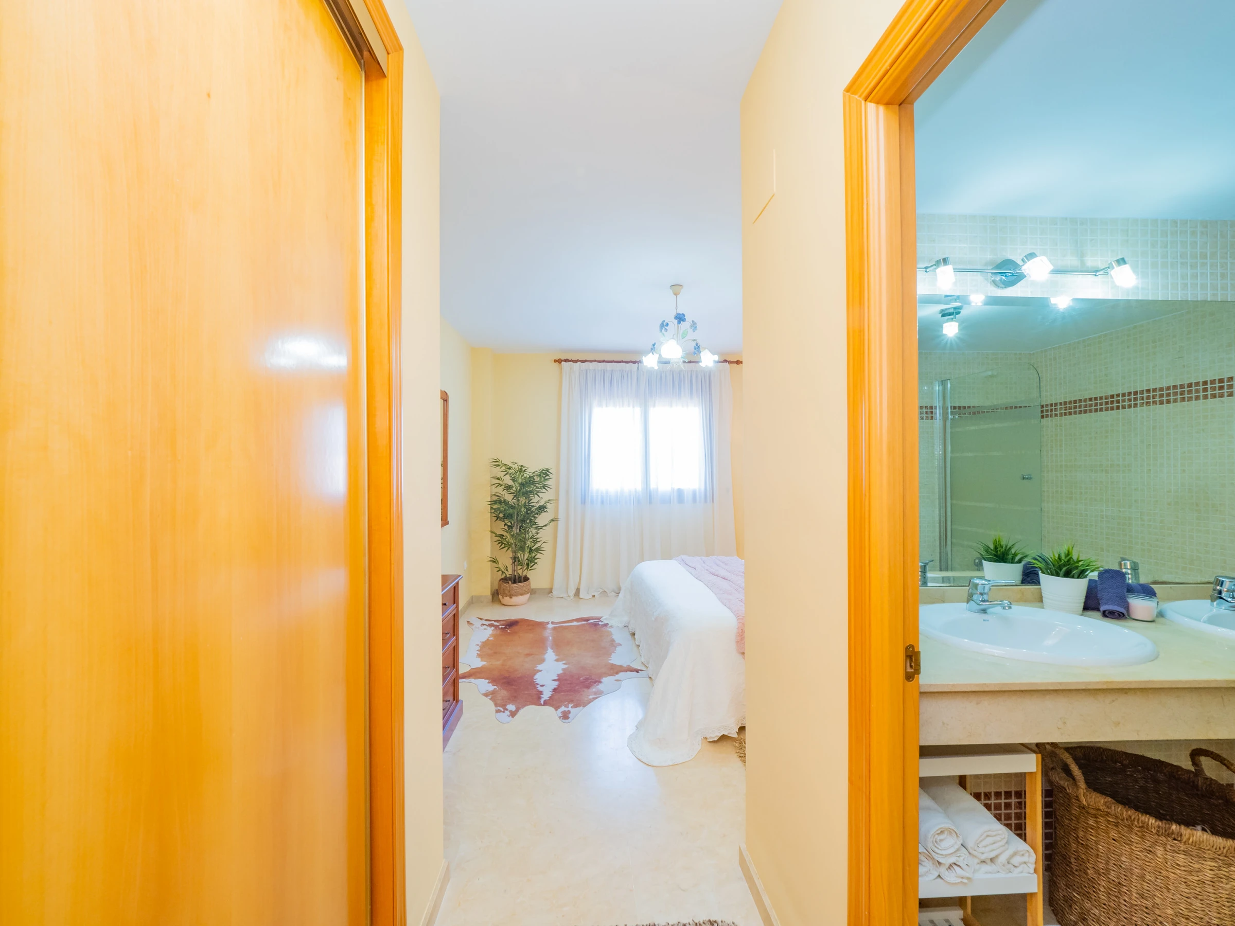 El apartamento dispone de dos dormitorios con capacidad para 4 personas: uno con cama de matrimonio y televisión, y otro con dos camas individuales. Ambos dormitorios tienen ventanas al exterior y suficiente espacio para guardar el equipaje. El baño completo incluye bañera. El aire acondicionado centralizado garantiza confort durante todo el año. Además, el alojamiento tiene wifi y una plaza de parking cubierta incluida en el mismo edificio.