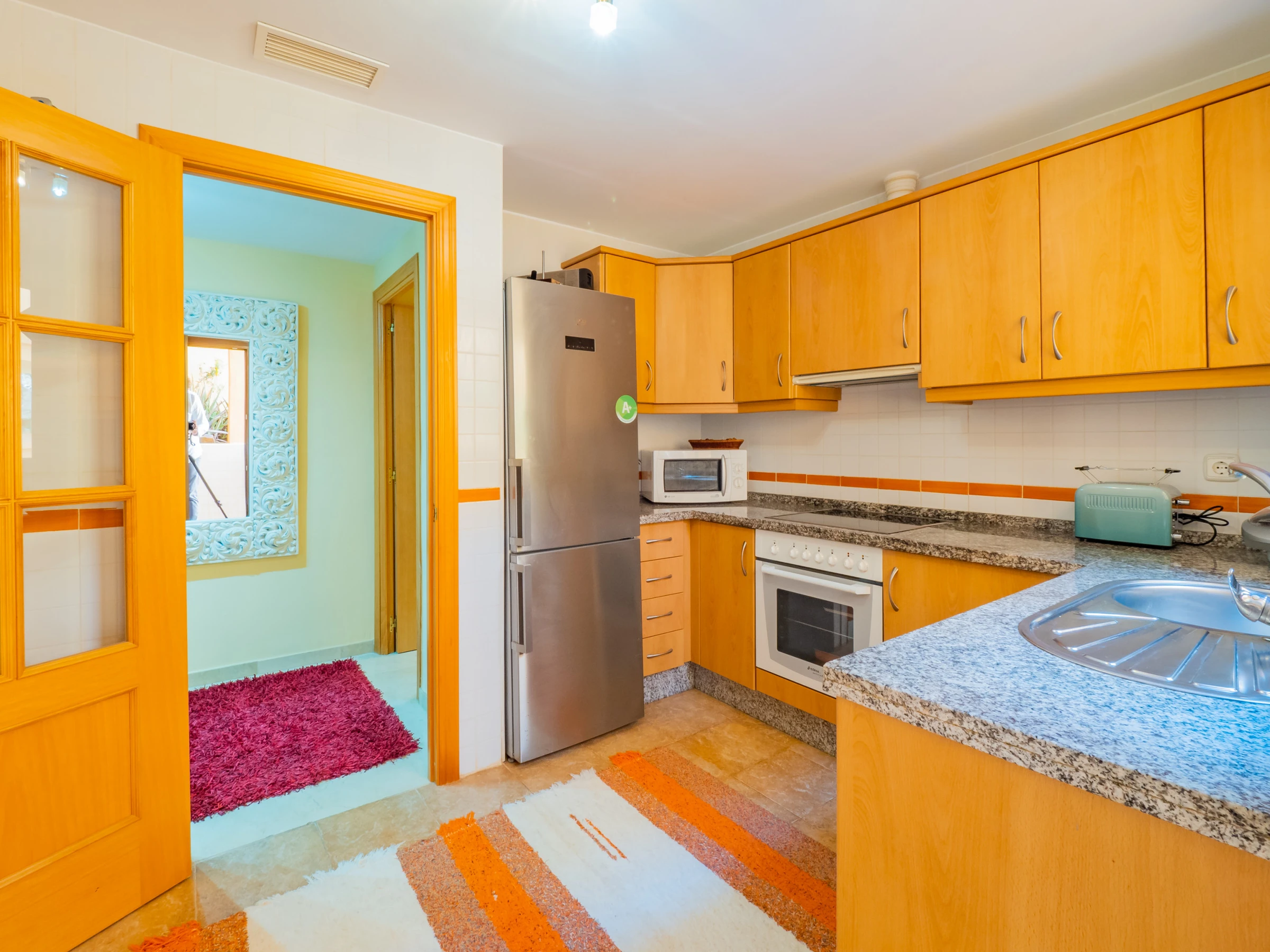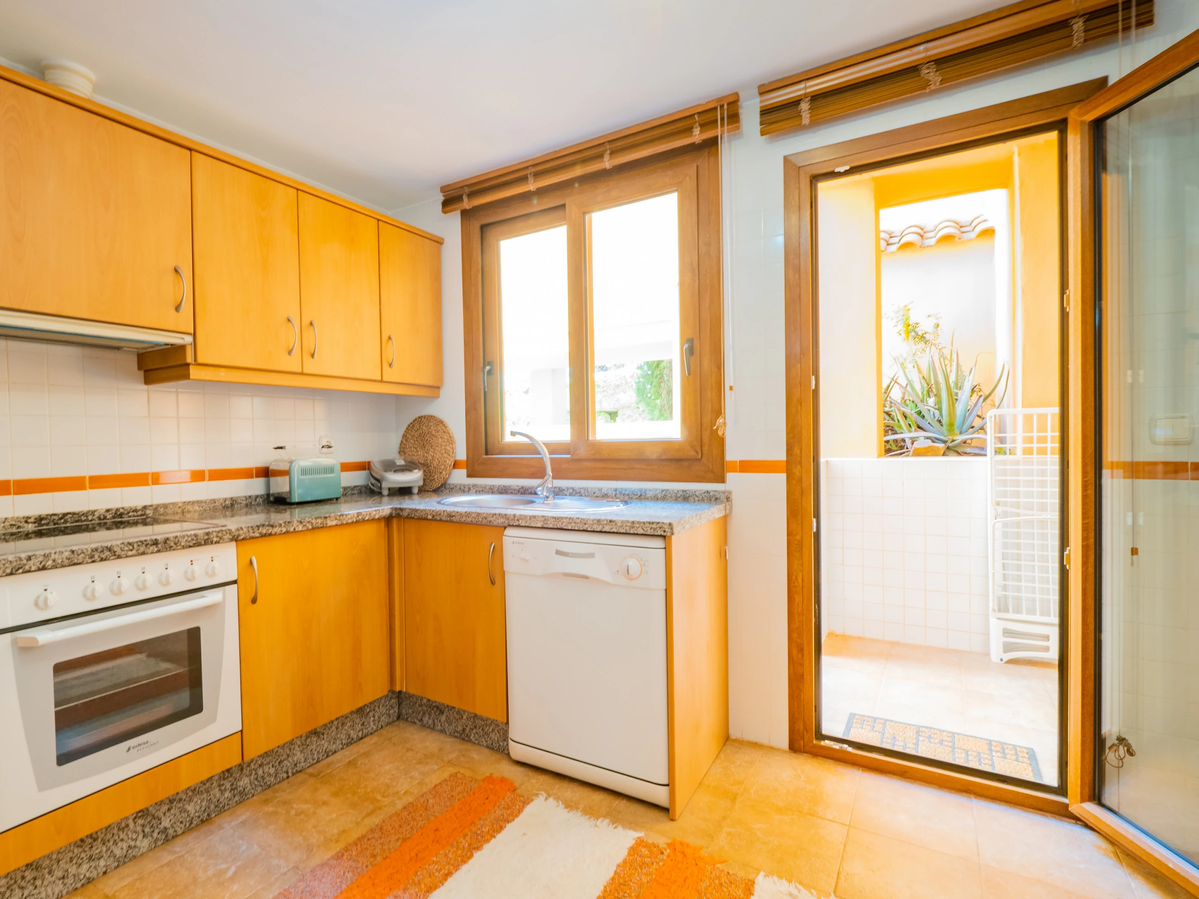 El interior cuenta con un salón comedor elegante y funcional, con dos zonas diferenciadas: un espacio de descanso con cómodos sofás y televisión, y una zona de comedor con una gran mesa de madera. La cocina independiente está totalmente equipada con electrodomésticos modernos: vitrocerámica, nevera combi, microondas, horno, congelador, lavadora, lavavajillas, cafetera, tostadora, hervidor y exprimidor, además de acceso a un patio interior que aporta luz natural.