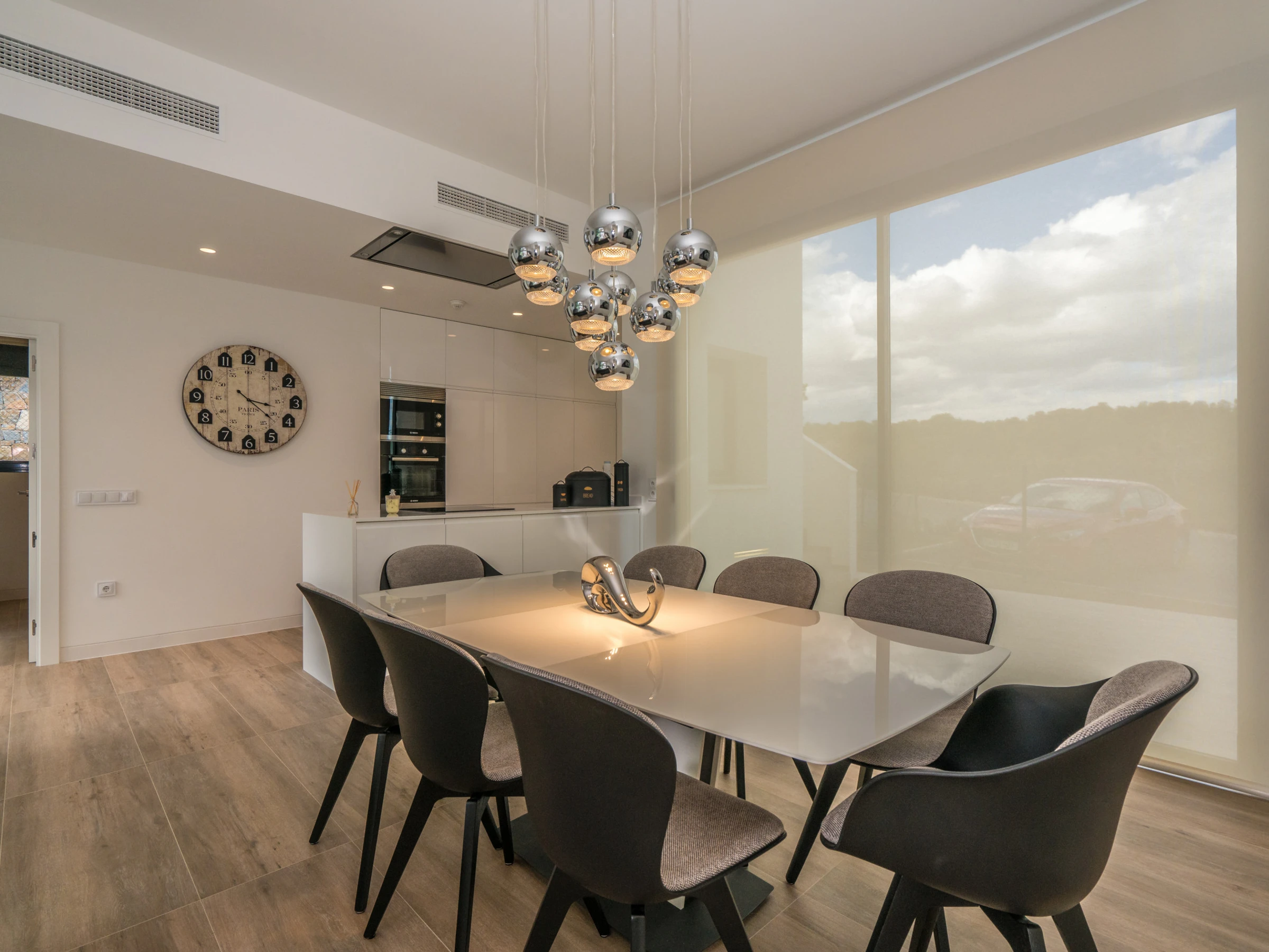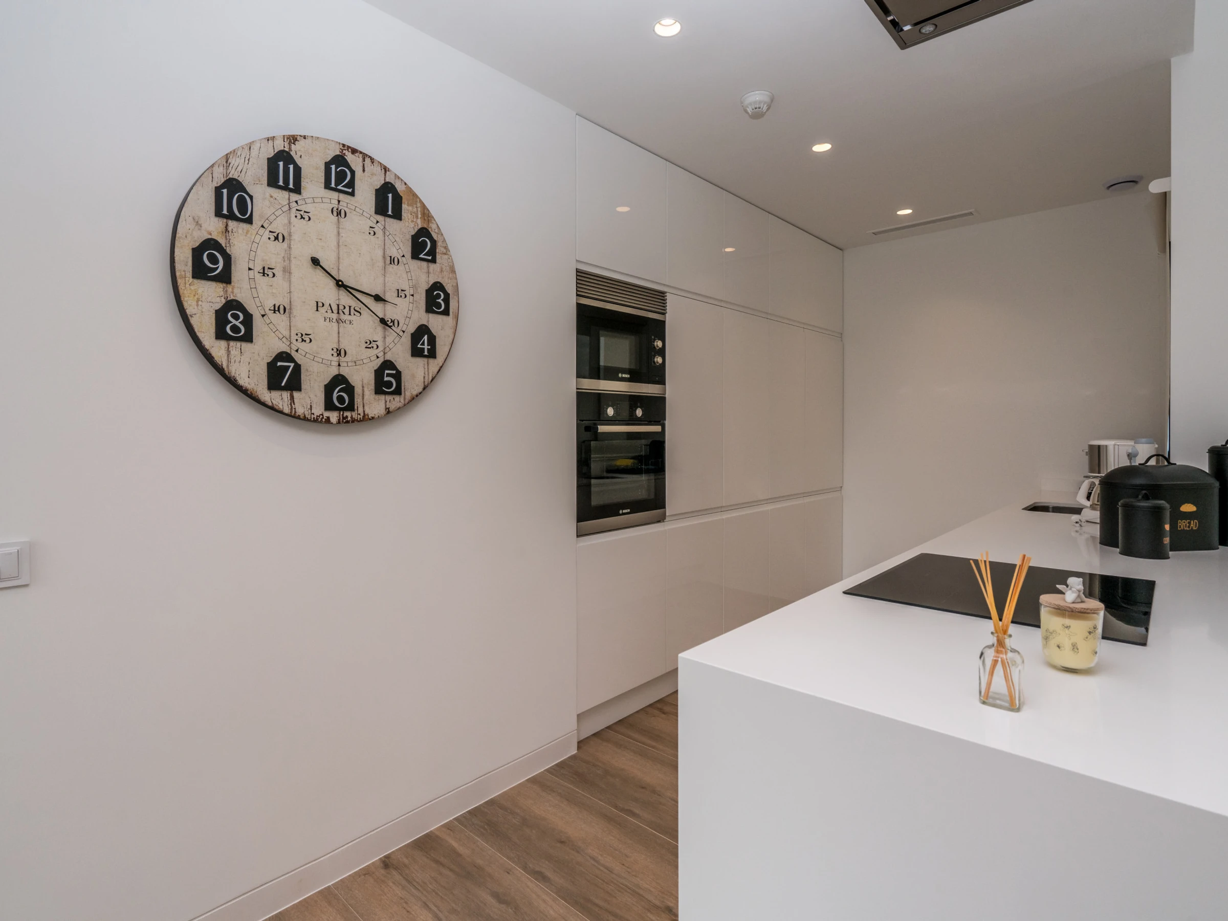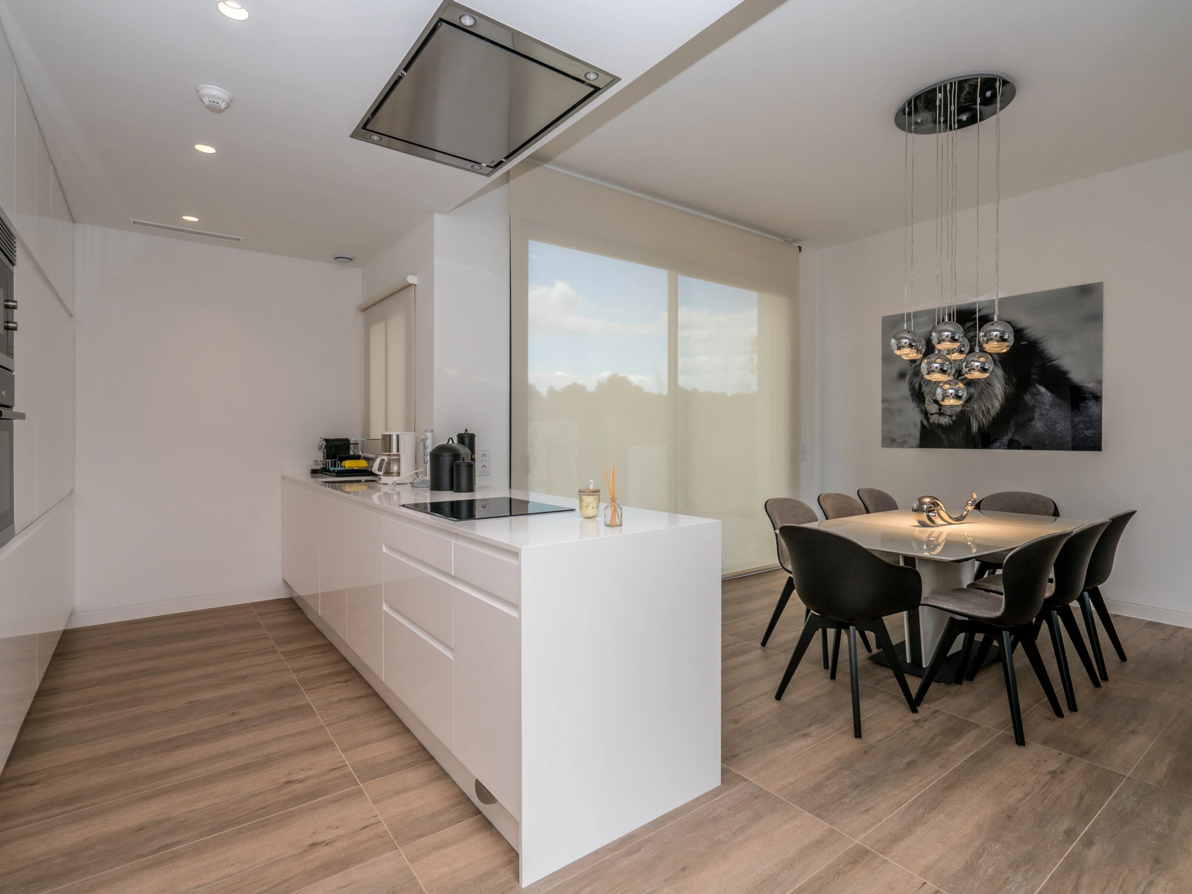 cocina americana con cocina de inducción, horno eléctrico, microondas, lavavajillas, frigorífico, congelador, cafetera, calentador de agua y tostador