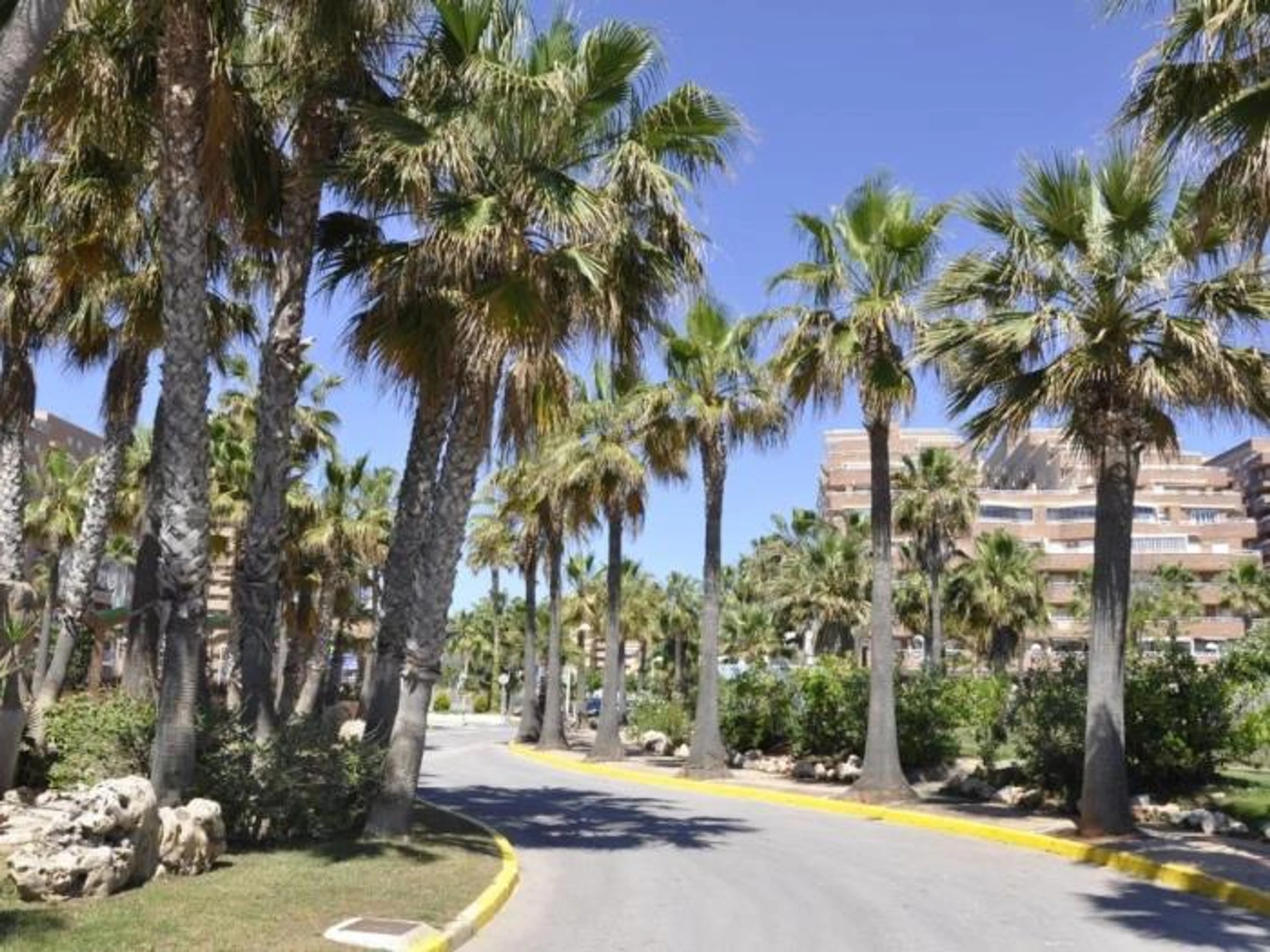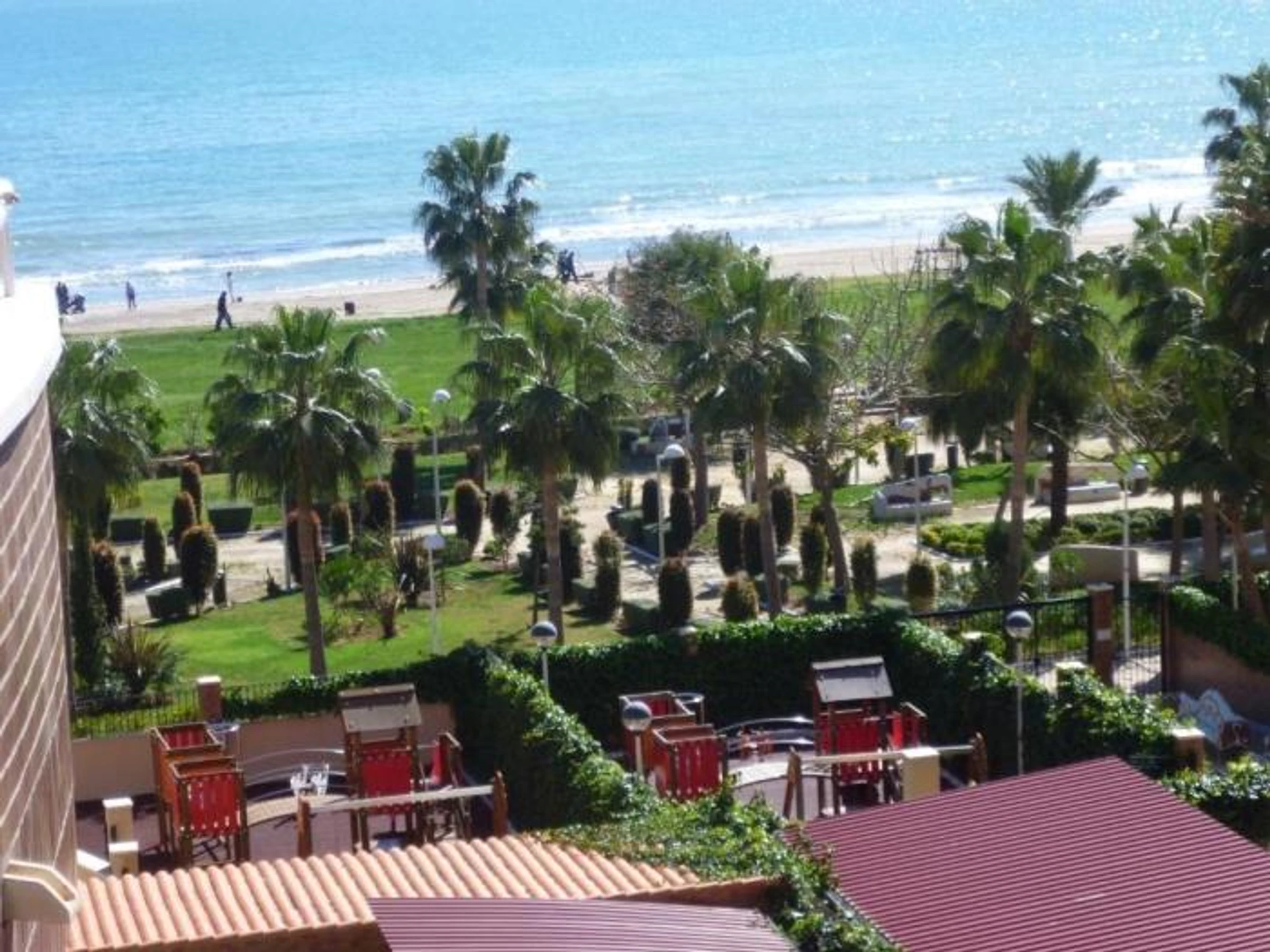 Conjunto de varios bloques de apartamentos repartidos en 1a línea de playa con vista lateral al mar. Tienen: salón-comedor con sofá-cama, 2 dormitorios dobles, cocina, baño completo y terraza. y aire acondicionado.