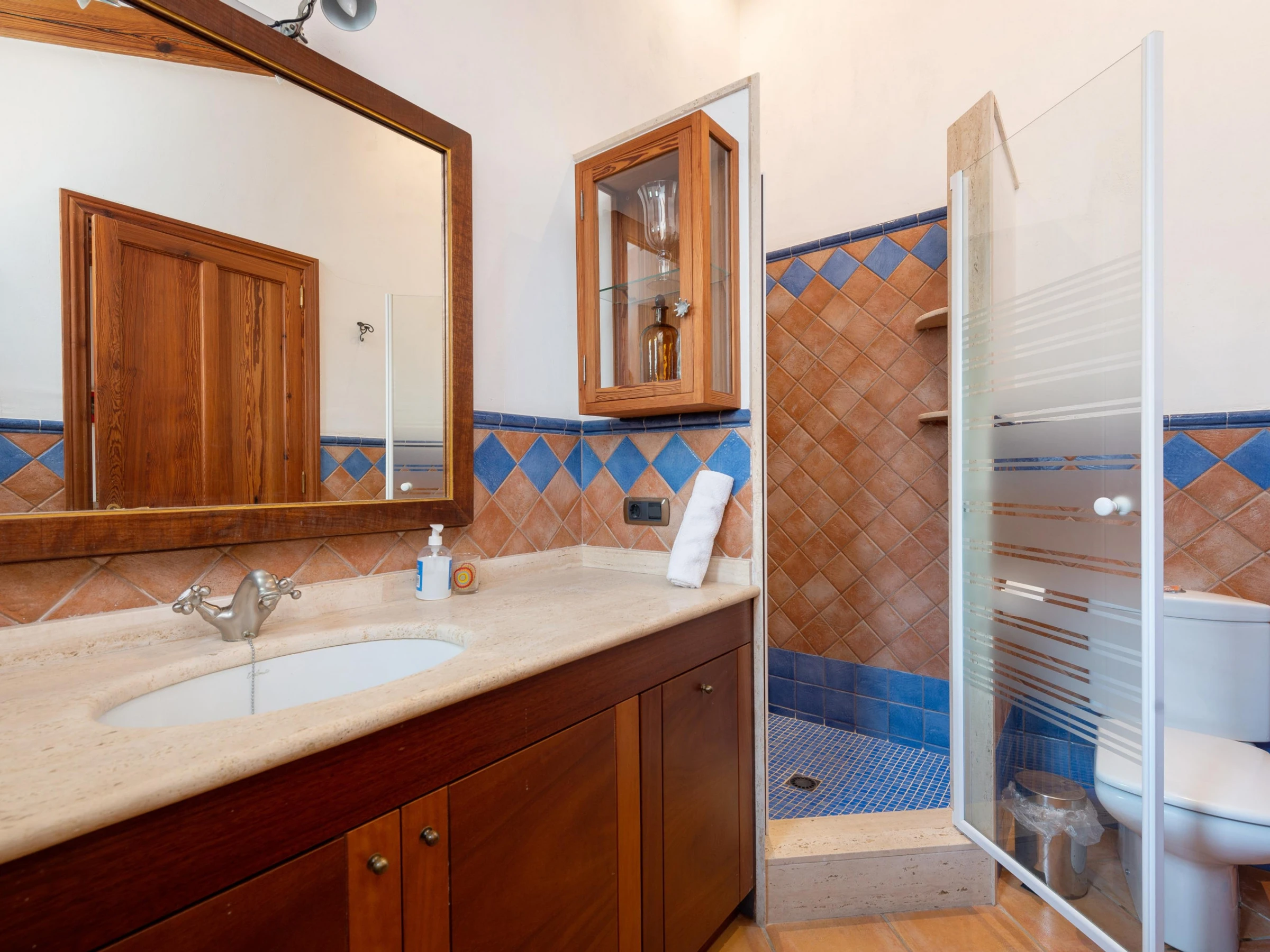 El interior de la casa destaca por su decoración rústica y se divide en dos plantas. En la planta baja se encuentra una amplia zona que abarca la cocina de gas, con todos los utensilios que pueda necesitar para cocinar como en su casa, así como una mesa con sillas; la zona del salón donde pueden ver la TV y descansar en sus confortables sofás; y la zona del comedor, con una gran mesa para que disfrute de las comidas cómodamente. La lavandería independiente consta de lavadora, plancha y tabla de planchar. En esta planta hay dos dormitorios con AC: uno con una cama de matrimonio y baño con ducha en suite , y otro con un cama nido; y un baño con bañera. En la primera planta hay tres dormitorios con una cama de matrimonio y un baño con ducha en suite cada uno. Dos de ellos cuentan también con AC. Si viaja con un bebé le facilitaremos una cuna y una trona. Finalmente, la casa esta equipada con suelo radiante para la temporada de invierno.