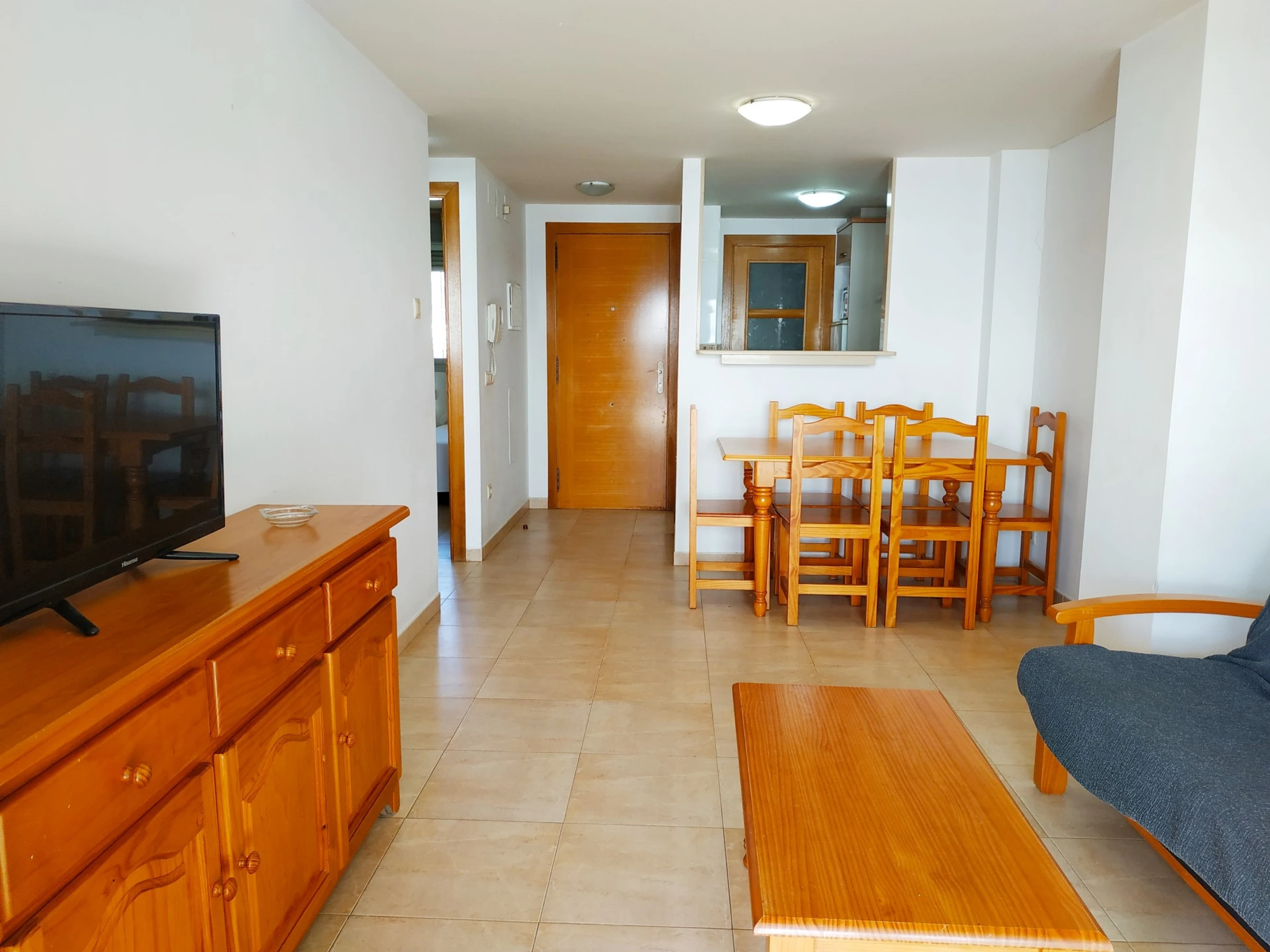 Cuentan con dos dormitorios bien distribuidos: uno con cama matrimonial y otro con dos camas individuales, además de un sofá cama que permite alojar cómodamente a toda la familia. La cocina americana está completamente equipada con electrodomésticos como nevera, lavadora, horno, microondas y cafetera, facilitando la preparación de comidas durante tu estancia.