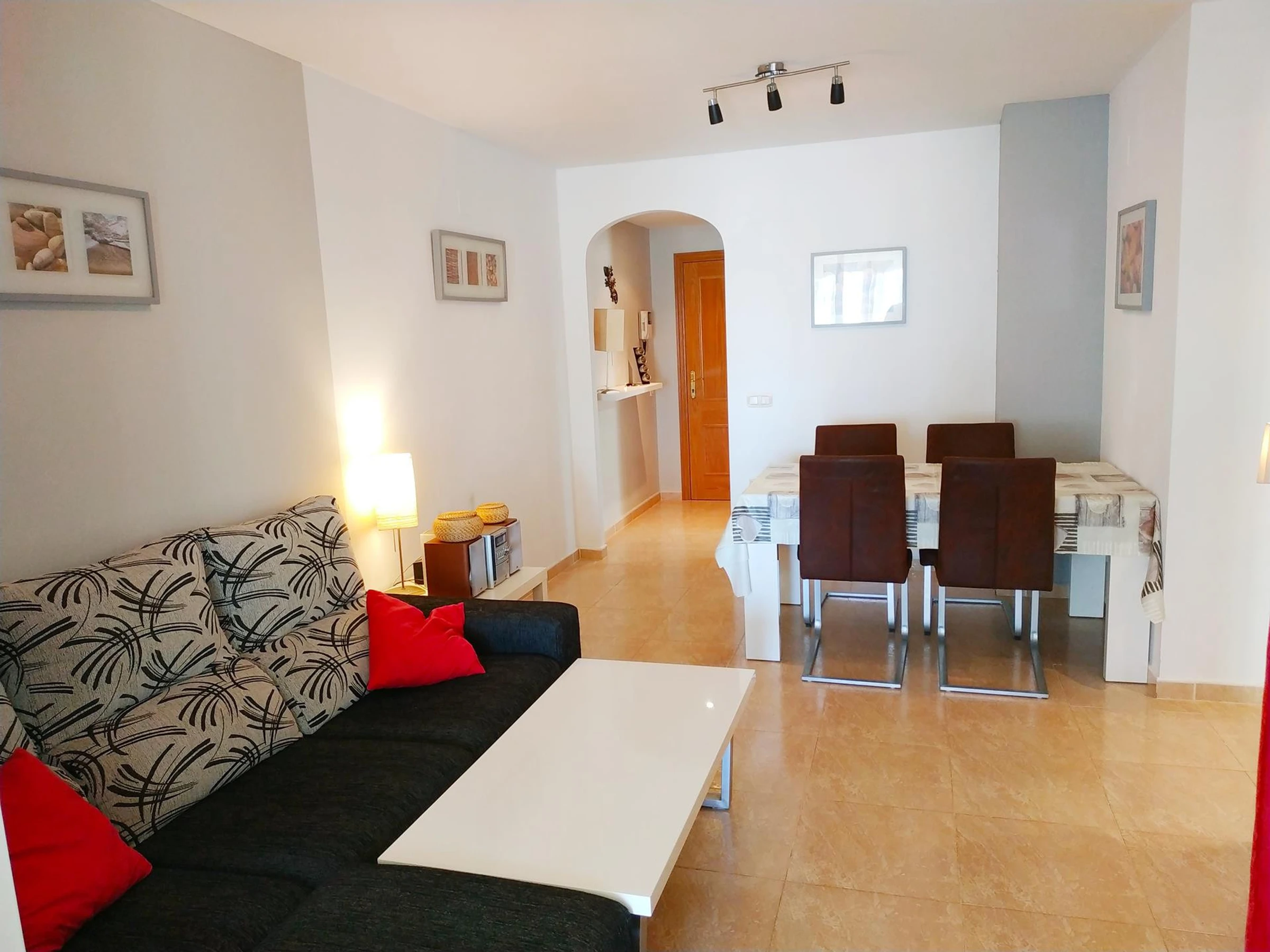 El apartamento dispone de dos dormitorios con una distribución cómoda: una cama doble y dos camas individuales. Cuenta con dos baños, uno con ducha y otro con bañera, lo que garantiza comodidad y privacidad para todos los huéspedes. La cocina totalmente equipada incluye electrodomésticos como nevera, lavadora, horno, microondas, lavavajillas y cafetera, permitiéndote preparar comidas deliciosas durante tu estancia.